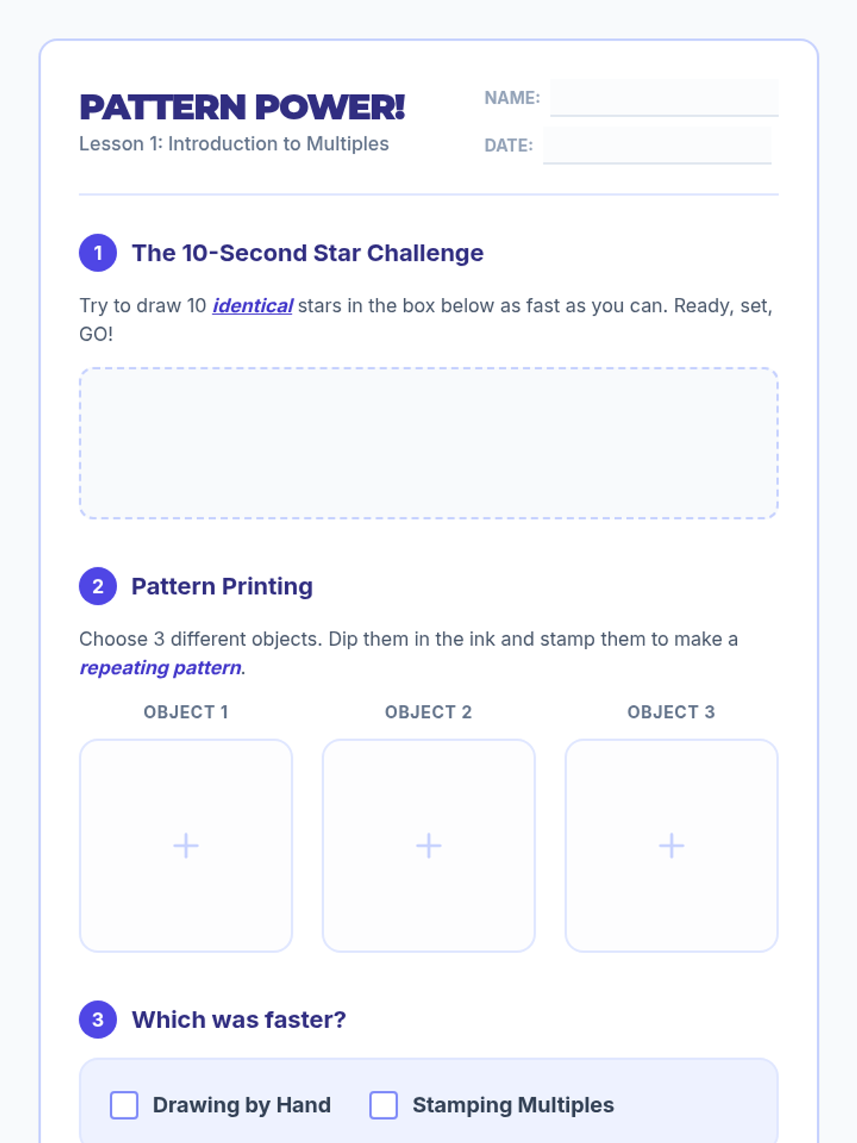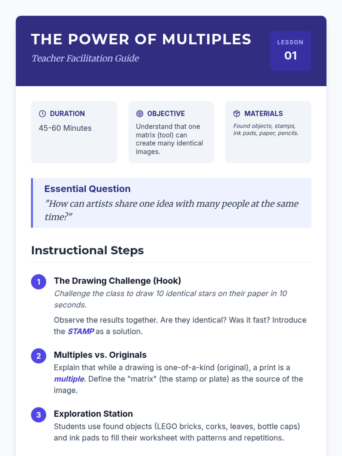 A comprehensive introduction to relief printmaking for 2nd graders, moving from basic stamping to creating and signing a numbered edition of foam-plate prints.