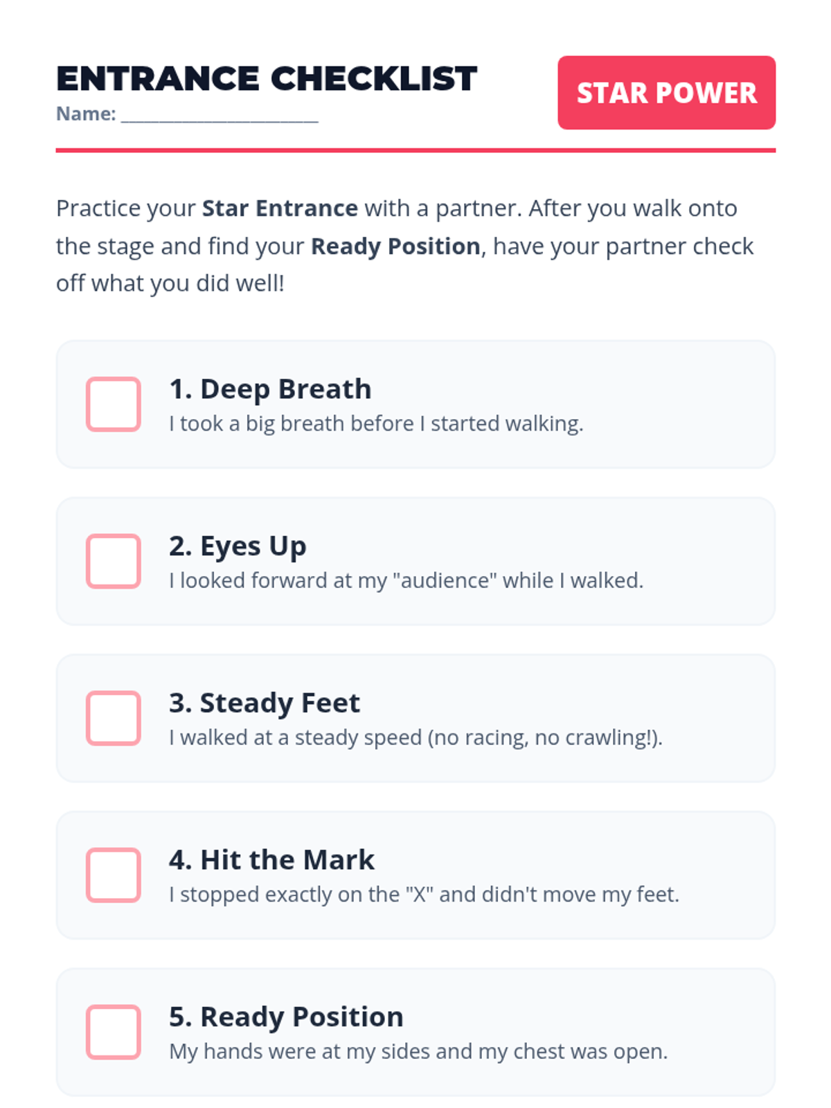 A comprehensive sequence for 2nd graders on stage presence, performance etiquette, and vocal performance confidence, moving from the initial entrance to the final bow.