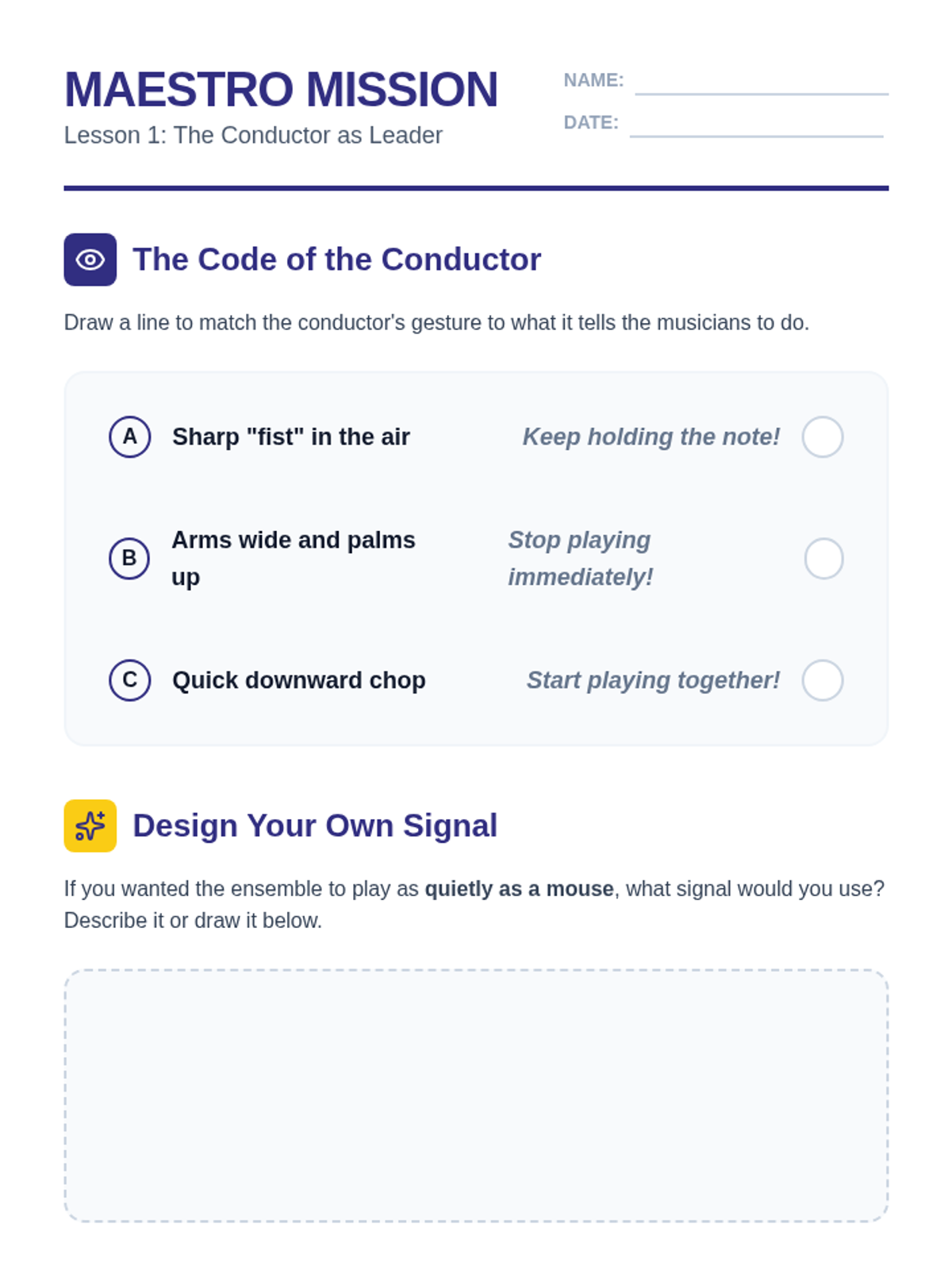 This sequence explores how musicians work together as an ensemble, focusing on conducting cues, dynamic control, balance, and tempo maintenance. Students transition from following a leader to collaborating in small independent groups.