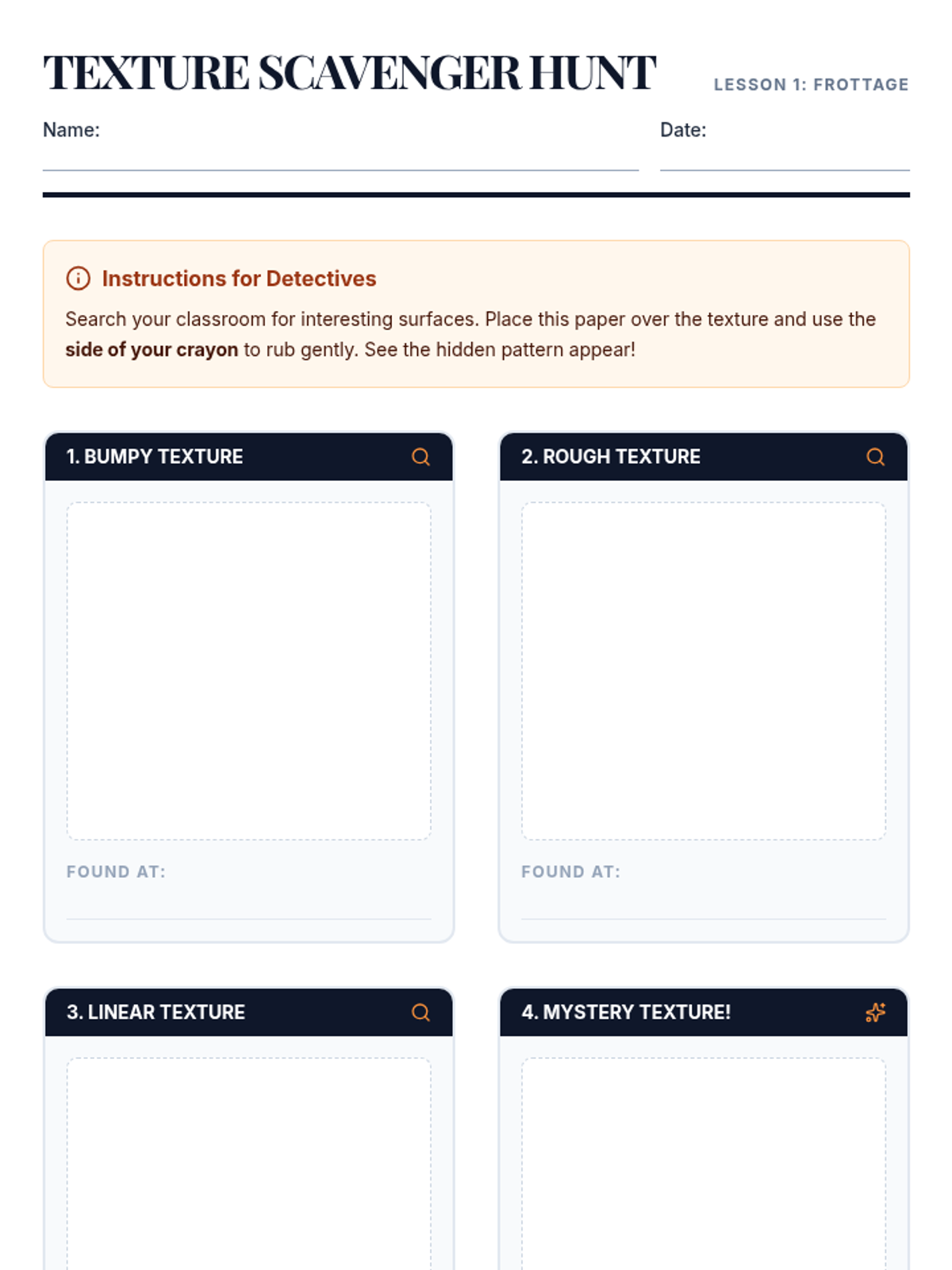 A 5-lesson sequence for 2nd graders exploring tactile textures through frottage, collagraphy, and monoprinting. Students investigate classroom textures, build printing plates from found materials, and experiment with ink transfer techniques.