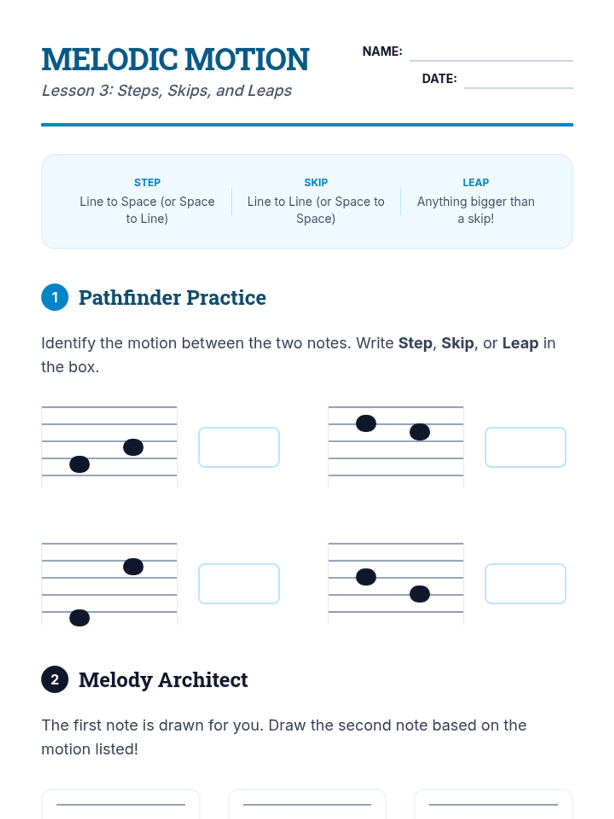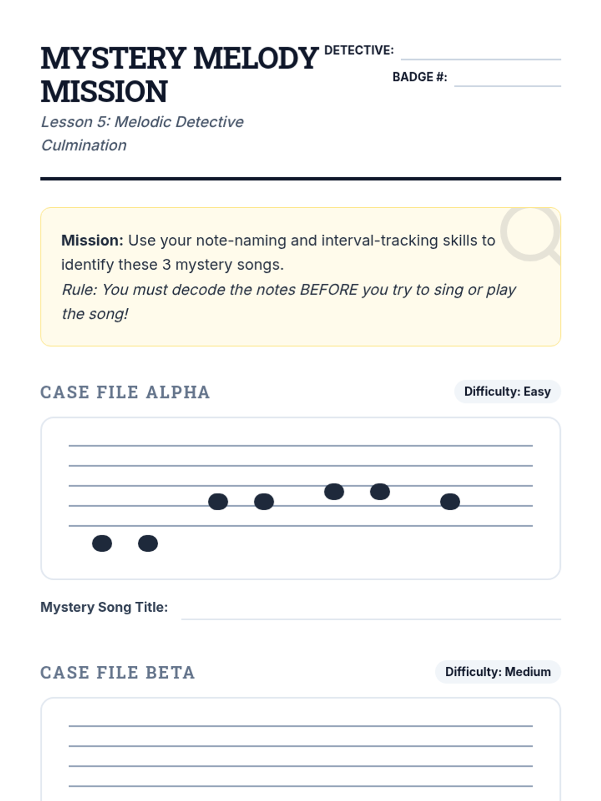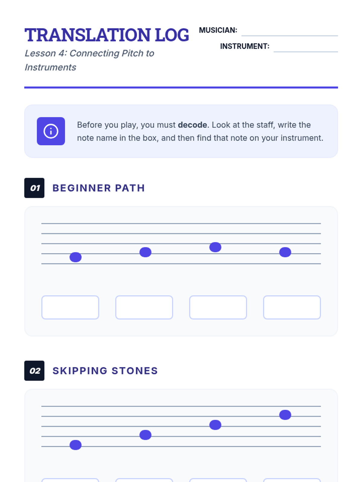 A comprehensive sequence for 4th-grade music students to master reading pitch on the treble clef staff. Students progress from basic staff geography to identifying notes, recognizing intervals, and finally sight-reading simple melodies on instruments.