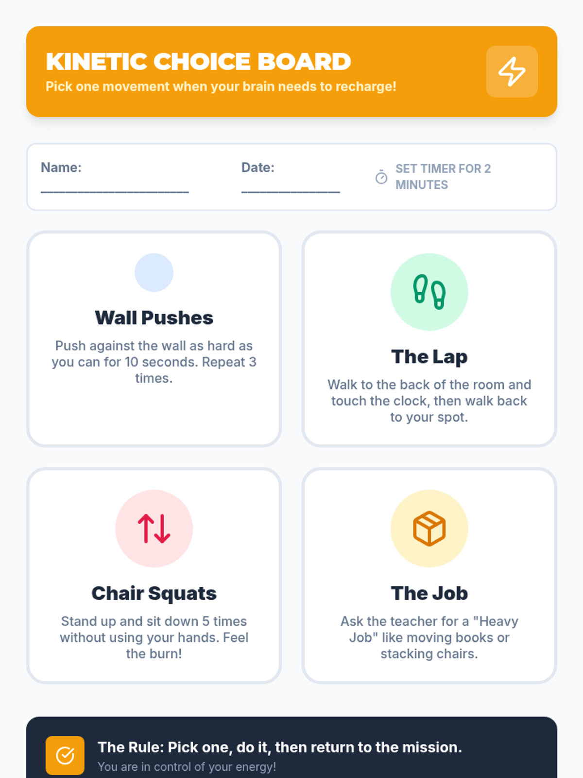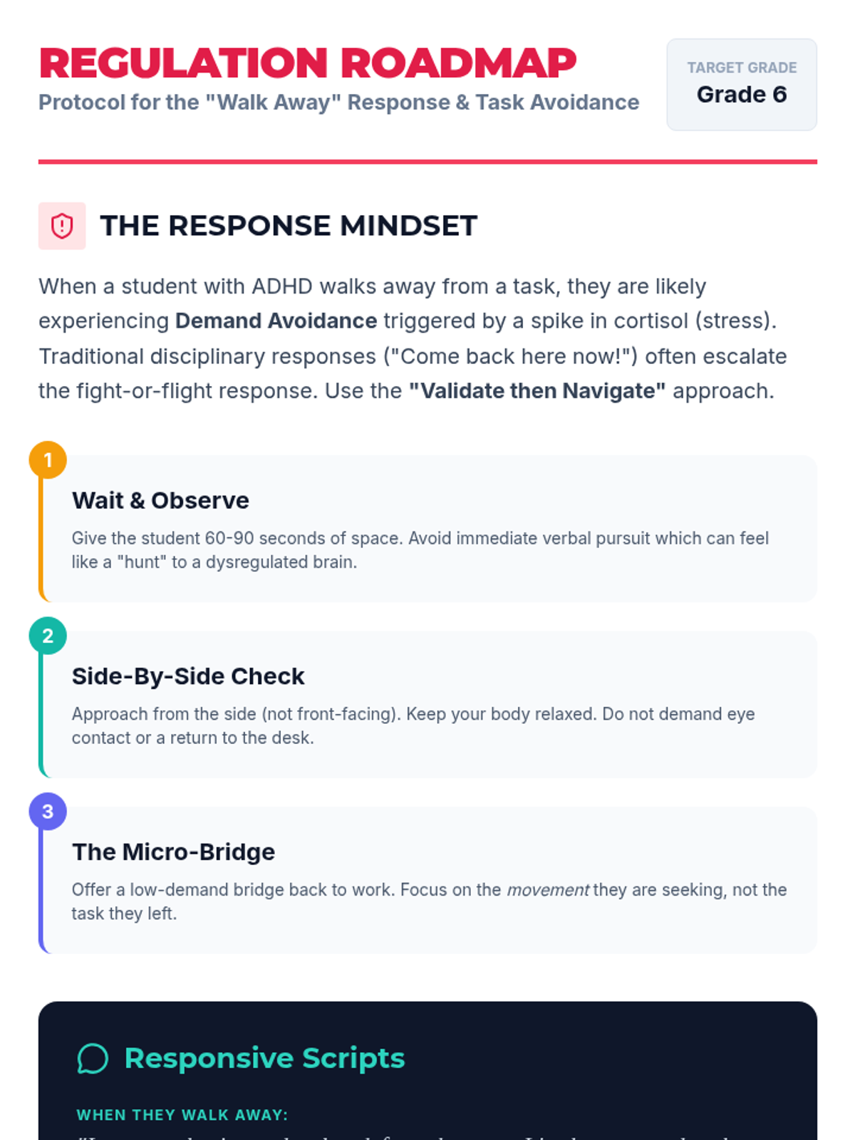 A specialized support framework for educators managing high-energy, dysregulated ADHD students. This sequence provides a holistic approach to movement-based learning, demand reduction, and proactive regulation strategies for the 6th-grade classroom.