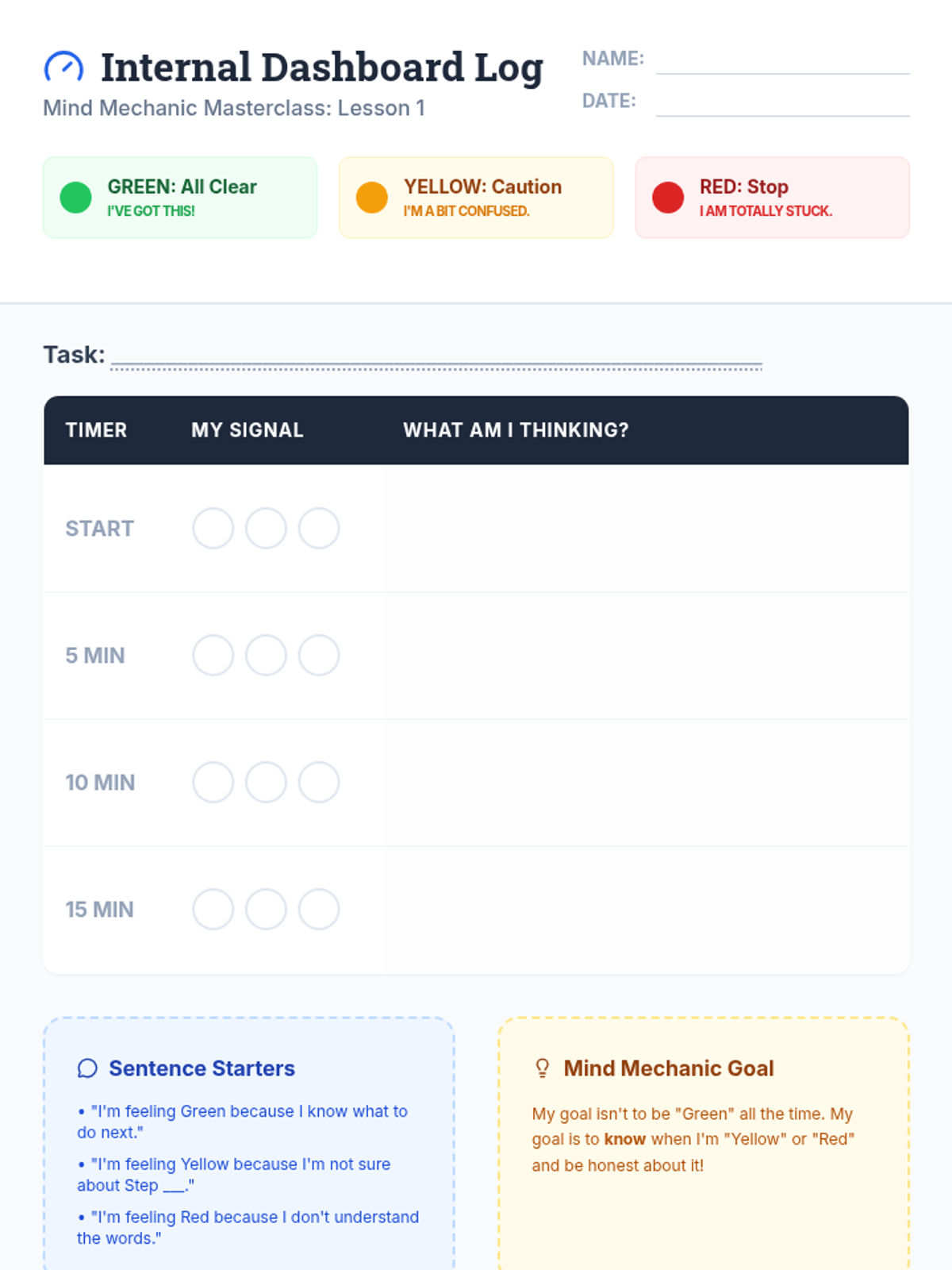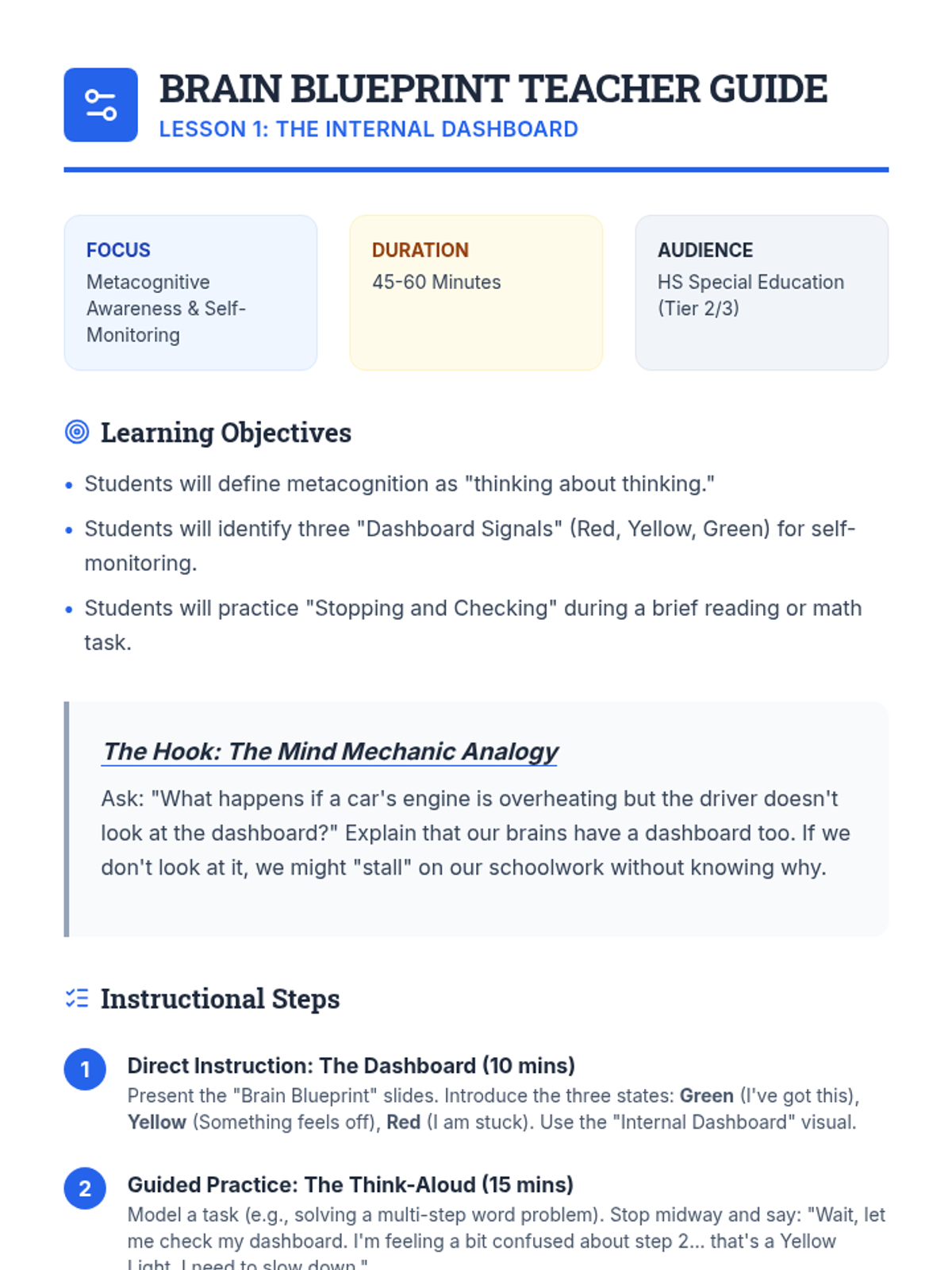 A comprehensive series of lessons designed for high school special education students to master metacognitive skills. The unit focuses on 'Mind Mechanics'—teaching students how to monitor their own thinking processes and build a personalized 'toolbox' of learning strategies.
