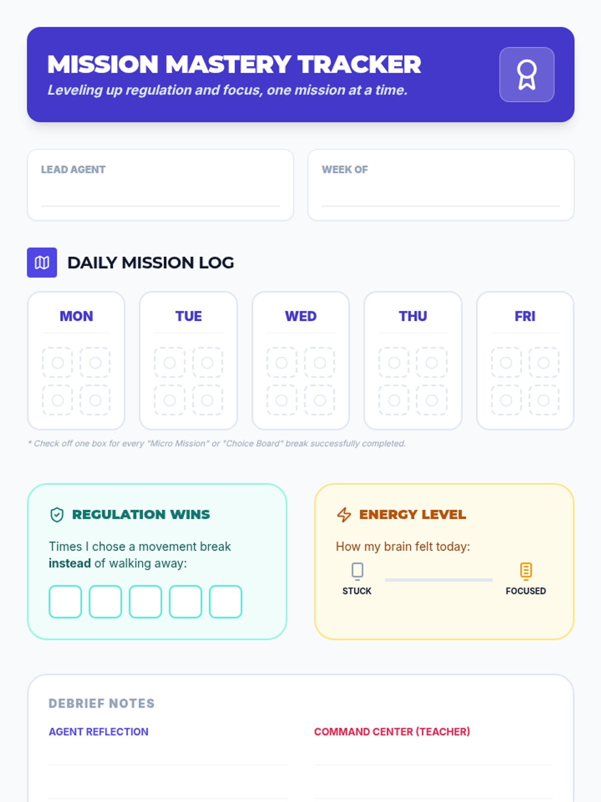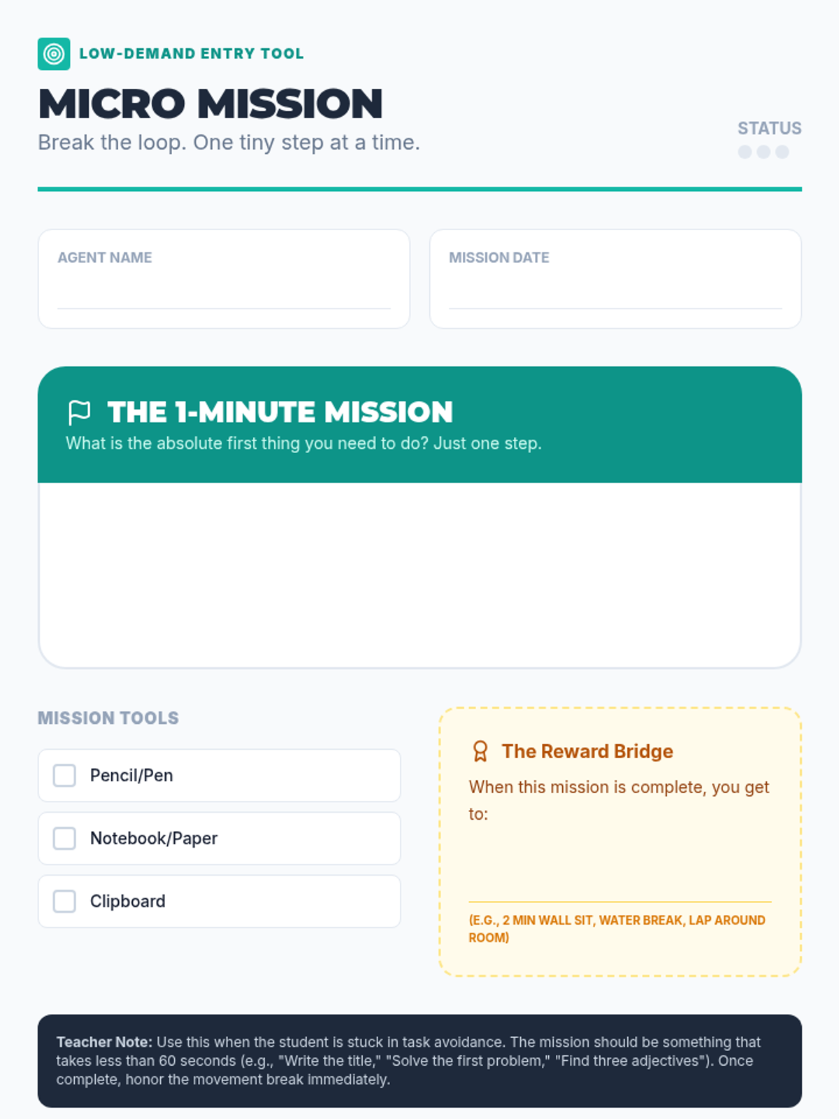 A 2-week Tier 3 intervention focused on task initiation skills using a 'Space Mission' theme. Students learn concrete strategies like the 3-2-1 countdown and pre-flight checklists to begin tasks within 2 minutes.