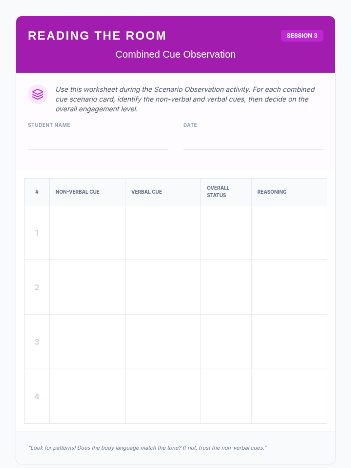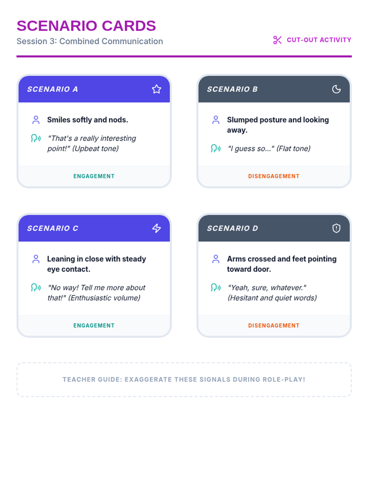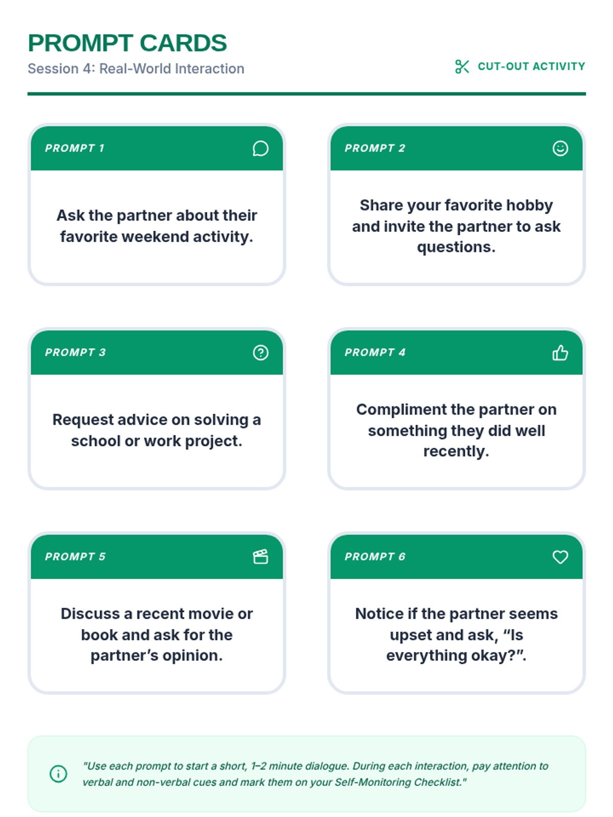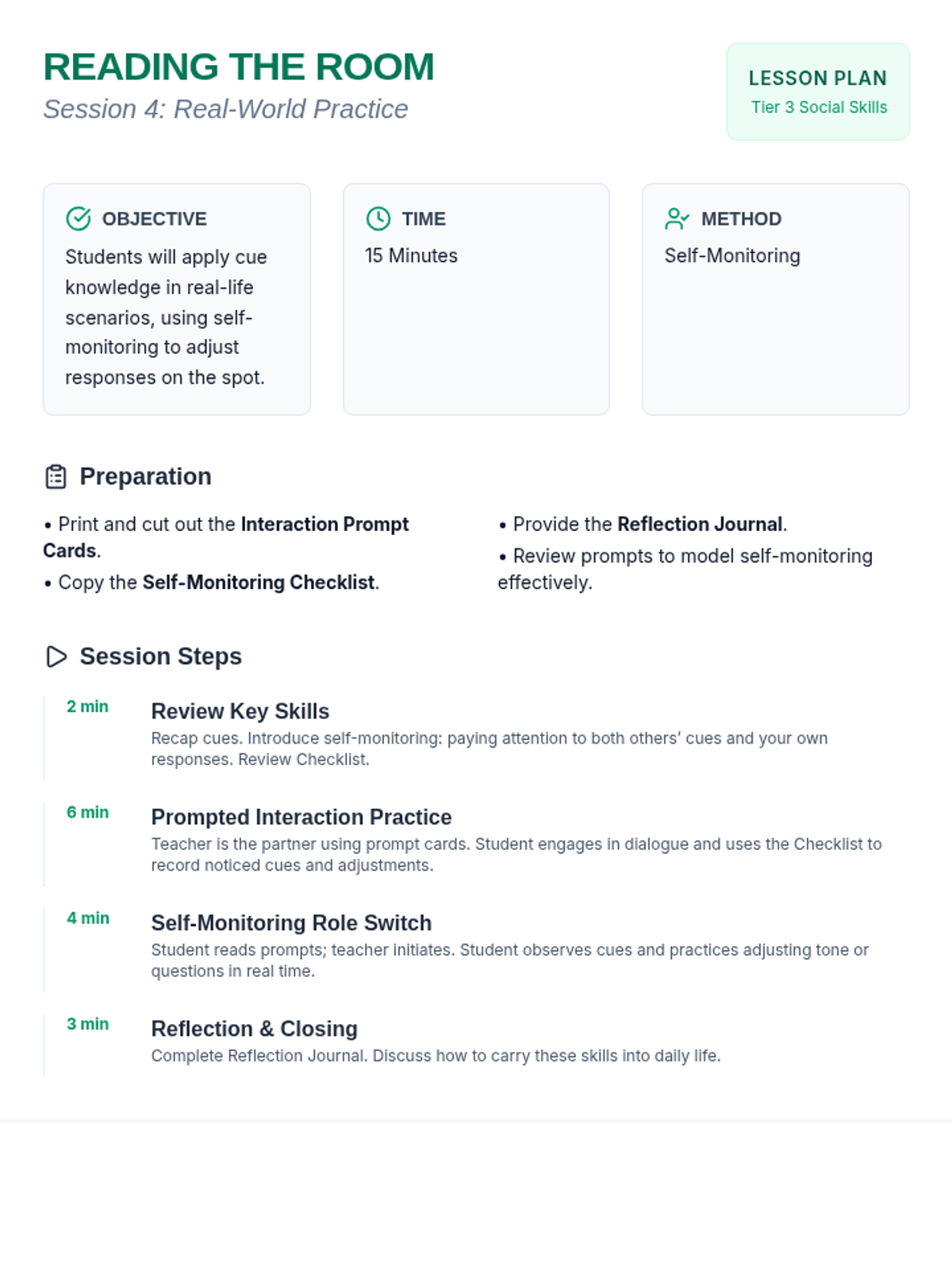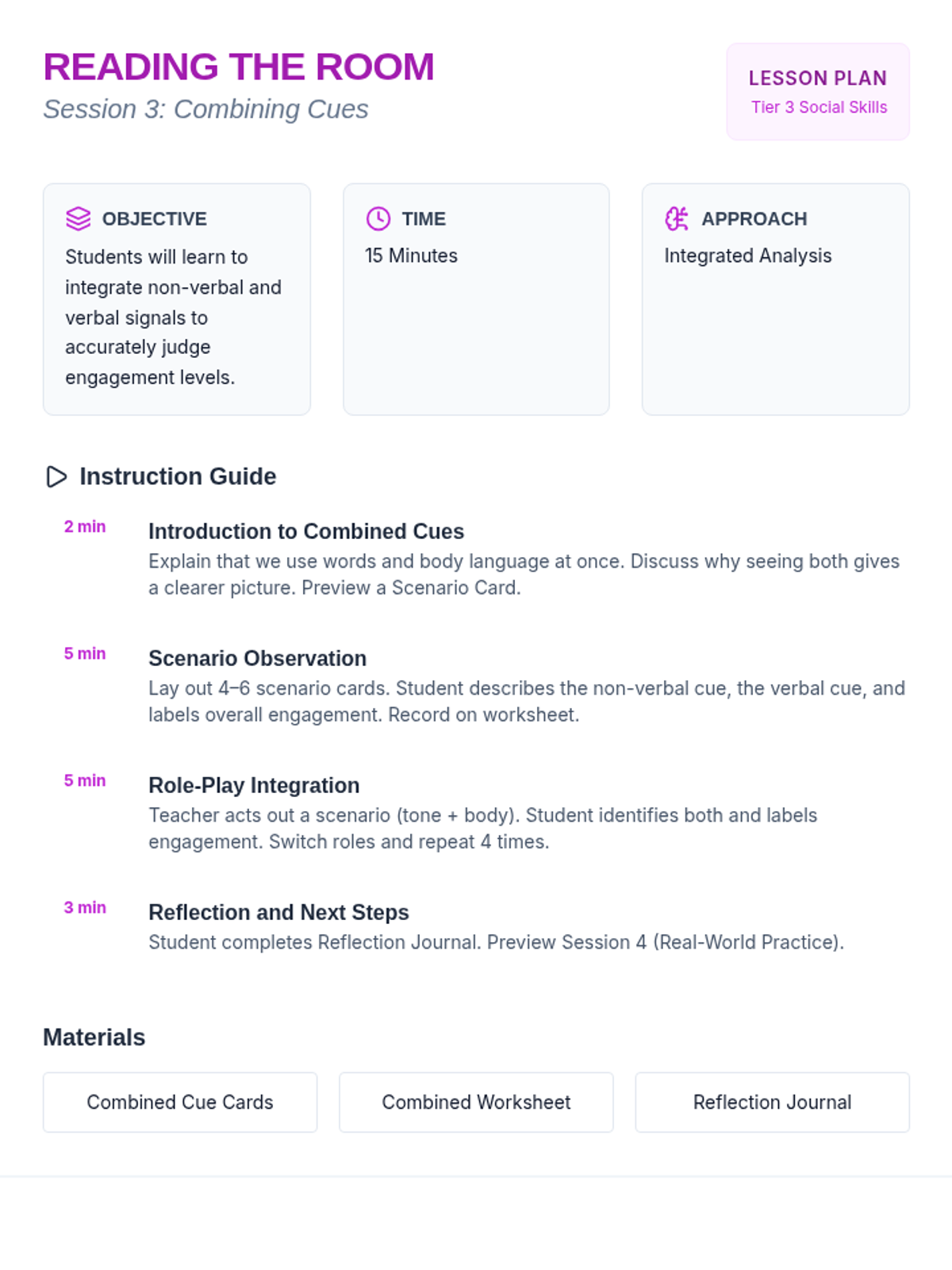 A four-session Tier 3 intervention for adults with developmental disabilities focused on recognizing and responding to verbal and non-verbal engagement cues. Students practice identifying signals of interest and boredom to improve social navigation and connection.