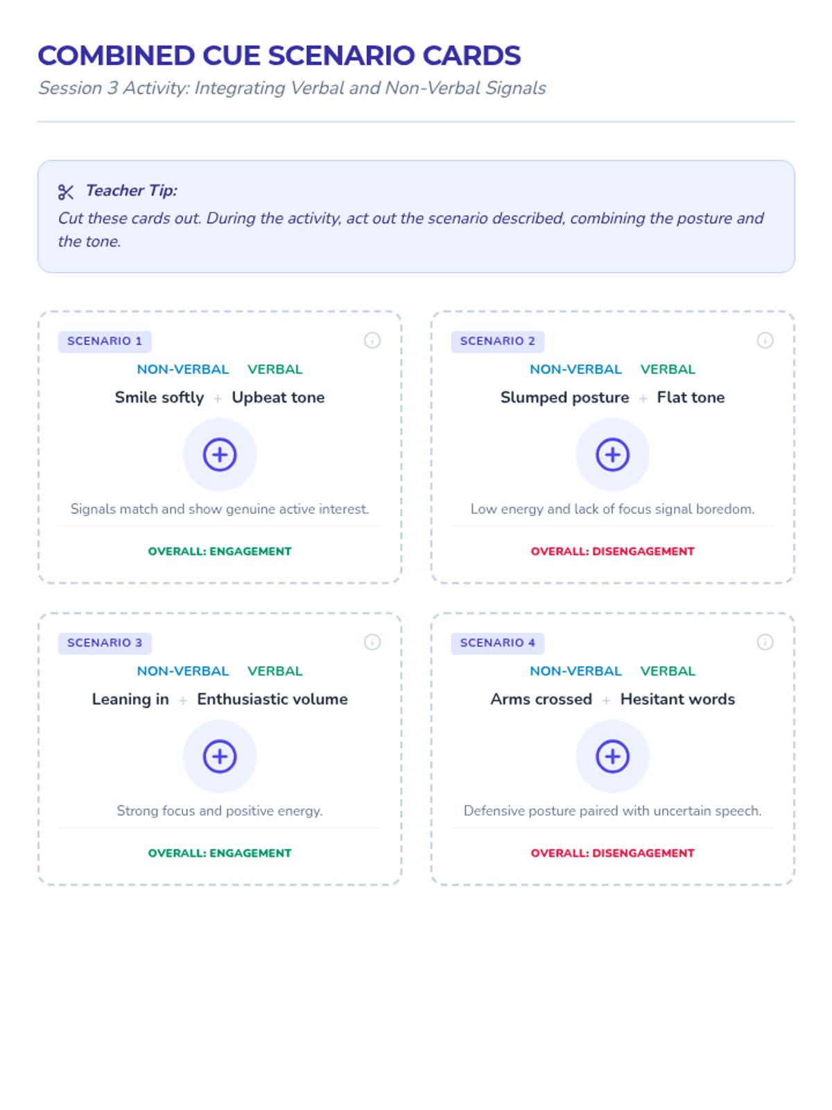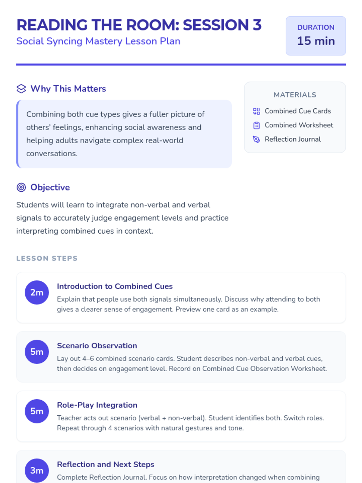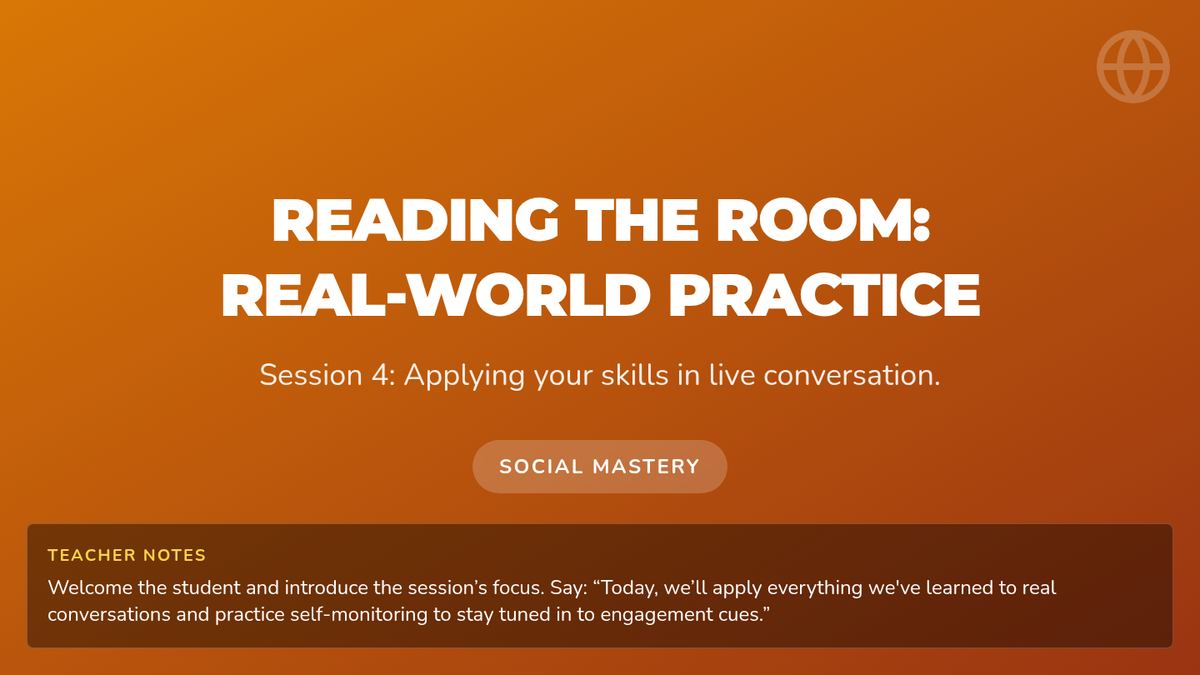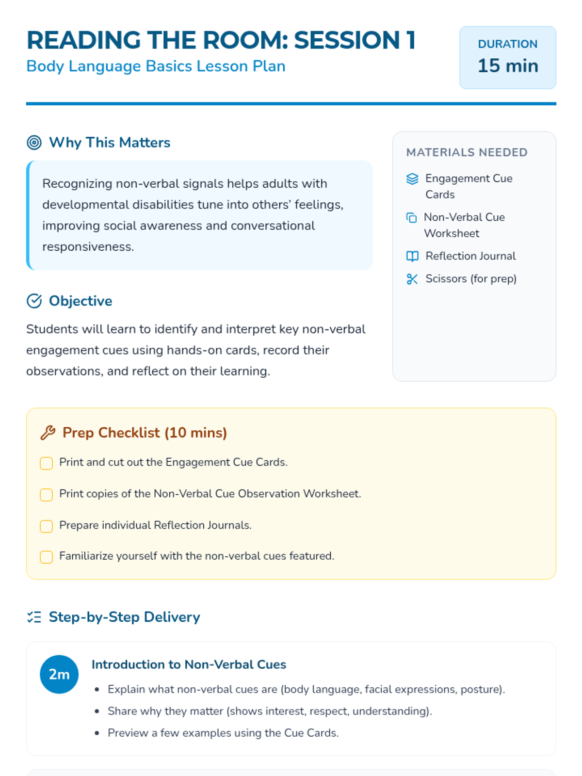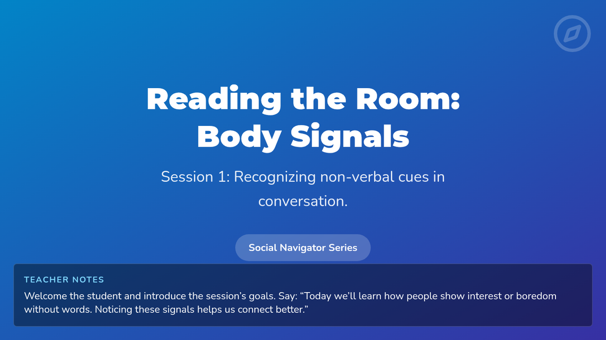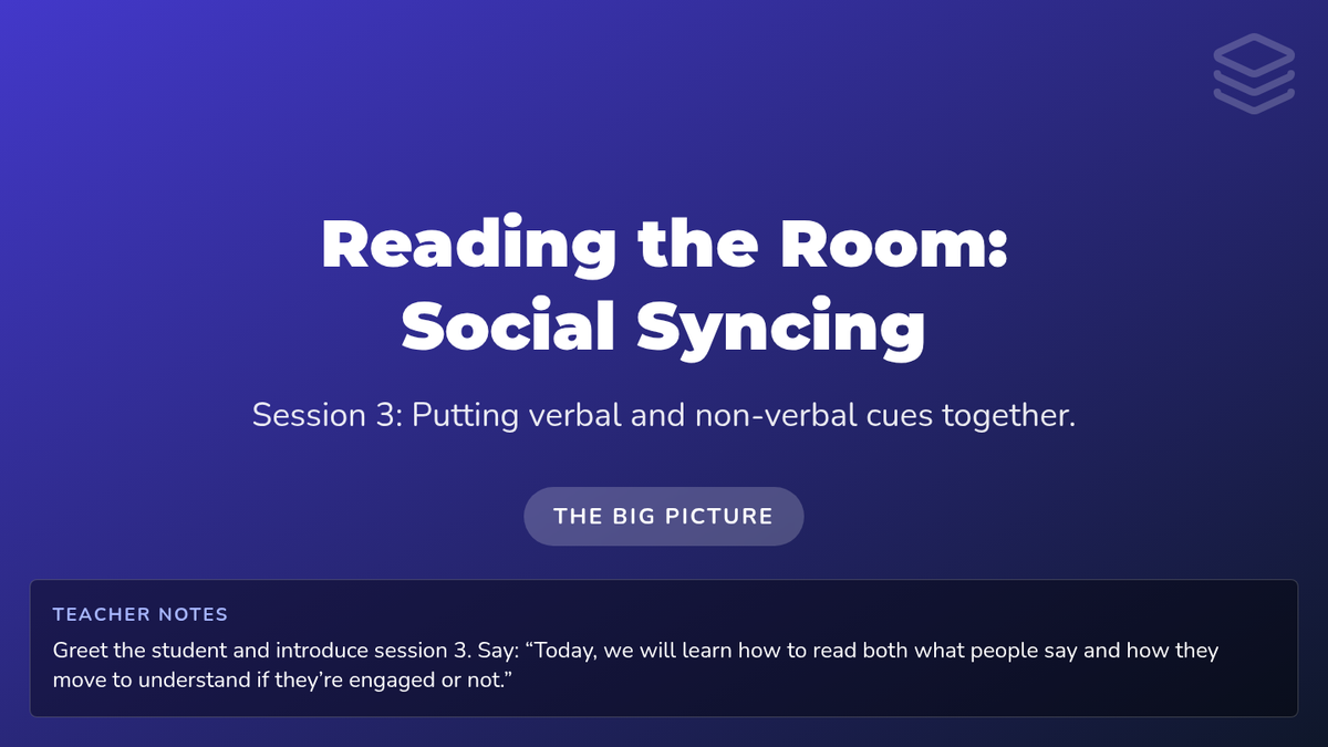 A series of four 15-minute sessions for individual learners to master recognizing verbal and non-verbal social cues. This sequence helps adults with developmental disabilities build social awareness and stronger connections.