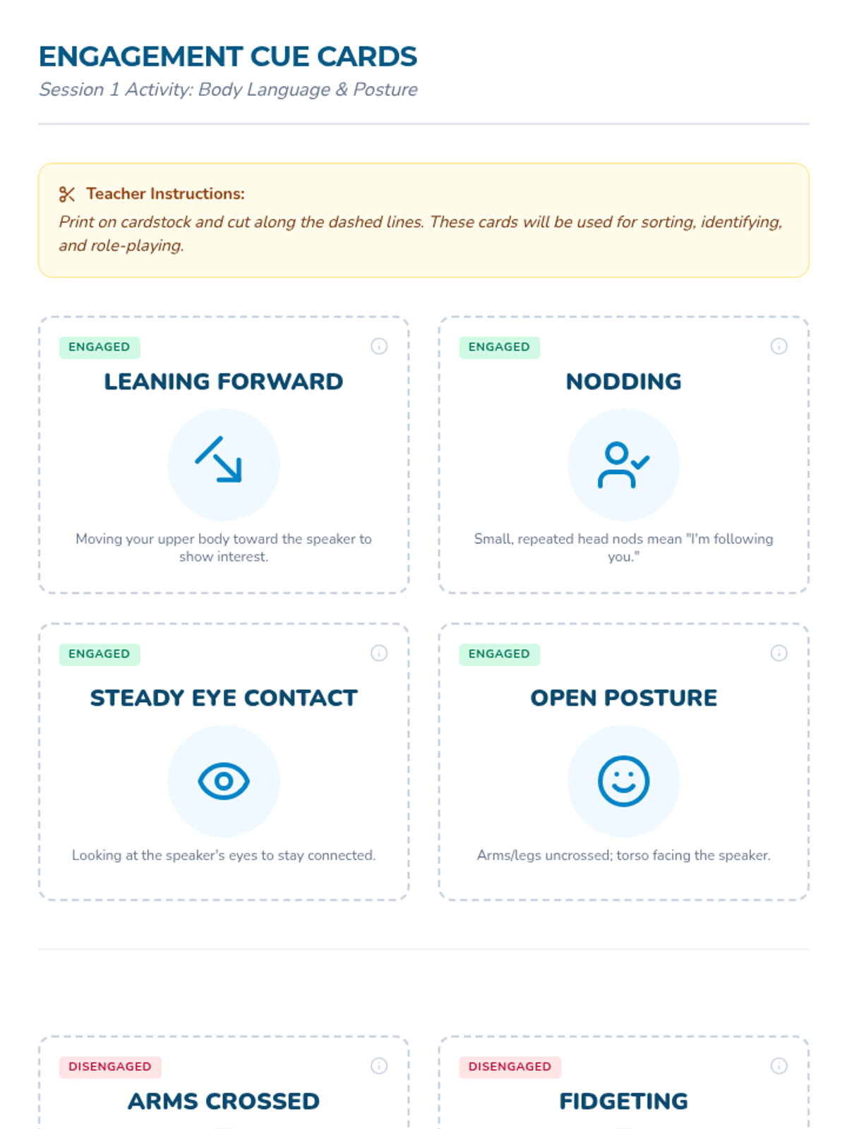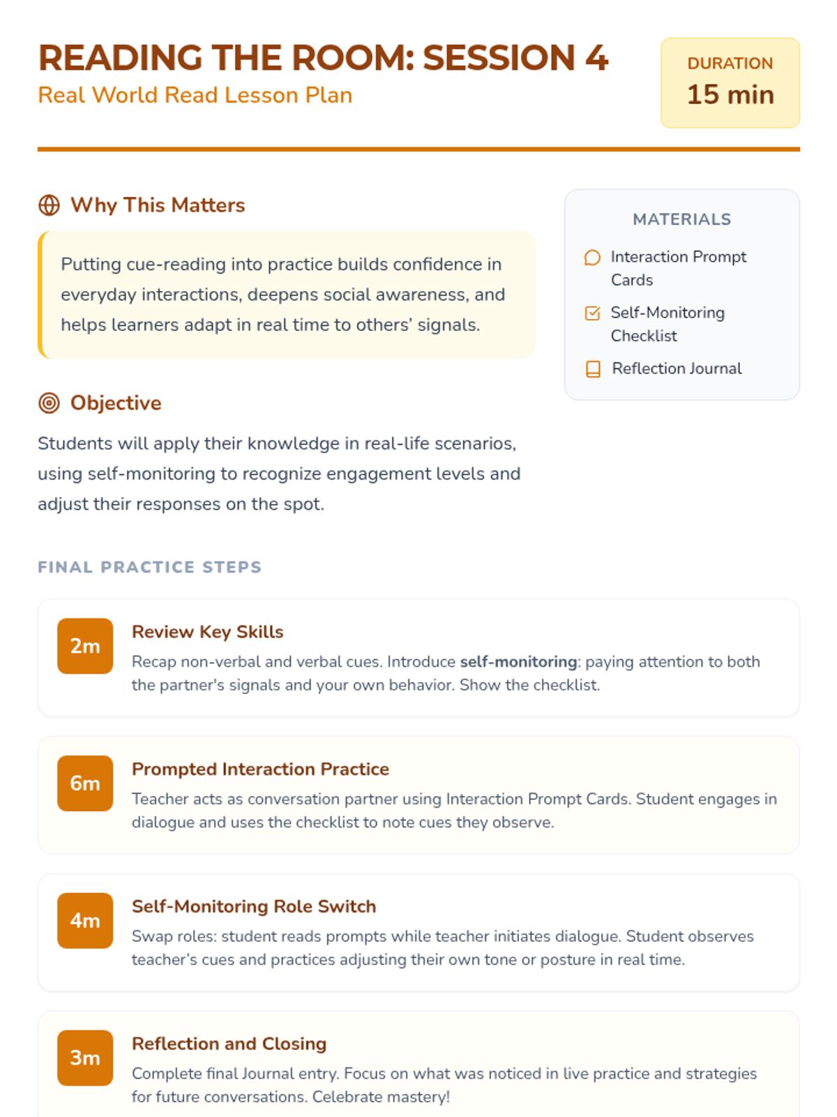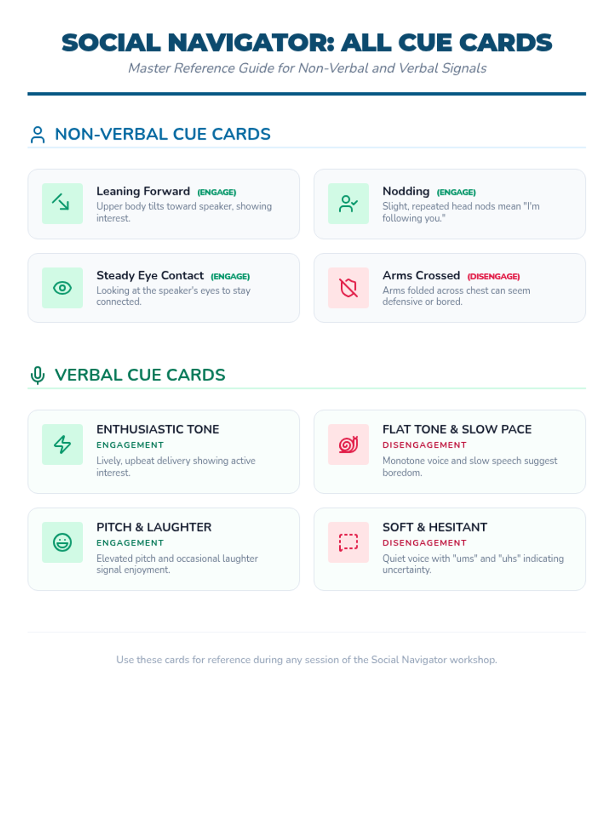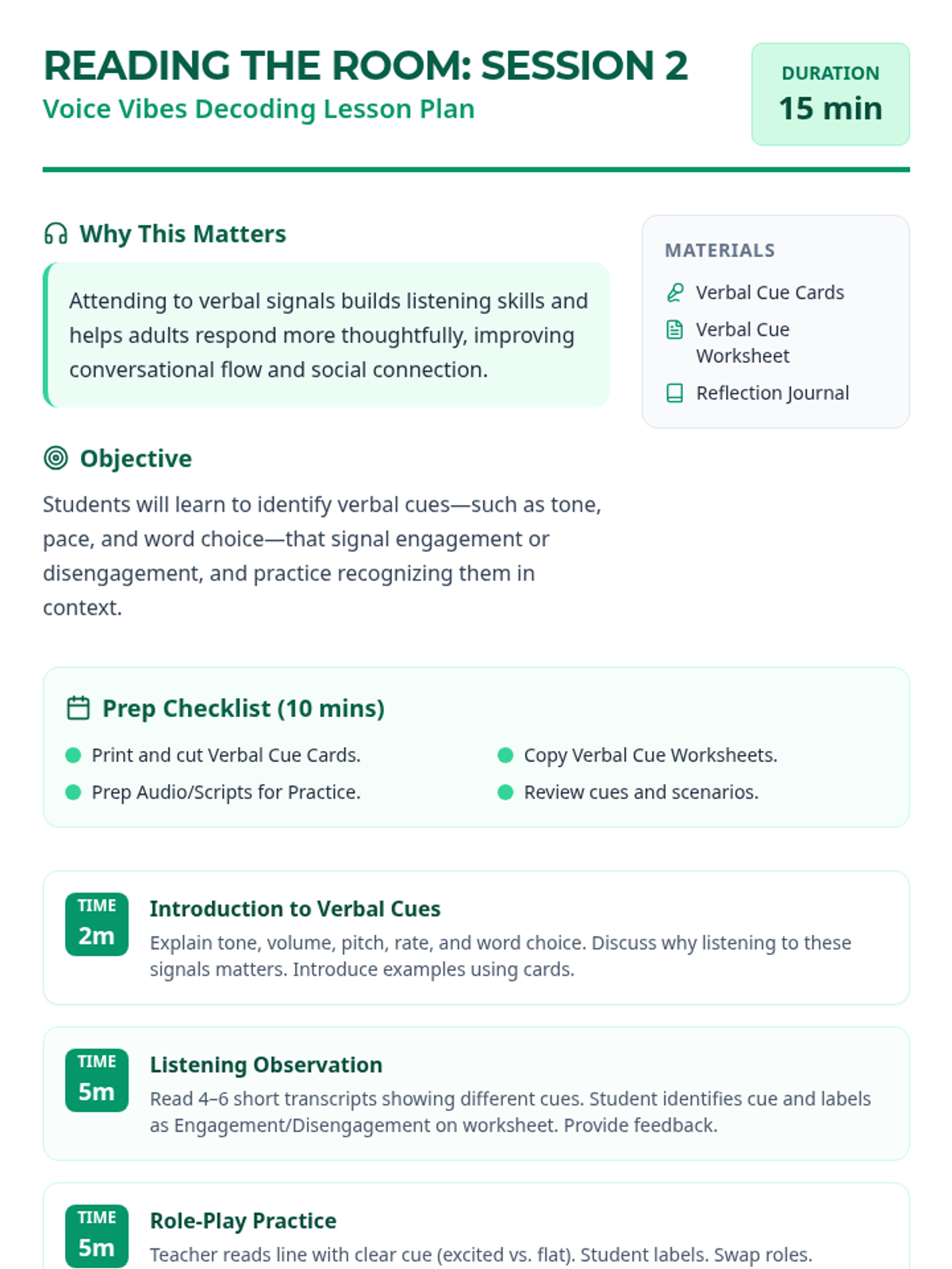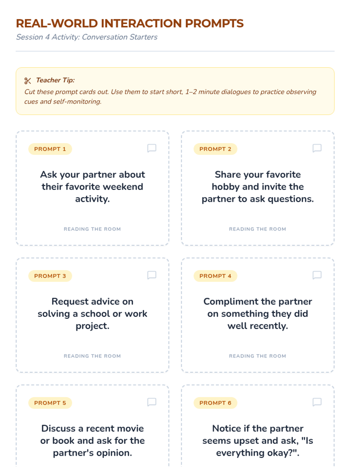 A series of four 15-minute sessions for individual learners to master recognizing verbal and non-verbal social cues. This sequence helps adults with developmental disabilities build social awareness and stronger connections.