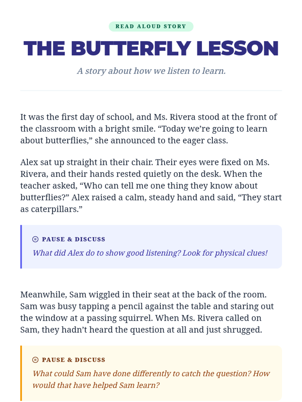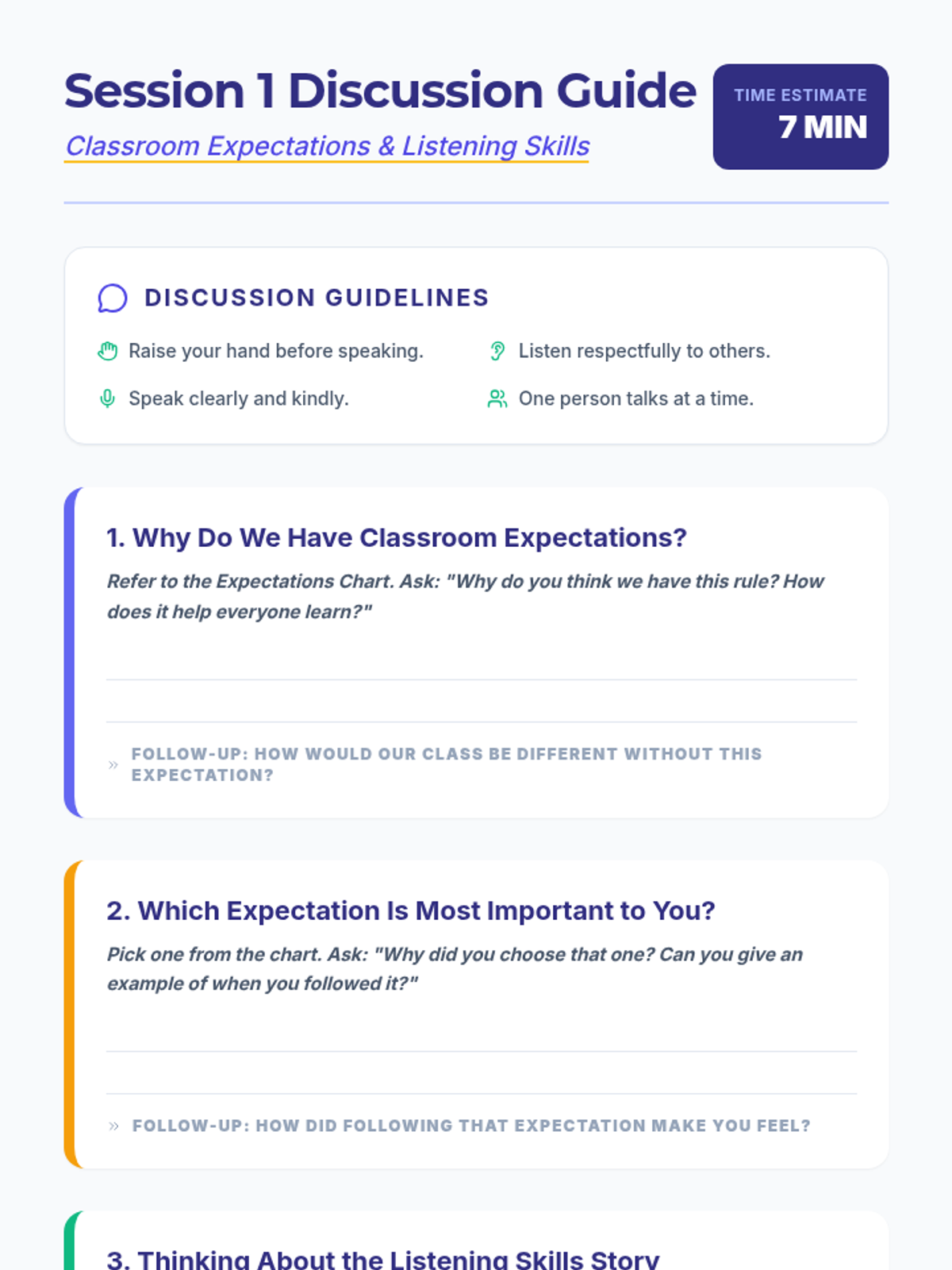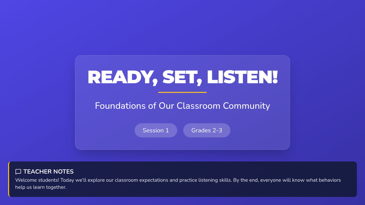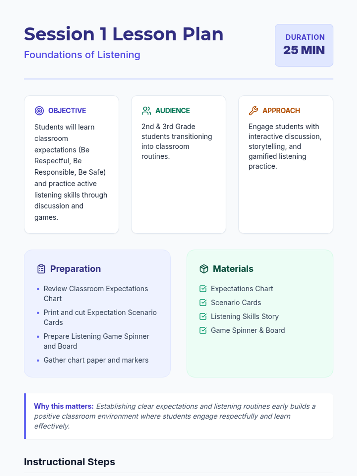 A two-session unit for second and third graders focused on establishing classroom expectations and developing active listening skills through stories, games, and interactive practice.