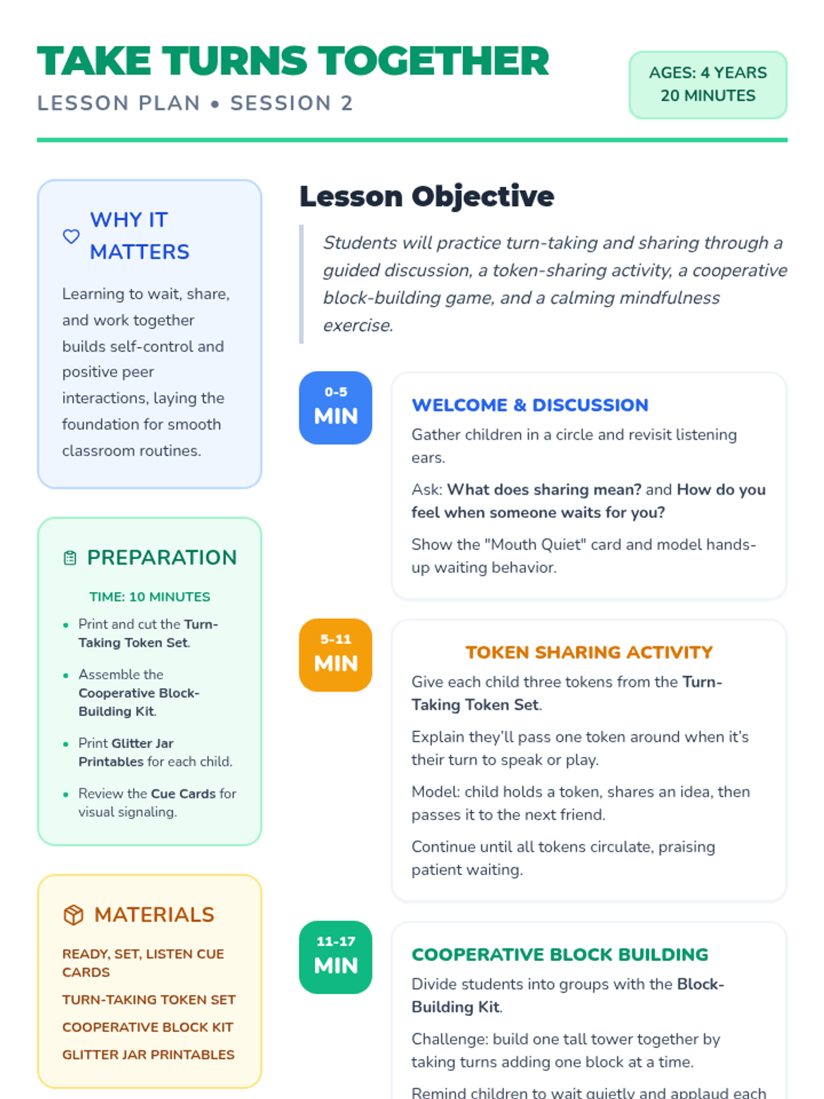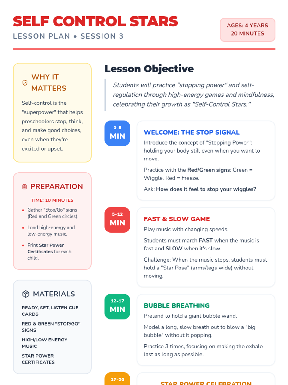 A foundational 3-session social-emotional learning series for preschoolers focusing on following directions, sharing, and self-control through play-based activities and mindful movements.