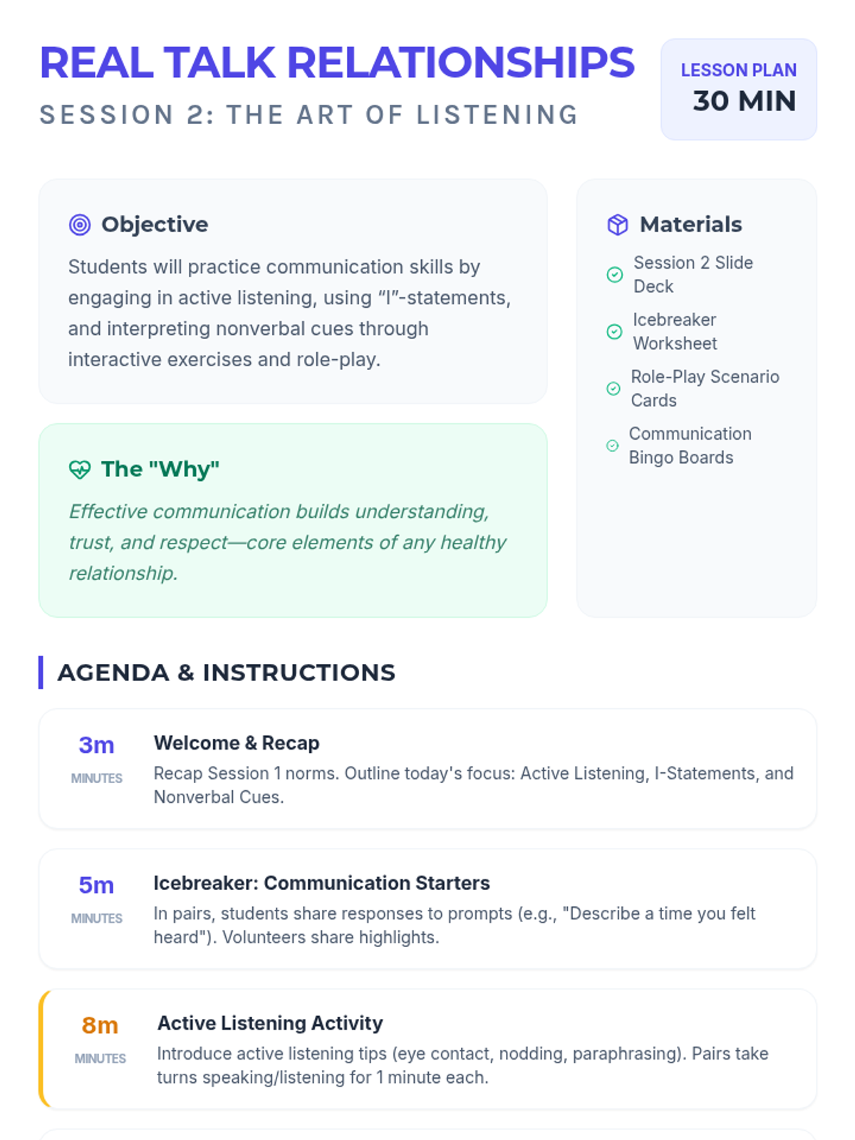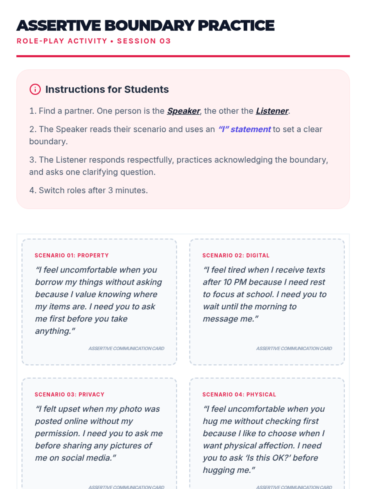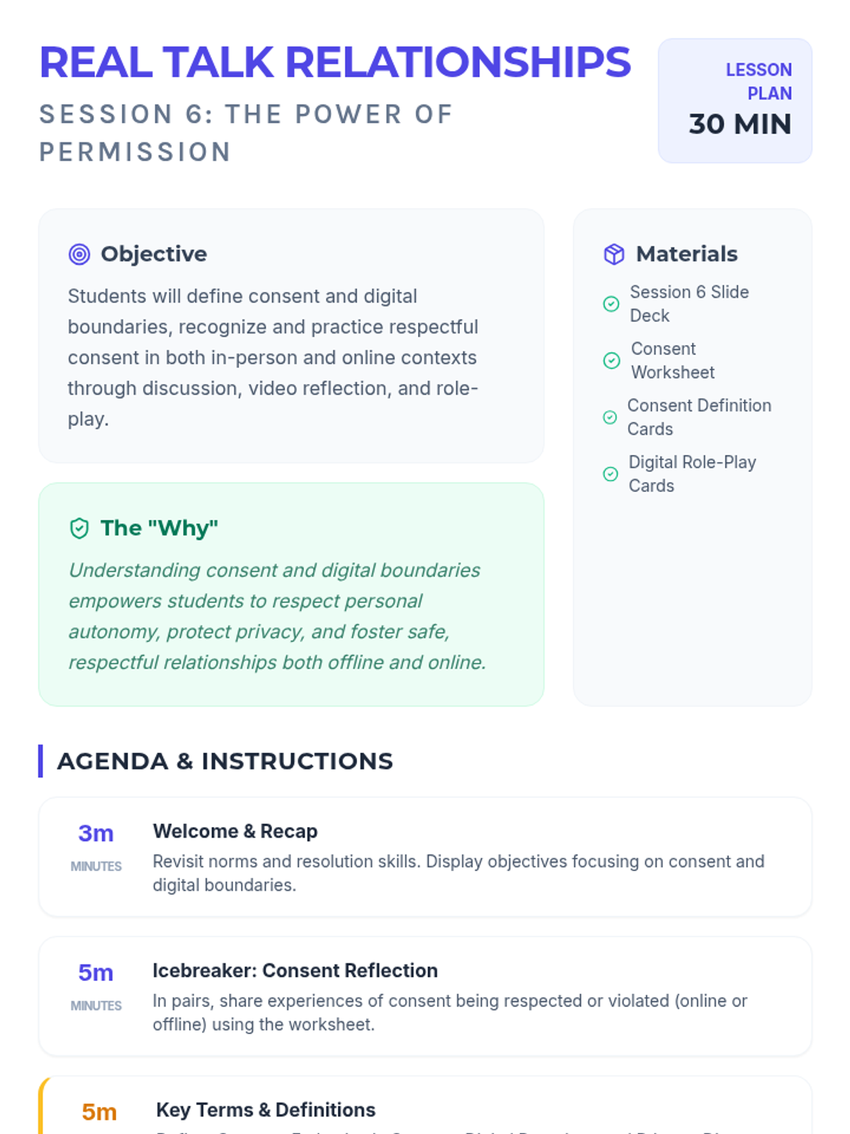 A 10-session course for high school students exploring healthy relationship skills including communication, boundaries, empathy, and conflict resolution across platonic, romantic, and digital contexts.