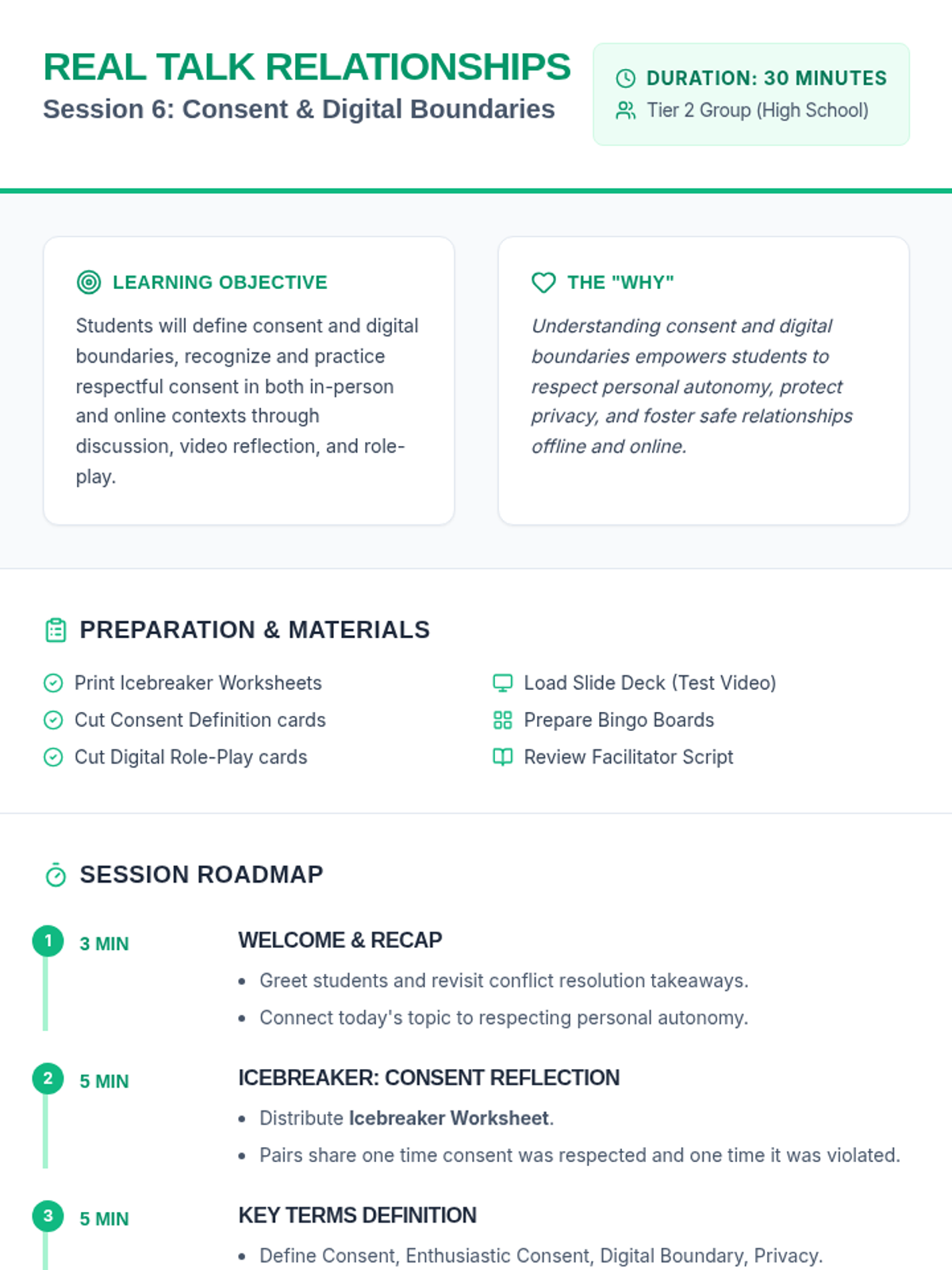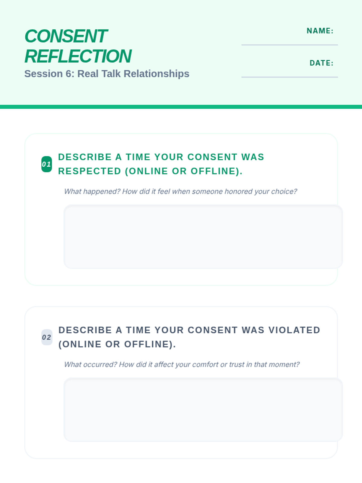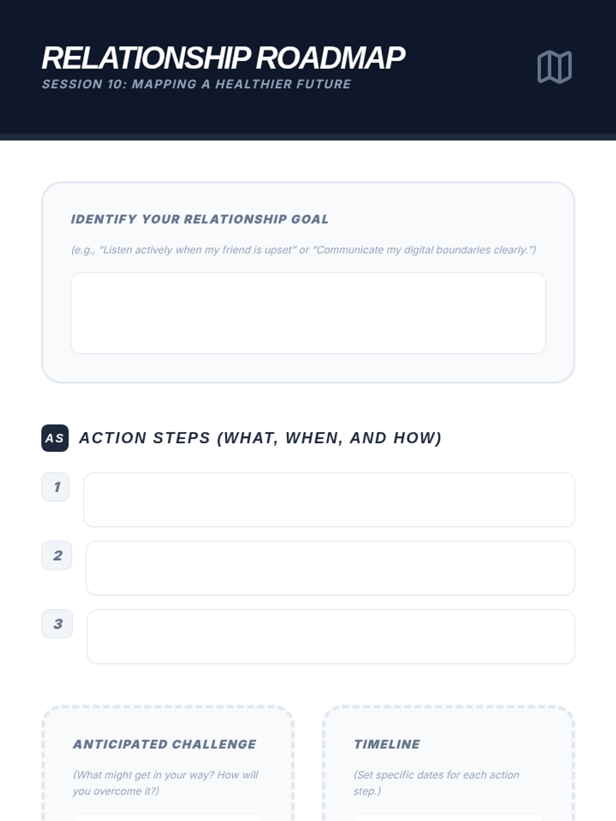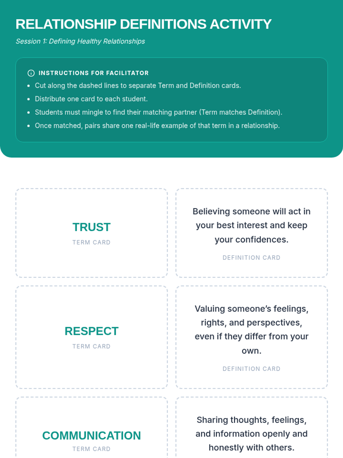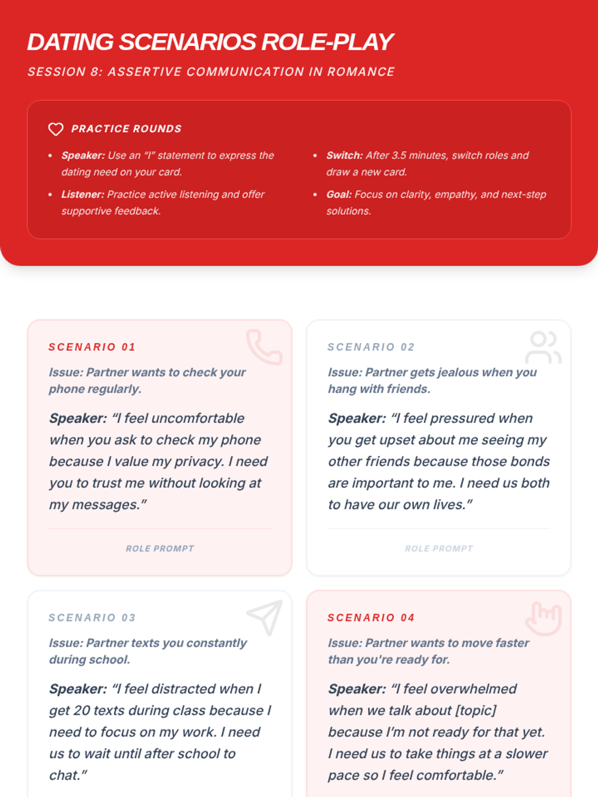 A 10-session course for high school students exploring communication, boundaries, consent, and conflict resolution across romantic, platonic, and digital relationships.