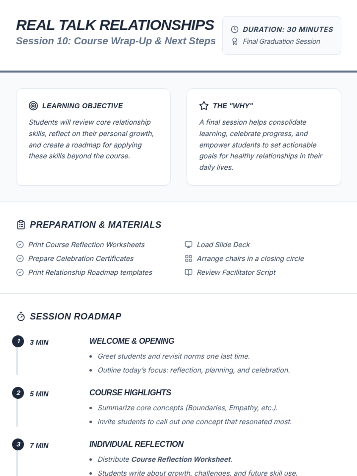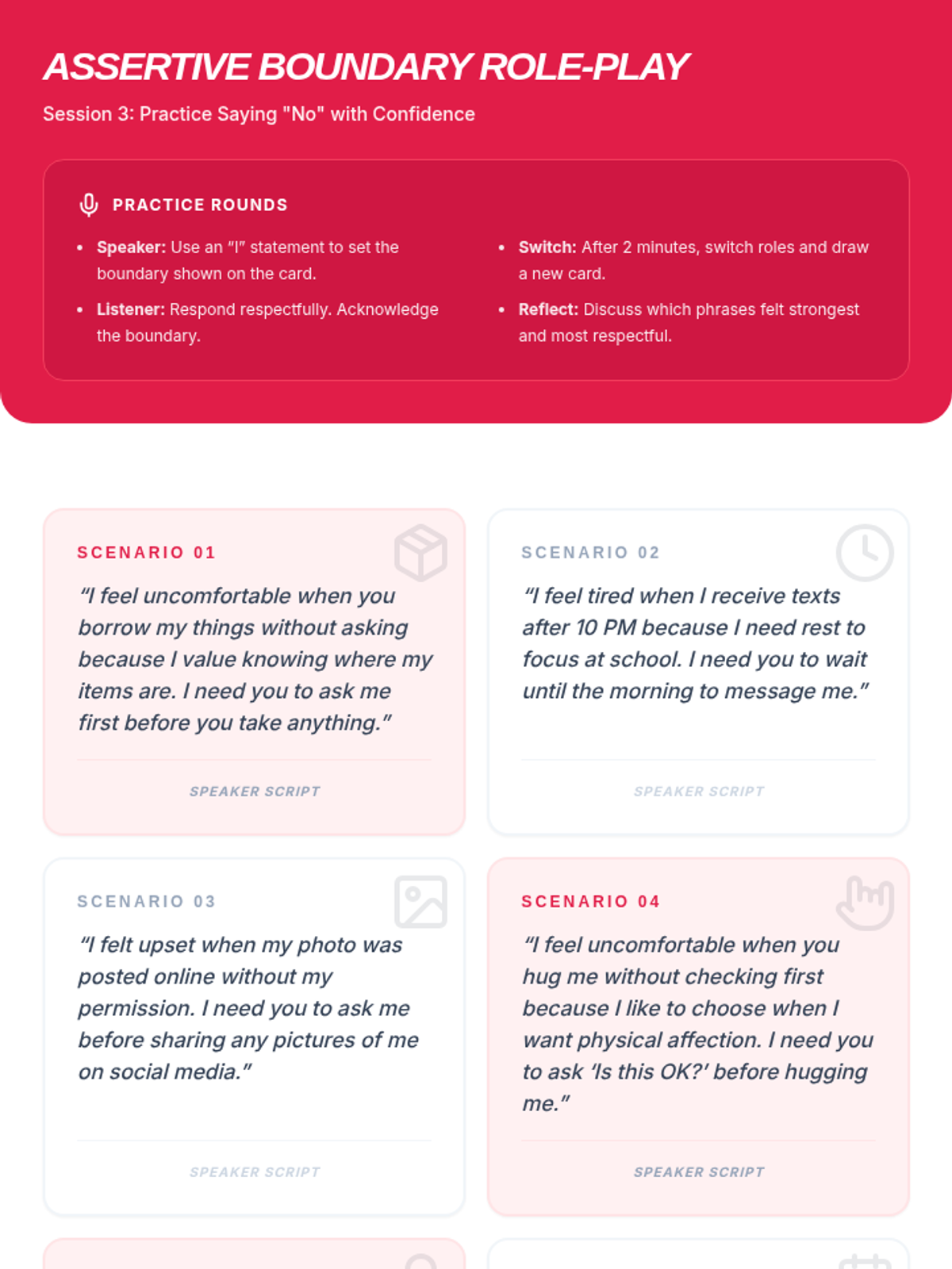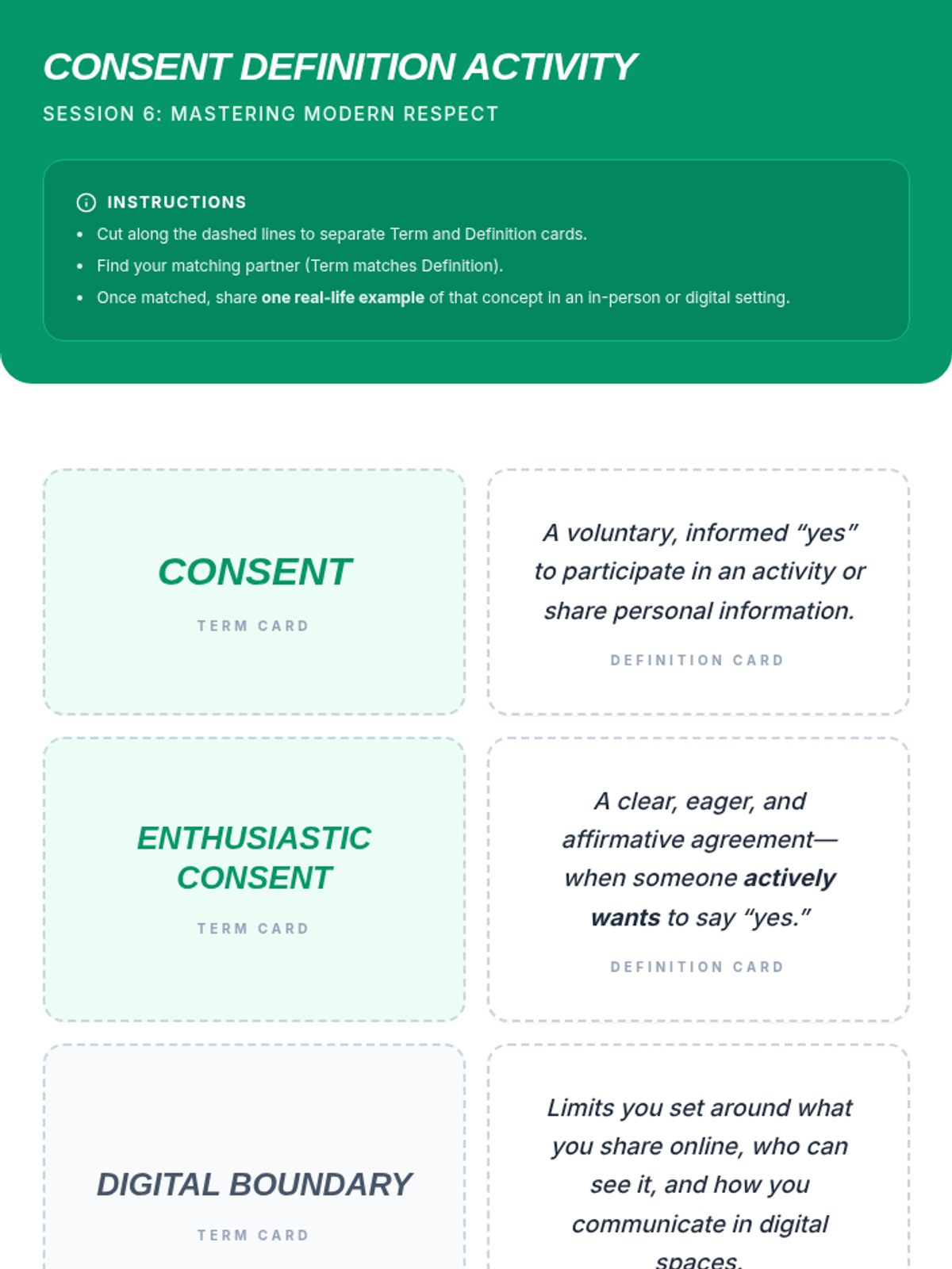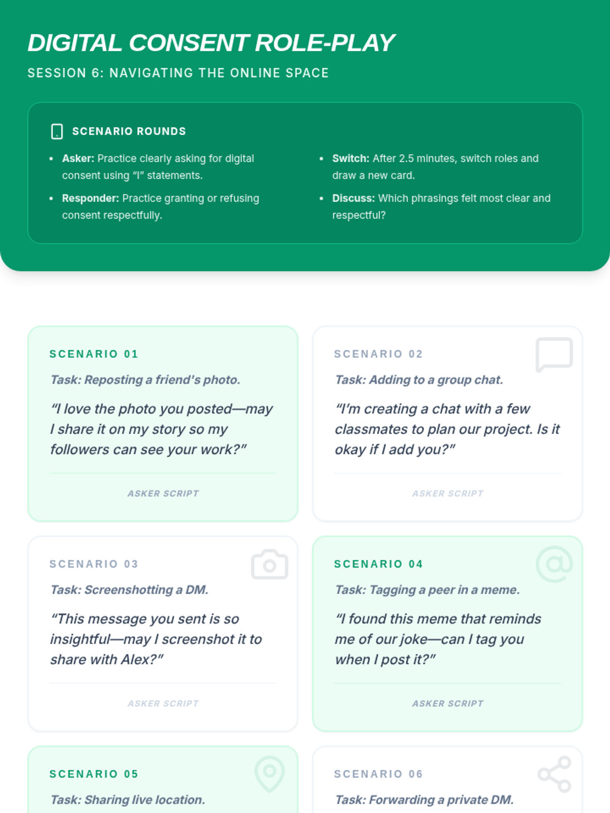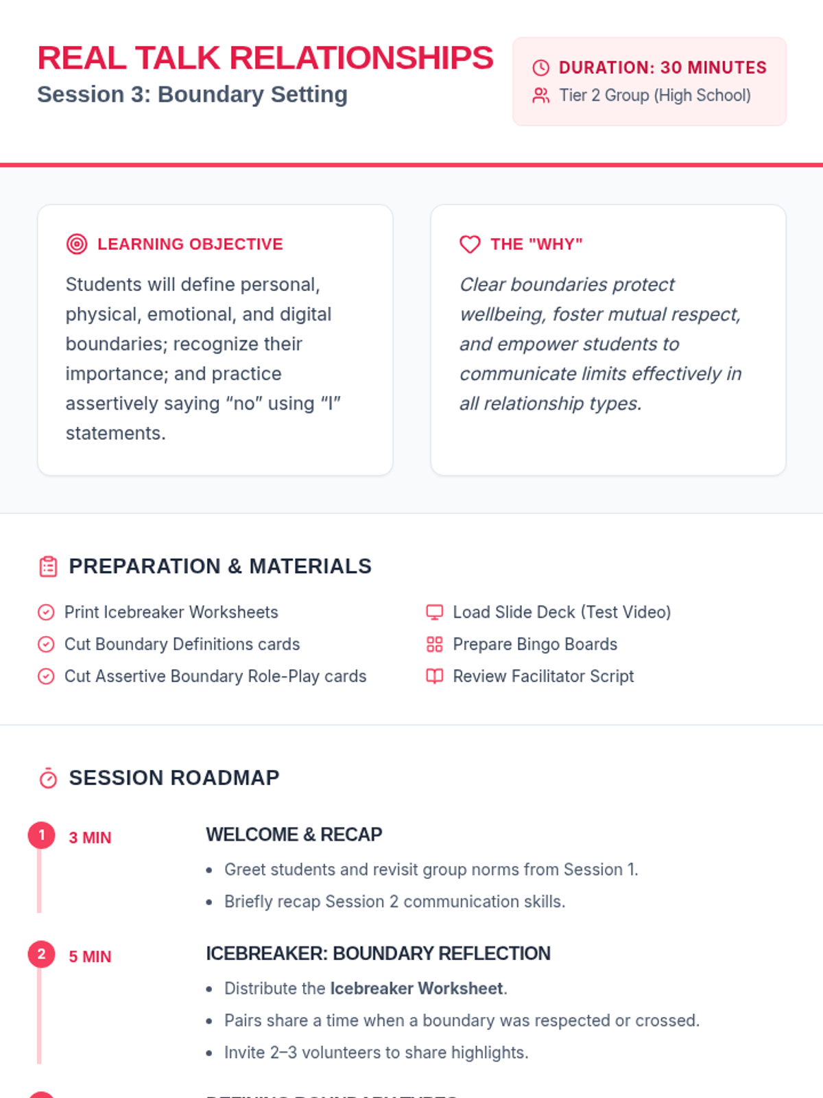 A 10-session course for high school students exploring communication, boundaries, consent, and conflict resolution across romantic, platonic, and digital relationships.