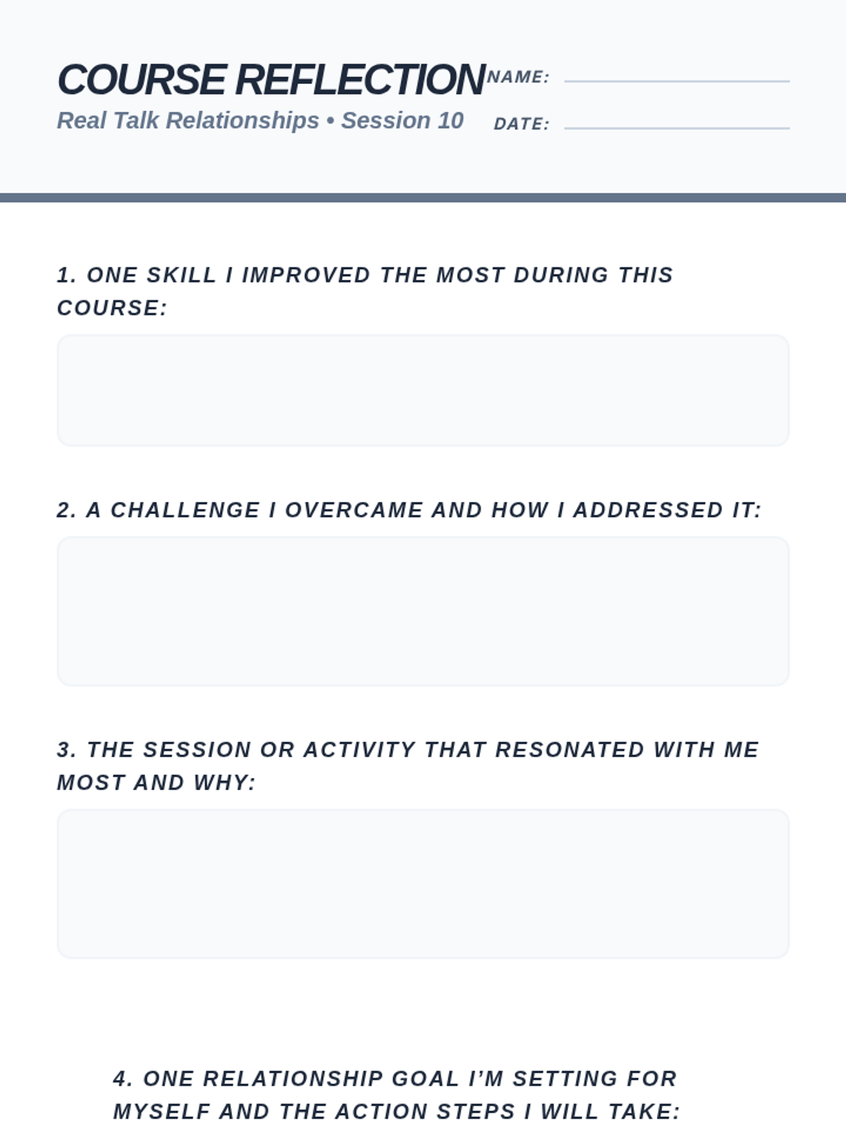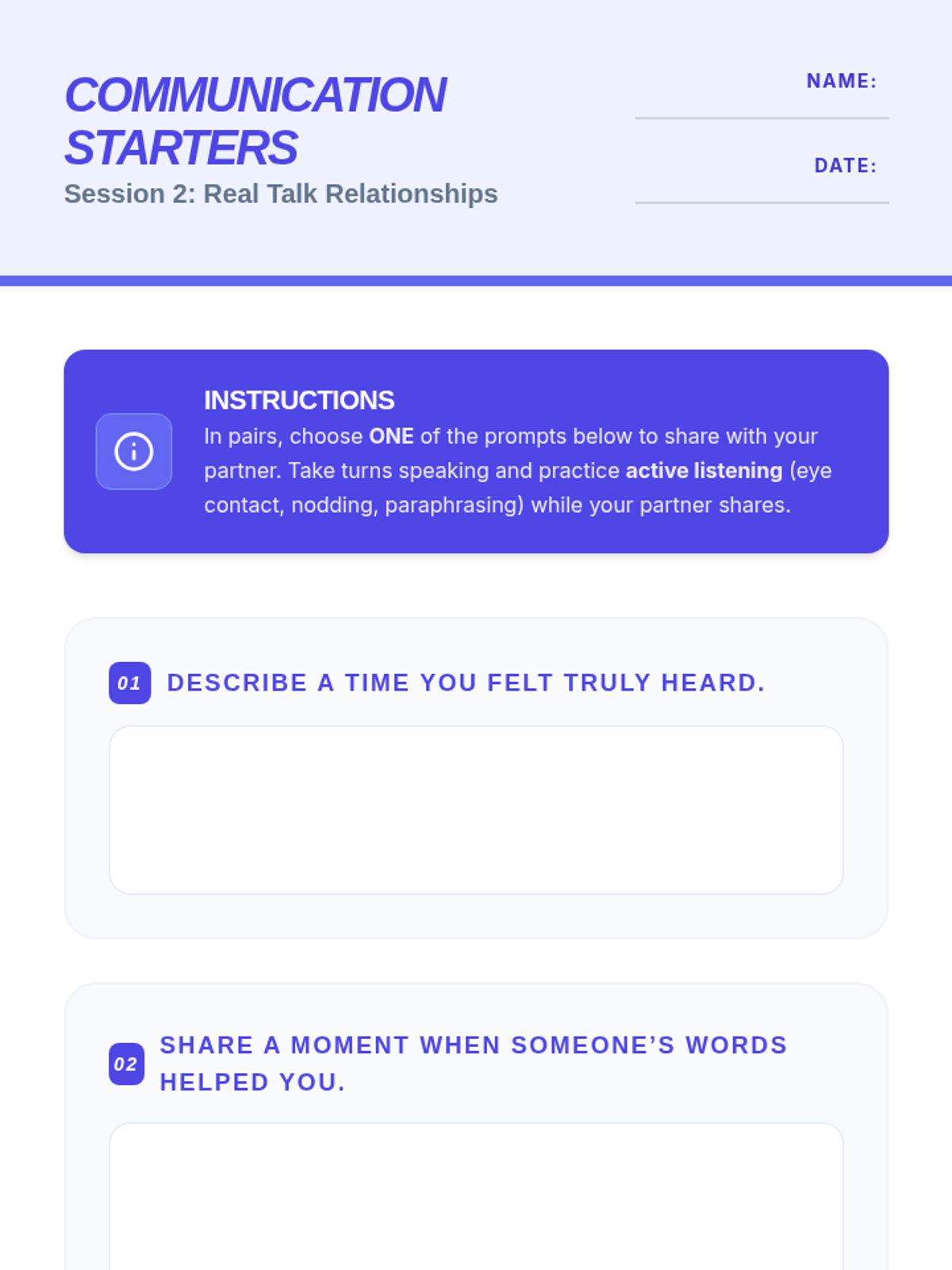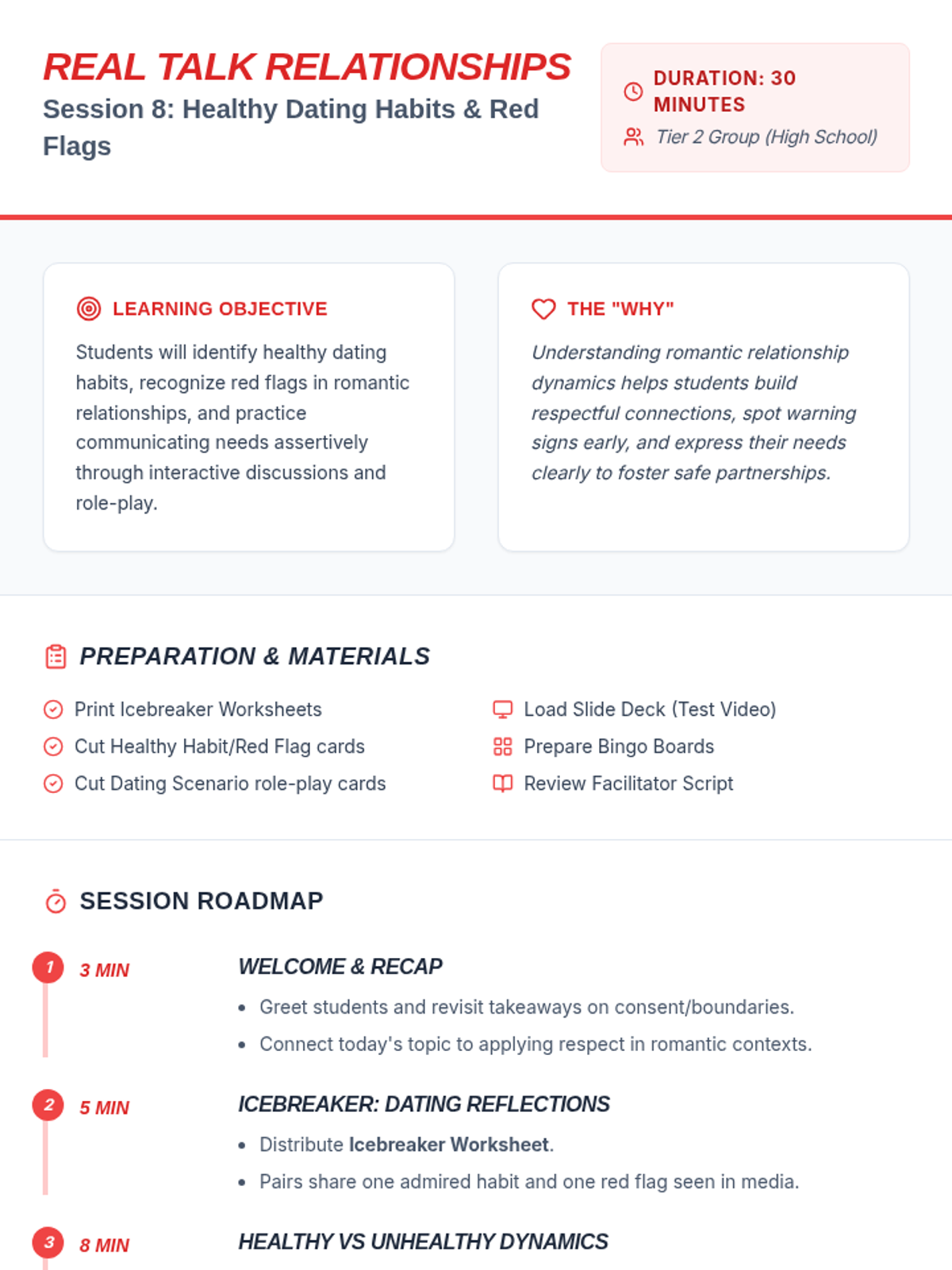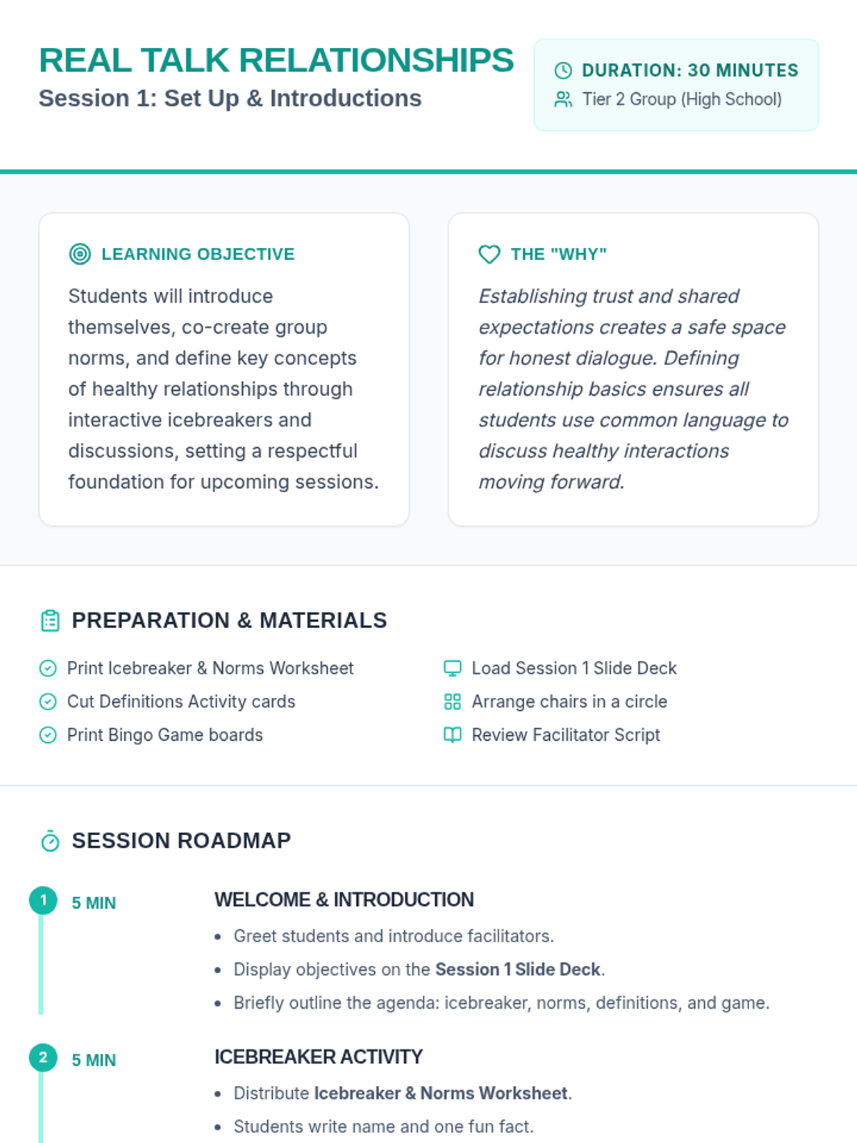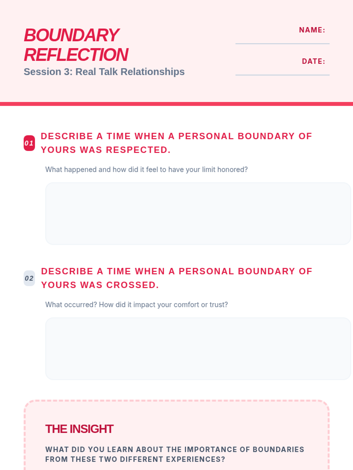 A 10-session course for high school students exploring communication, boundaries, consent, and conflict resolution across romantic, platonic, and digital relationships.