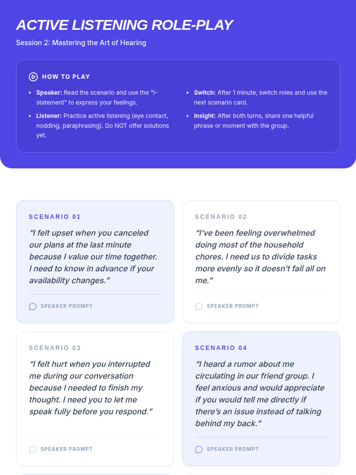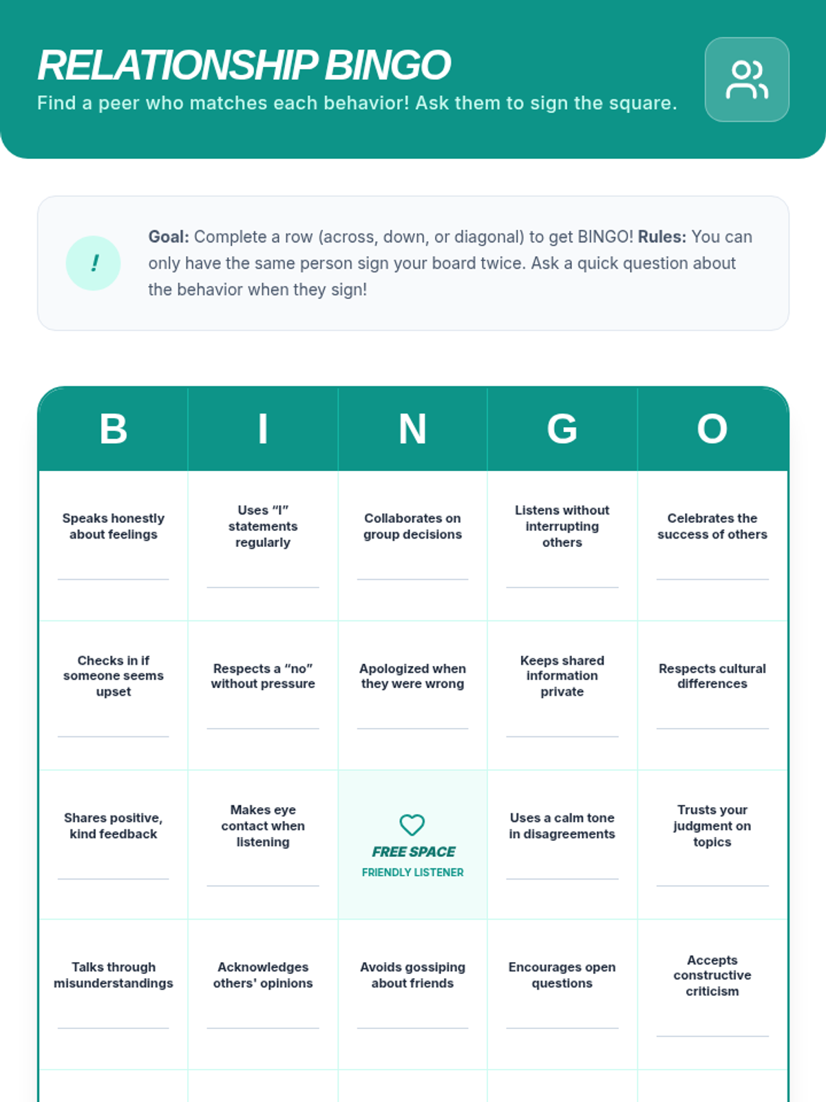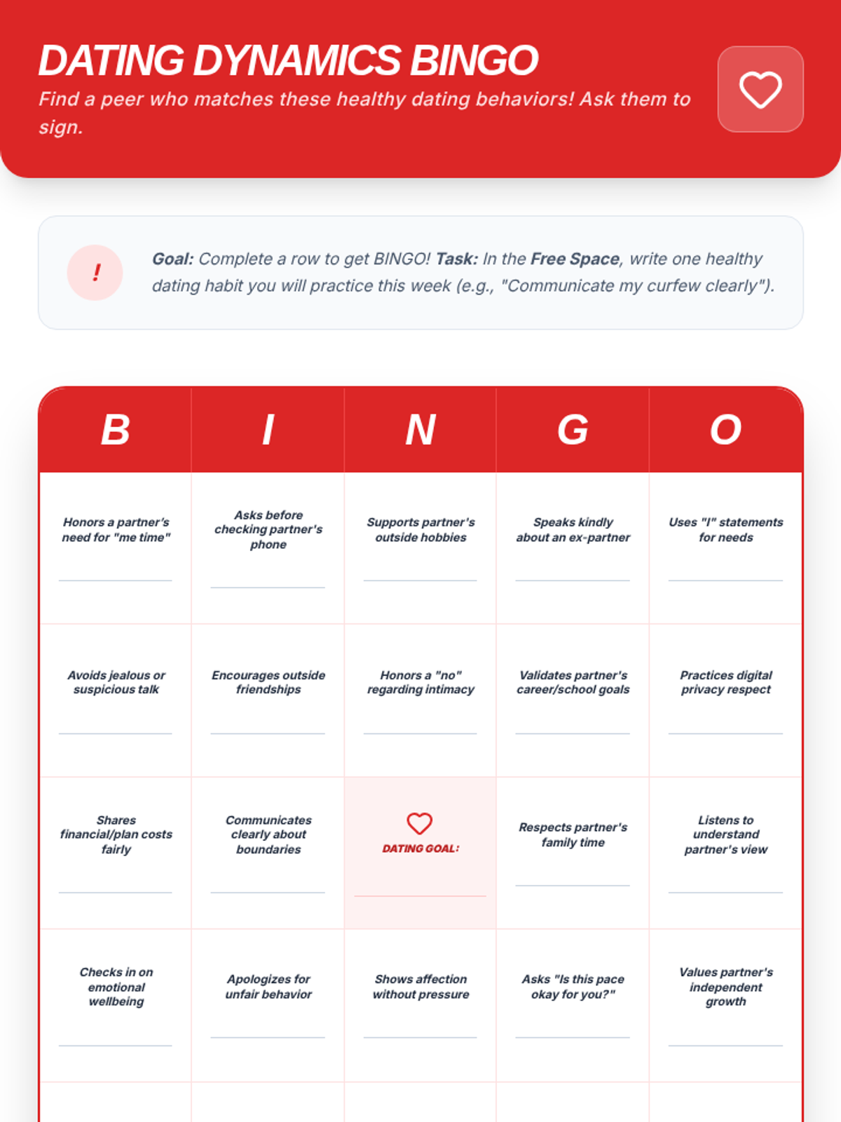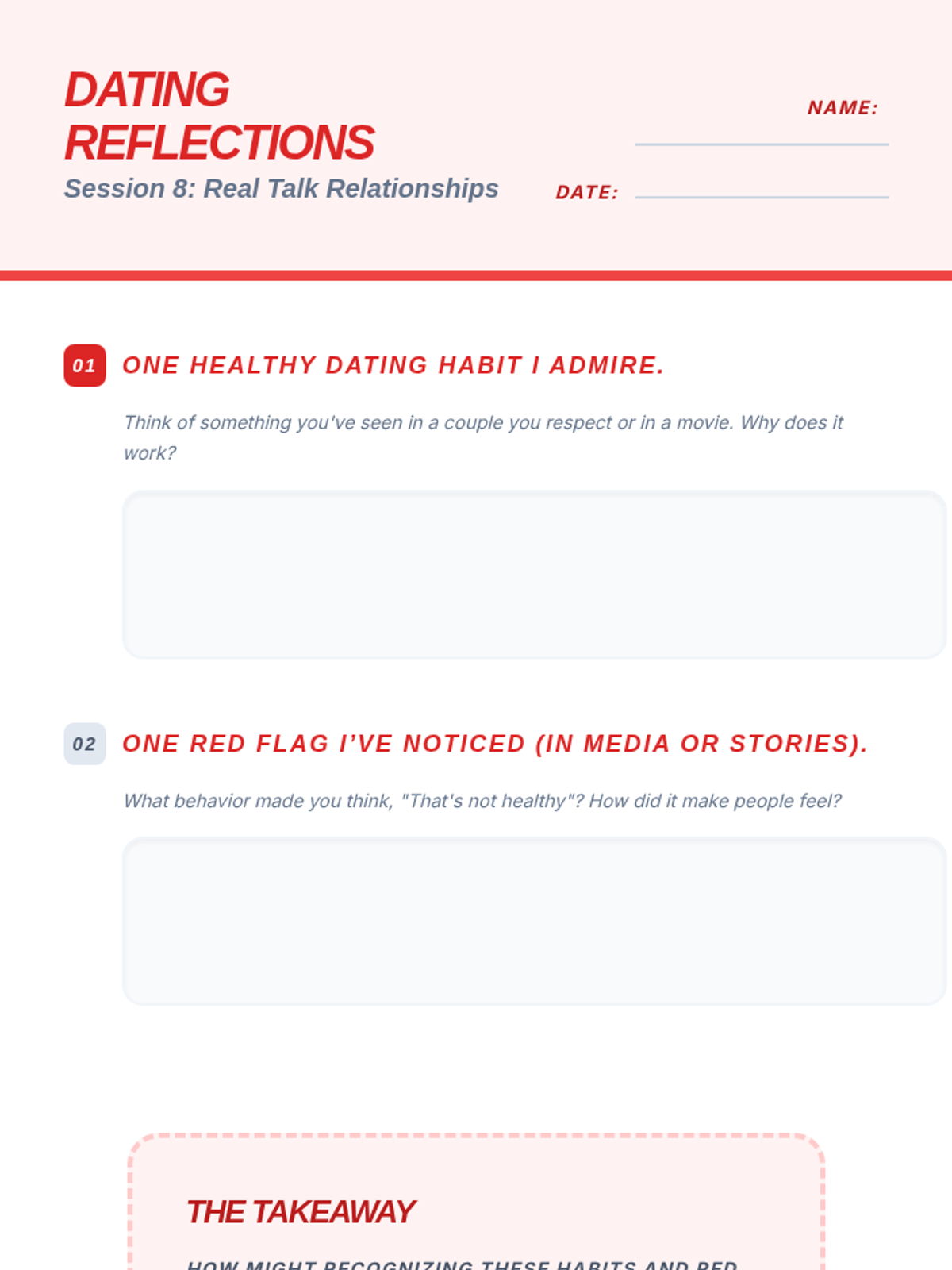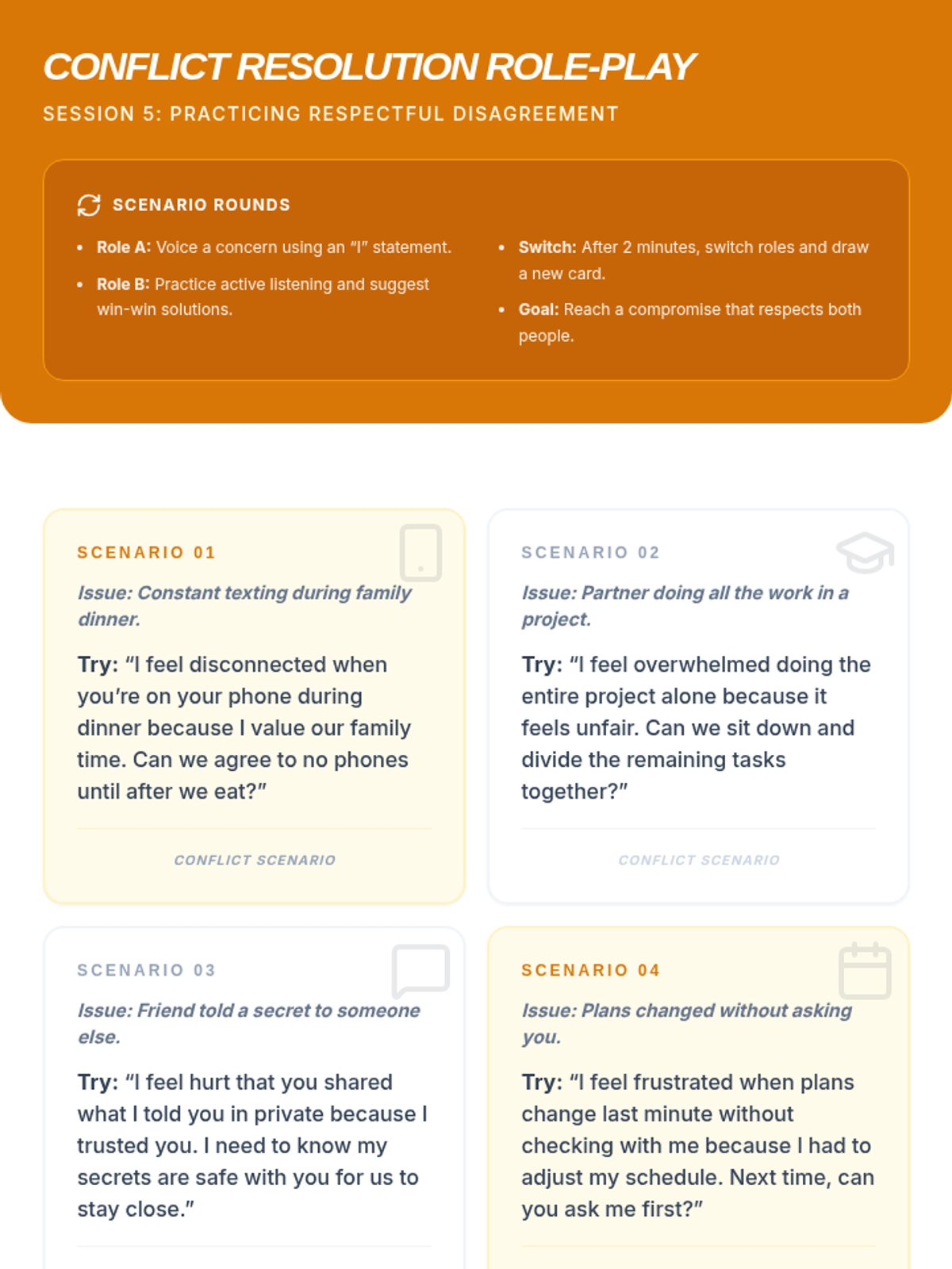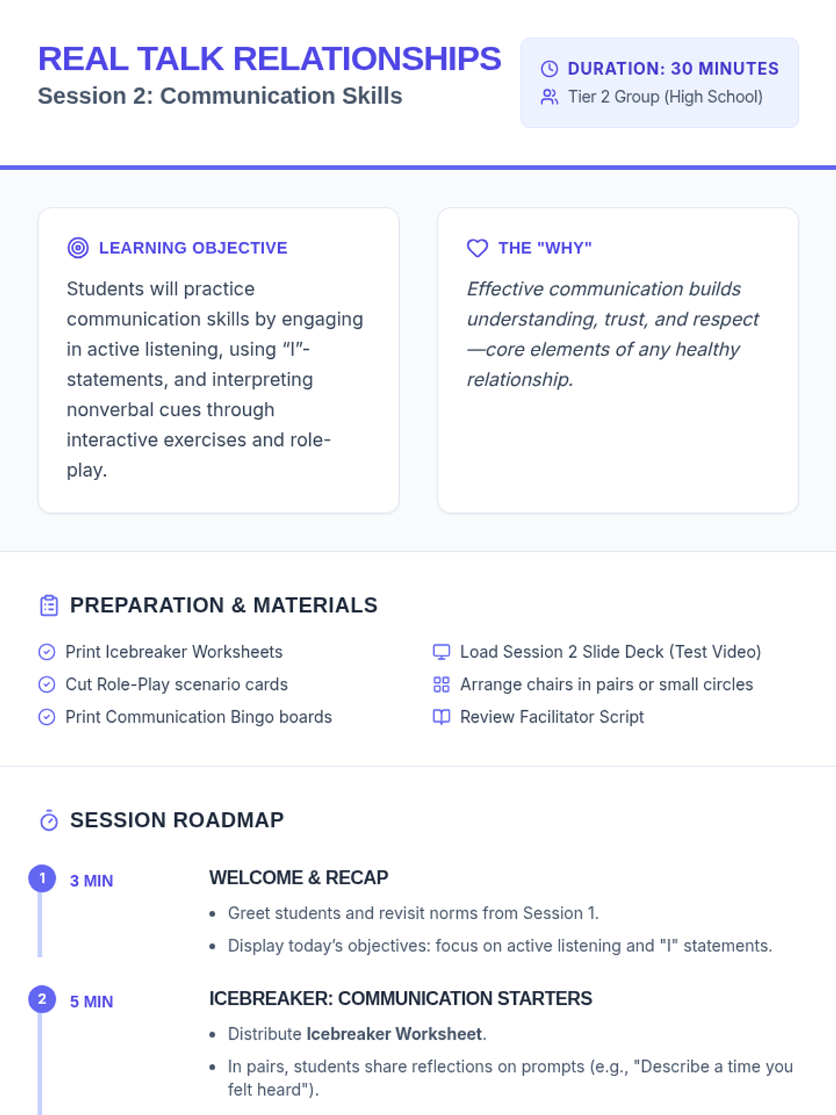 A 10-session course for high school students exploring communication, boundaries, consent, and conflict resolution across romantic, platonic, and digital relationships.