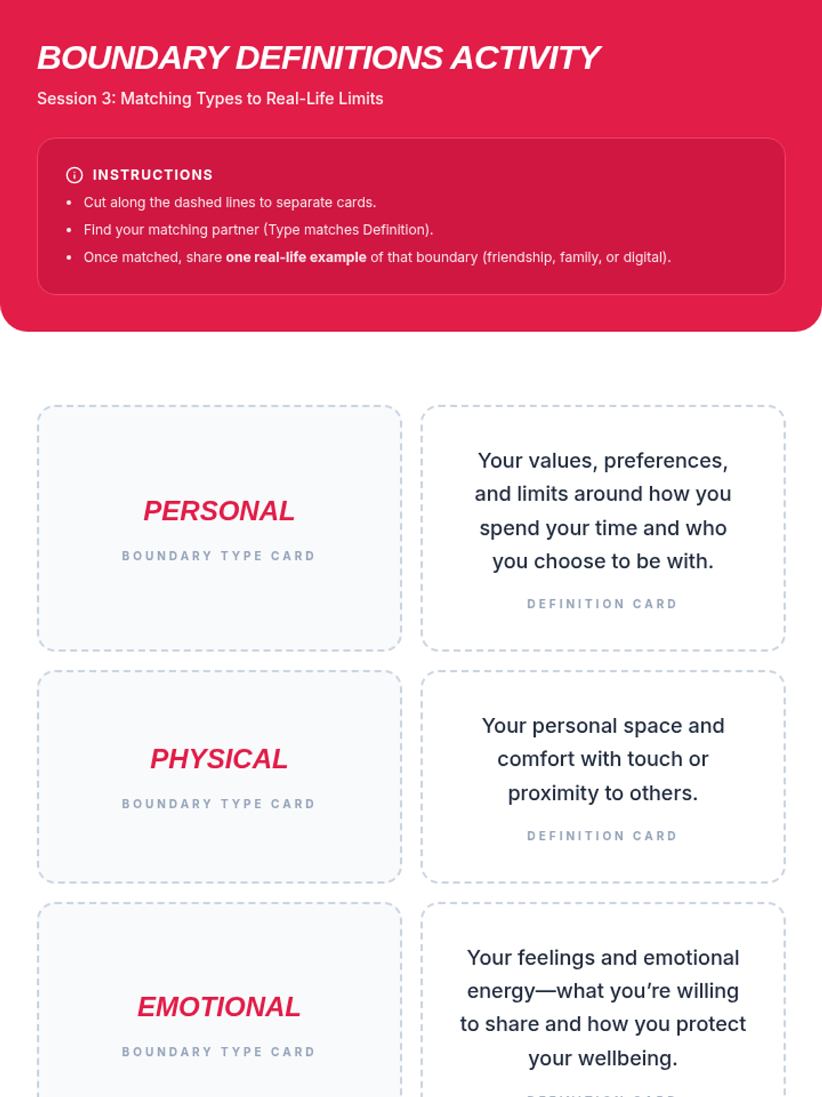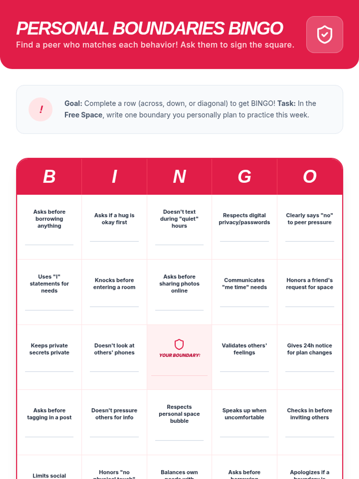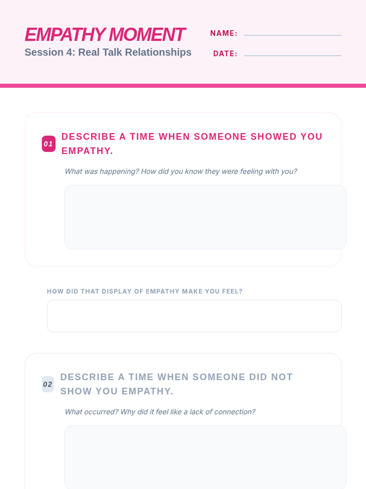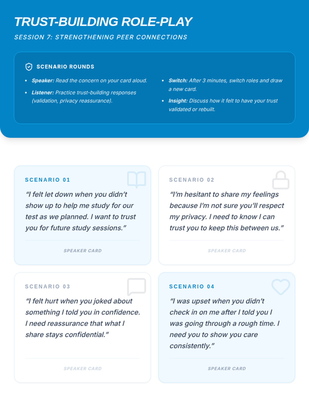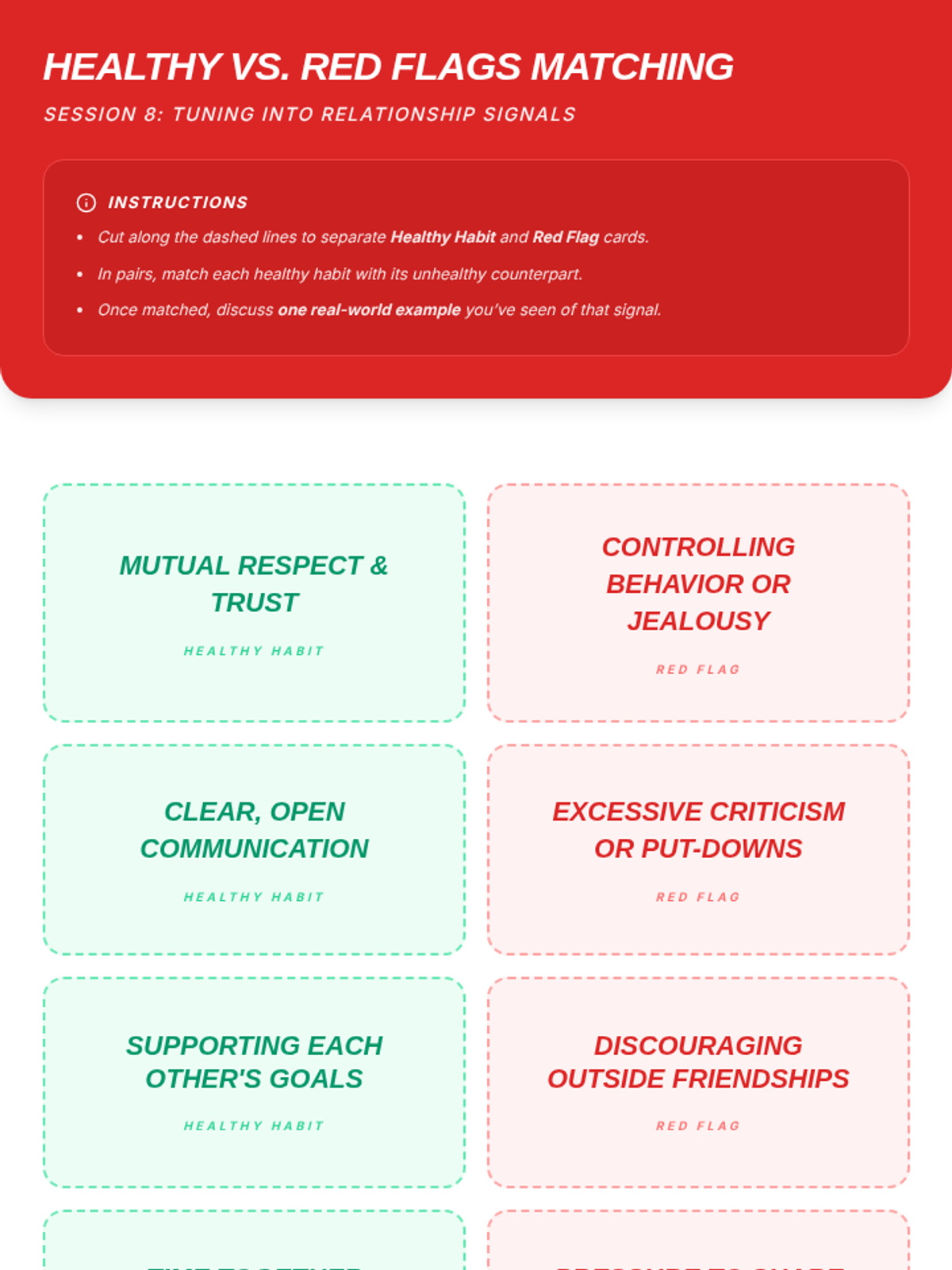 A 10-session course for high school students exploring communication, boundaries, consent, and conflict resolution across romantic, platonic, and digital relationships.