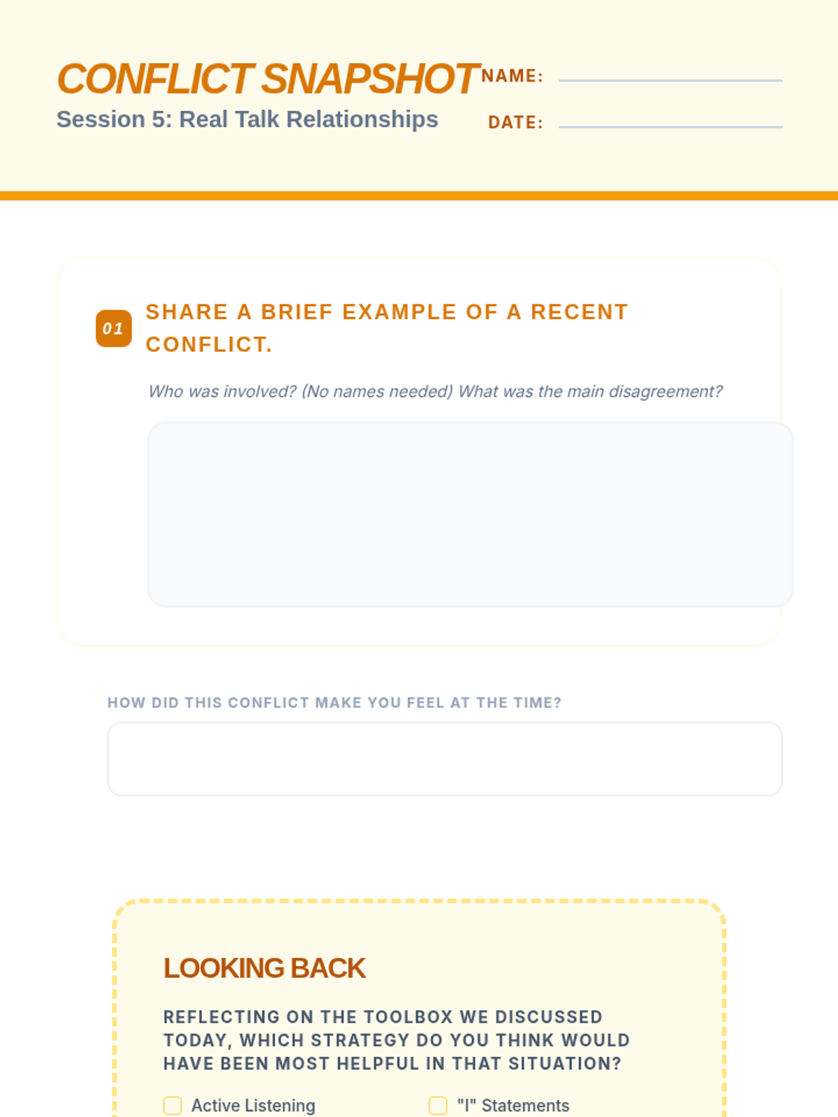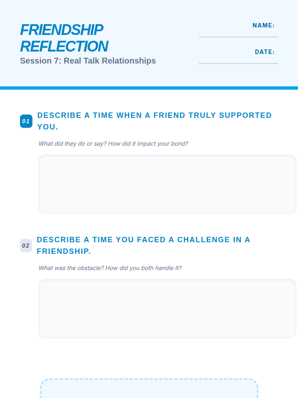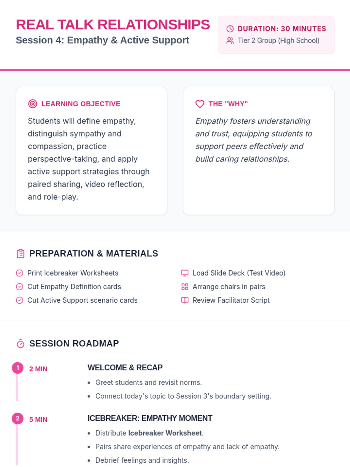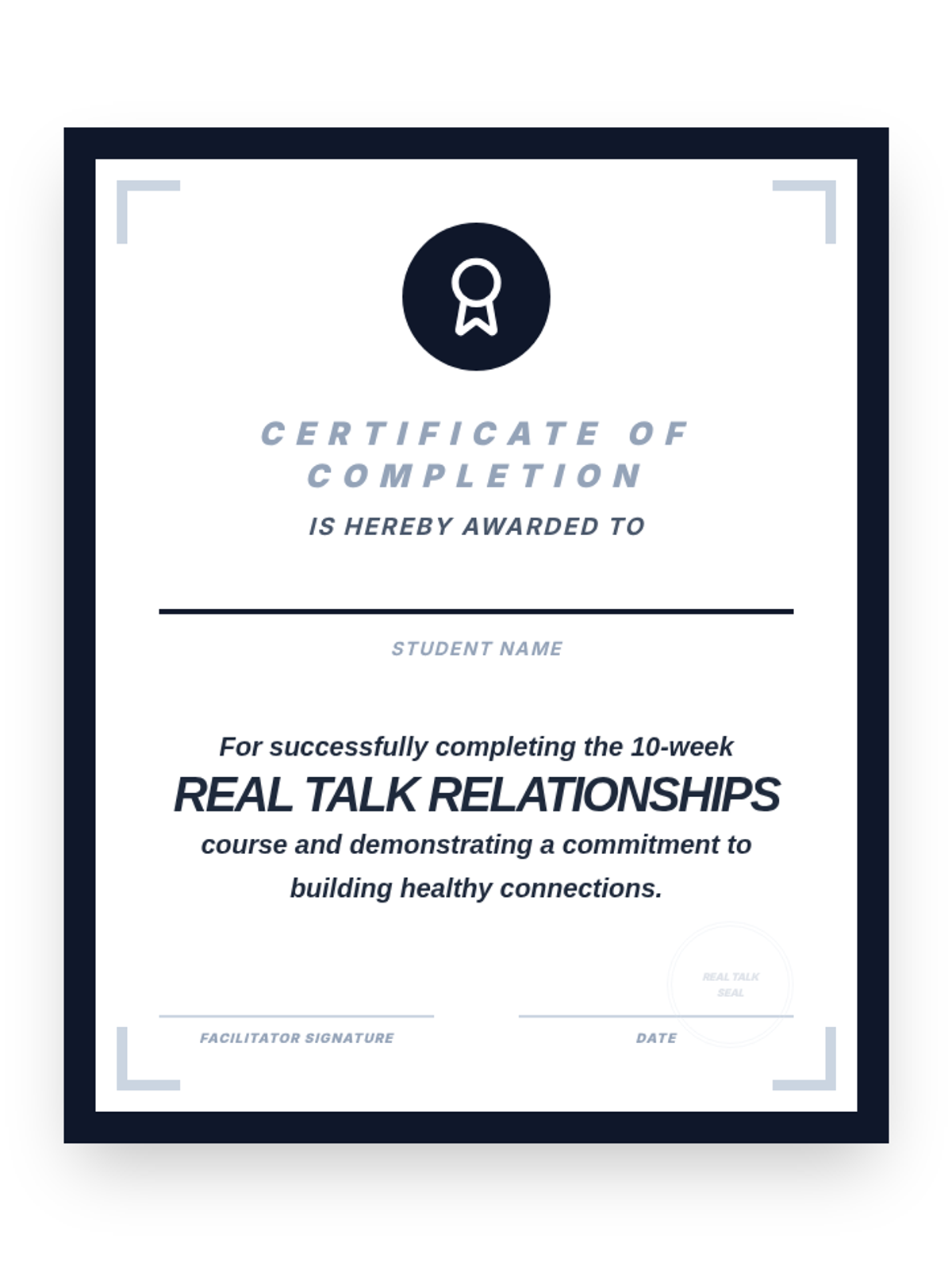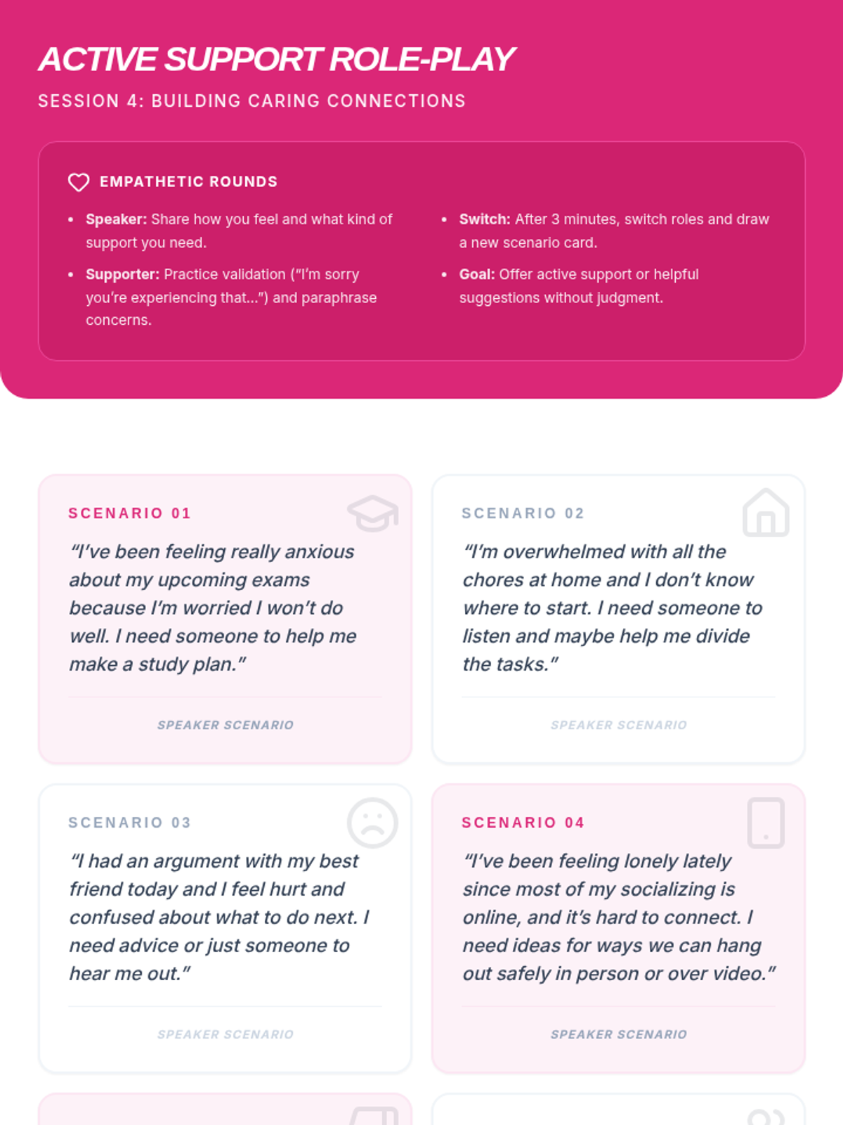A 10-session course for high school students exploring communication, boundaries, consent, and conflict resolution across romantic, platonic, and digital relationships.