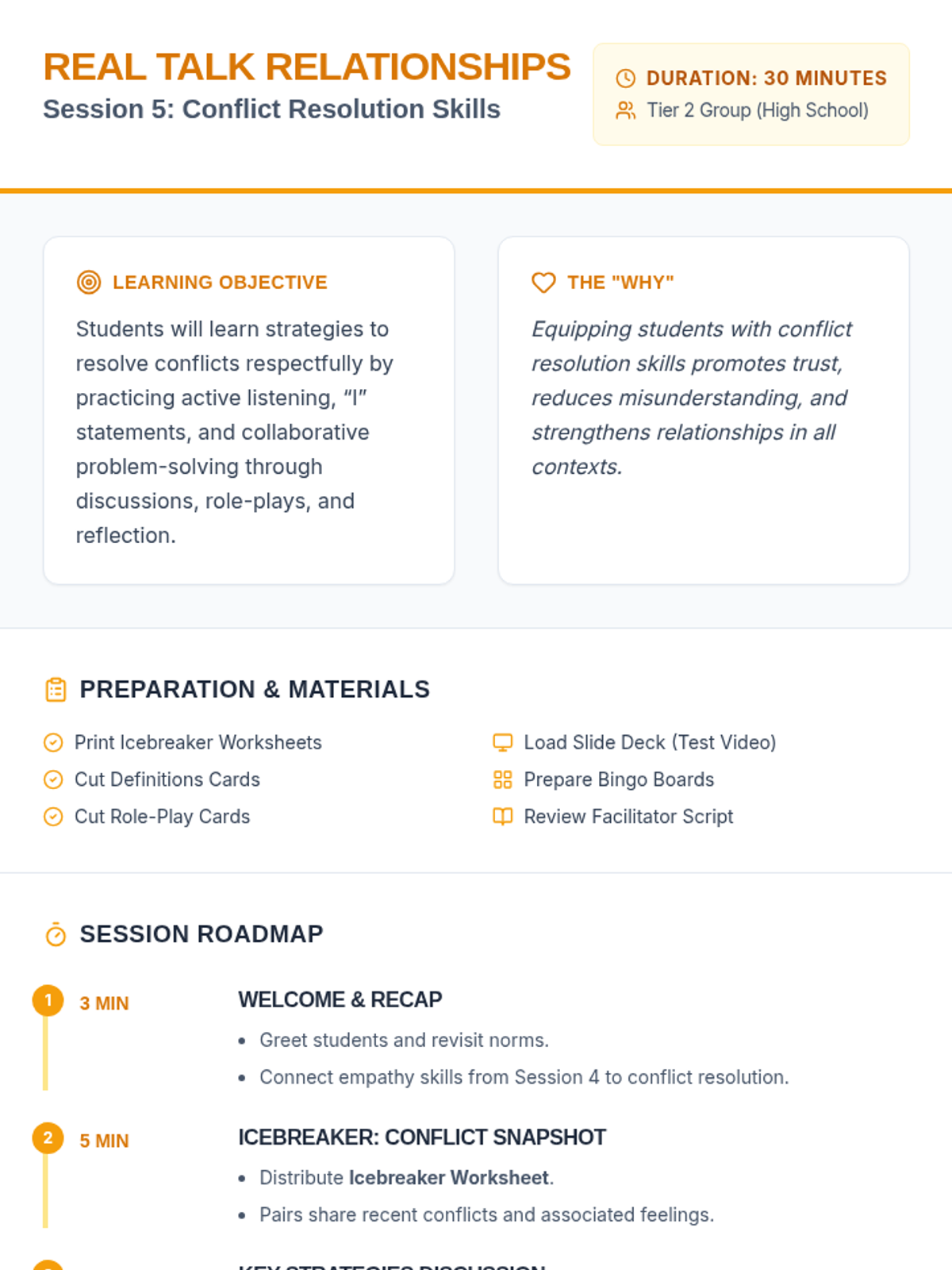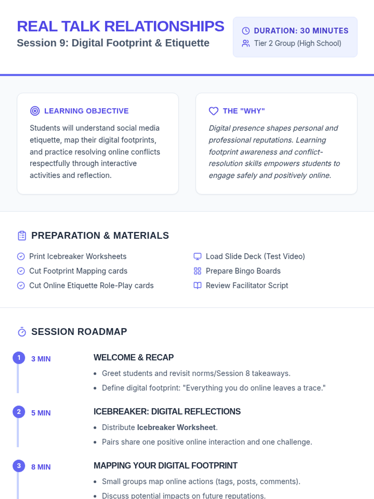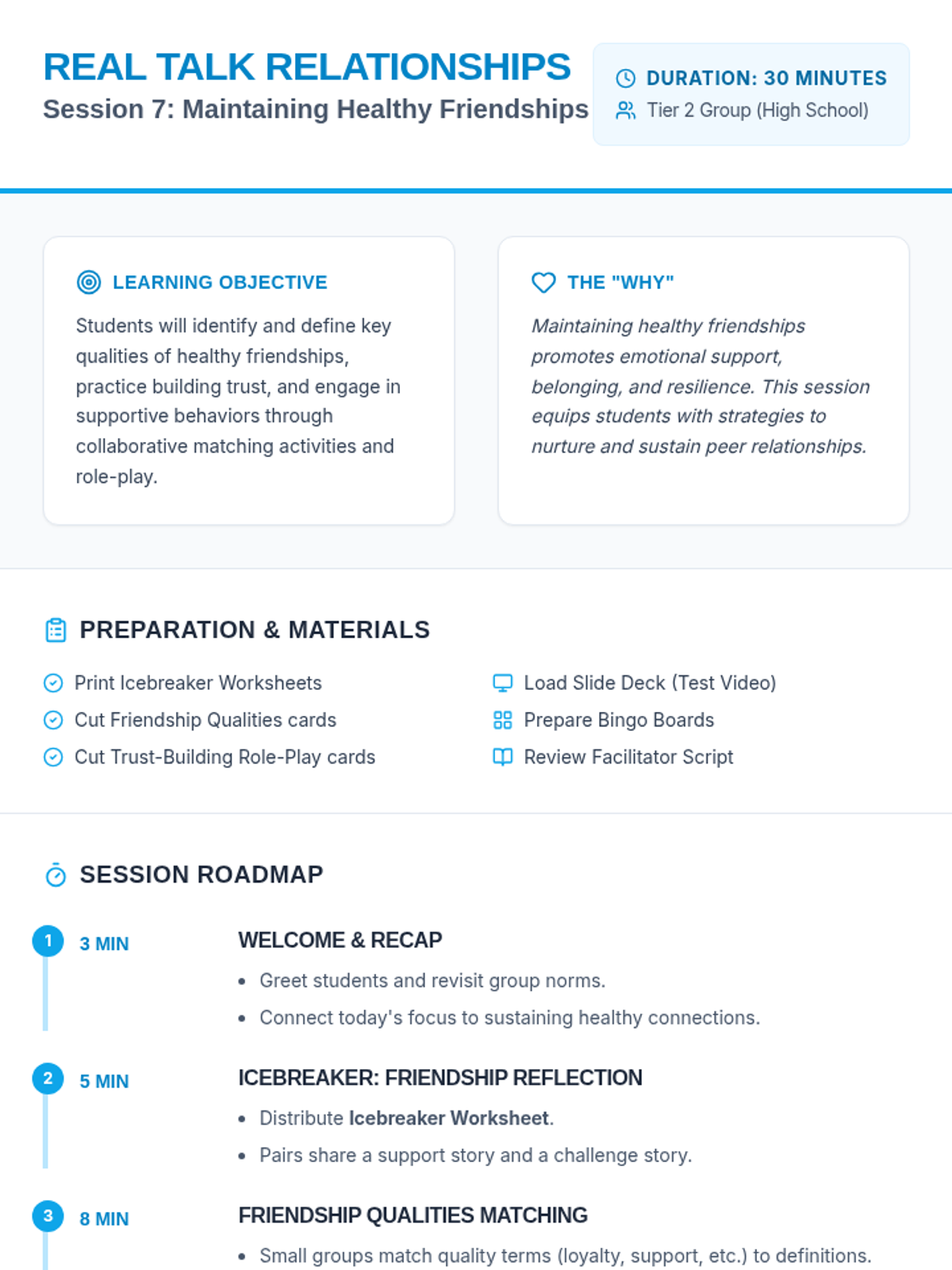 A 6-week executive functioning curriculum for 9th-grade boys designed for 25-minute small group sessions. Focuses on grade monitoring, task prioritization, and teacher communication to build independence.