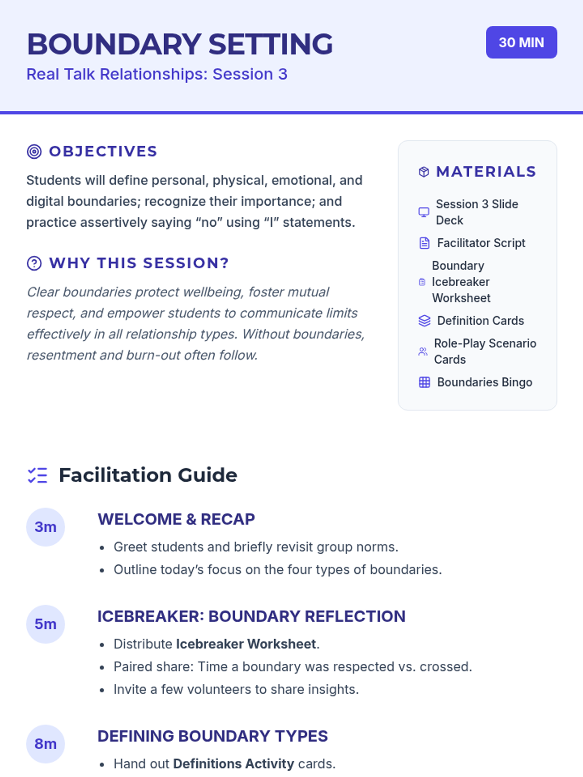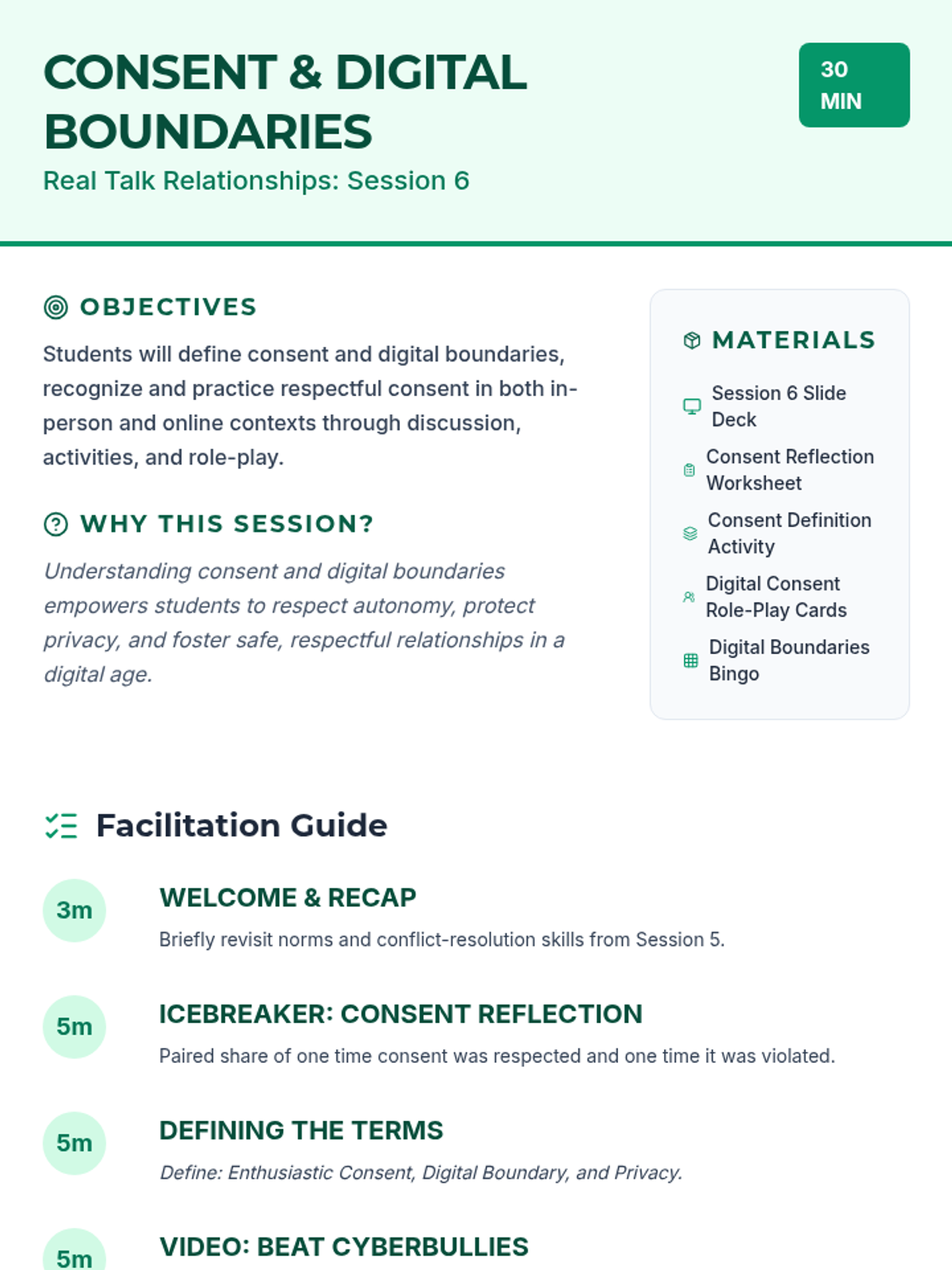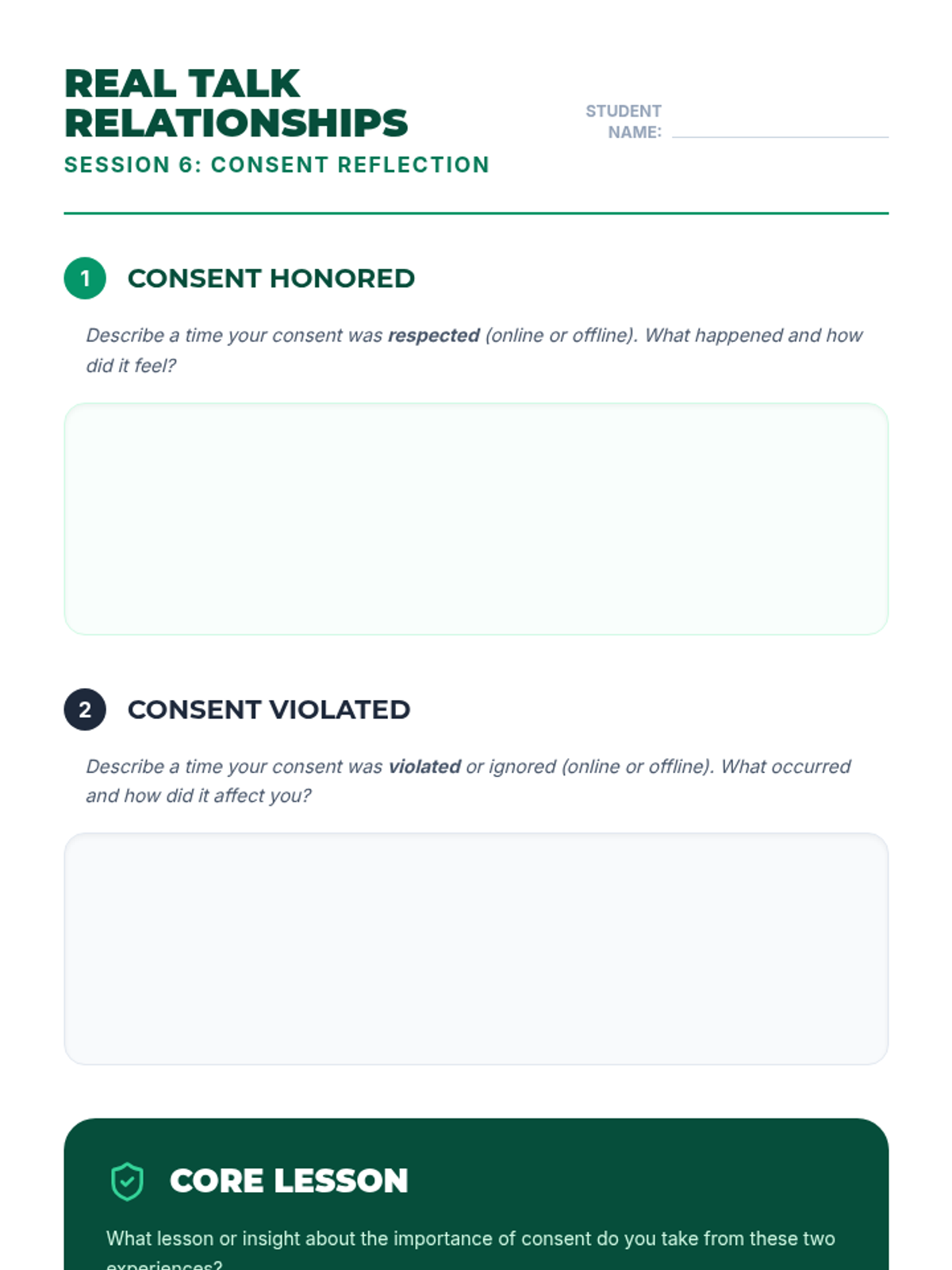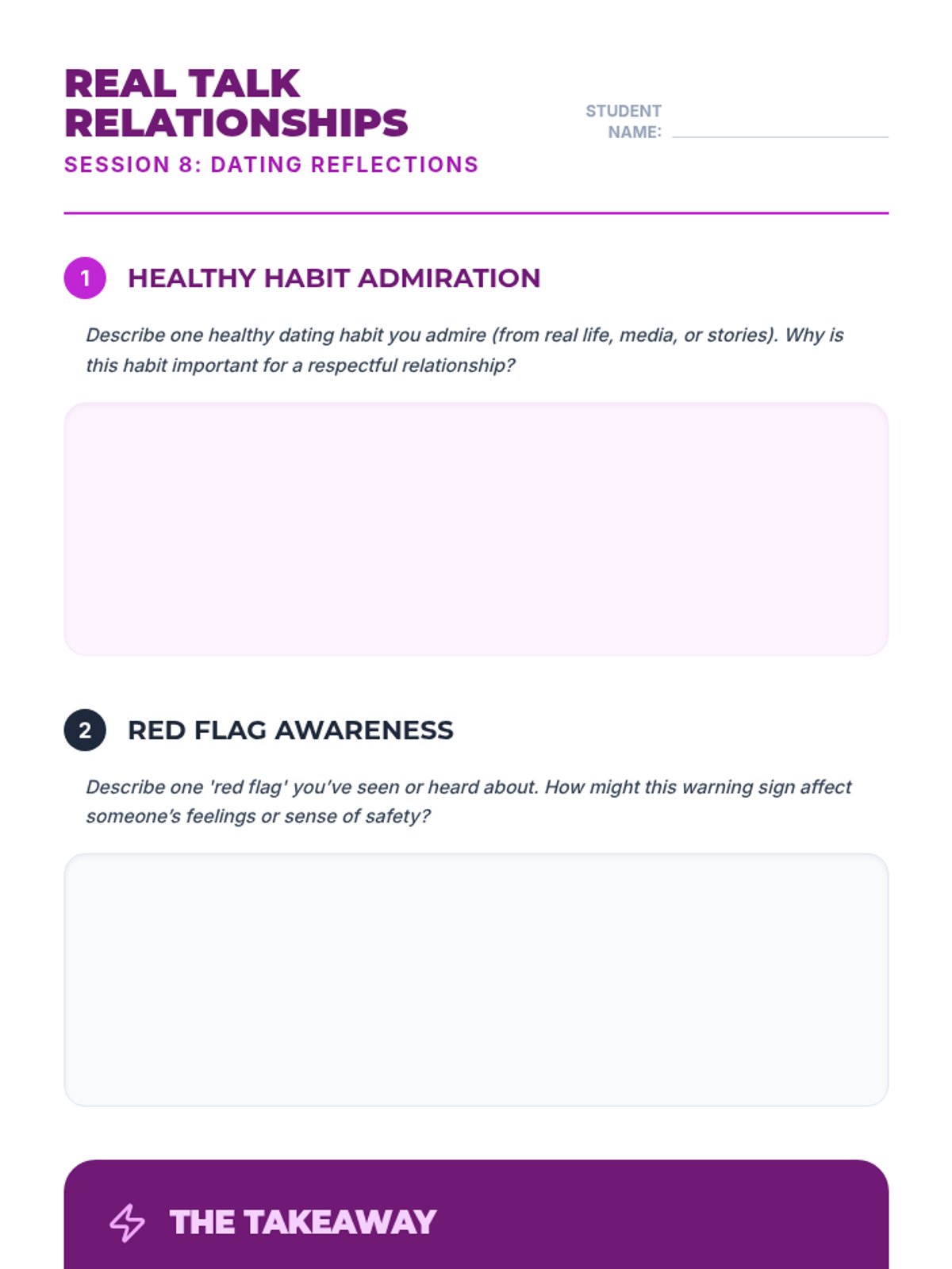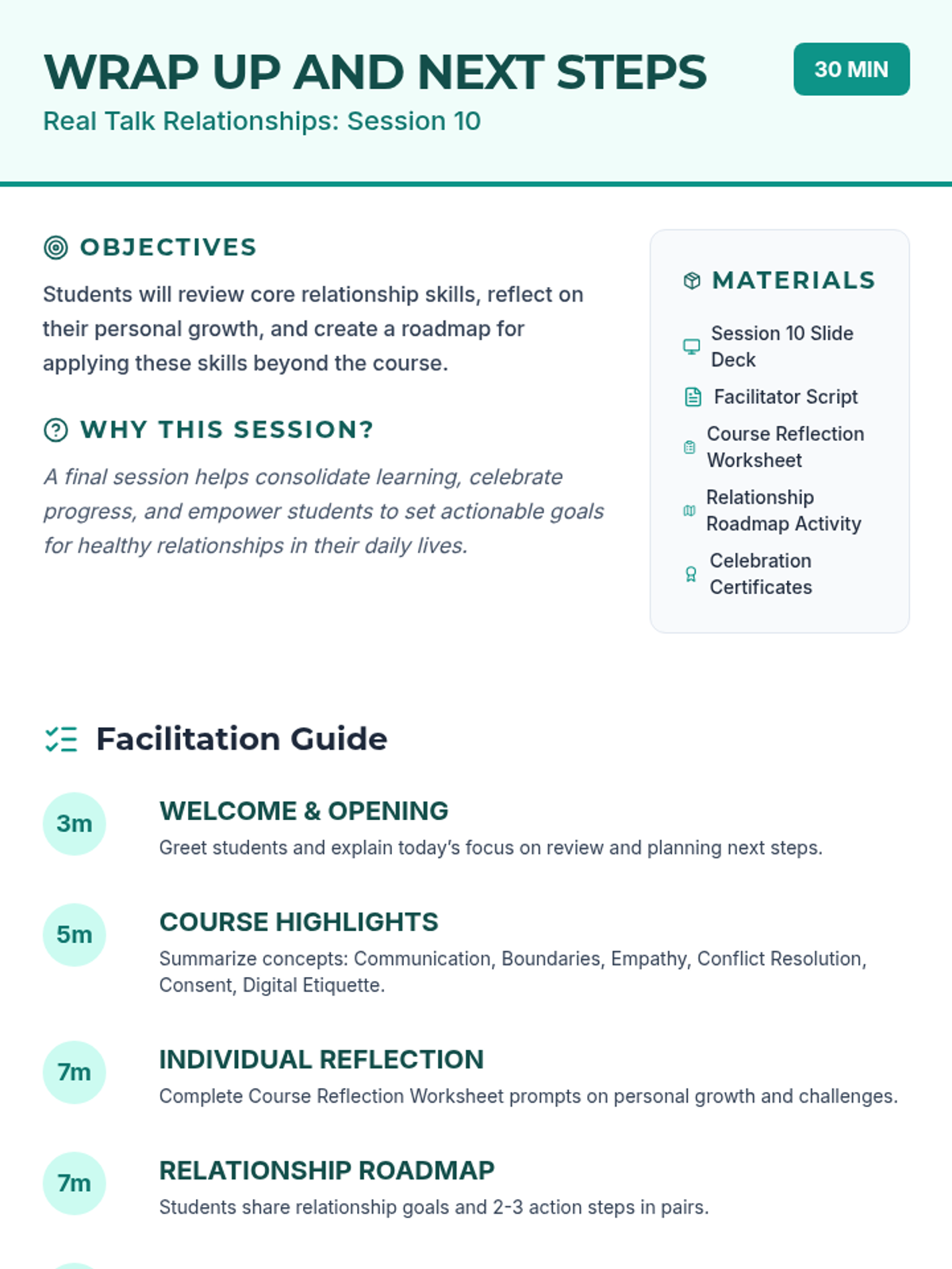 A 10-session course for high school students focused on building and maintaining healthy romantic, platonic, and digital relationships through communication, boundaries, and empathy.