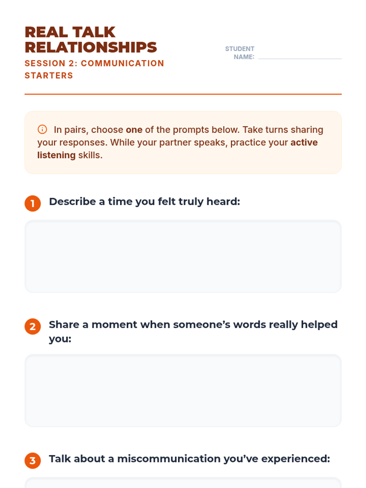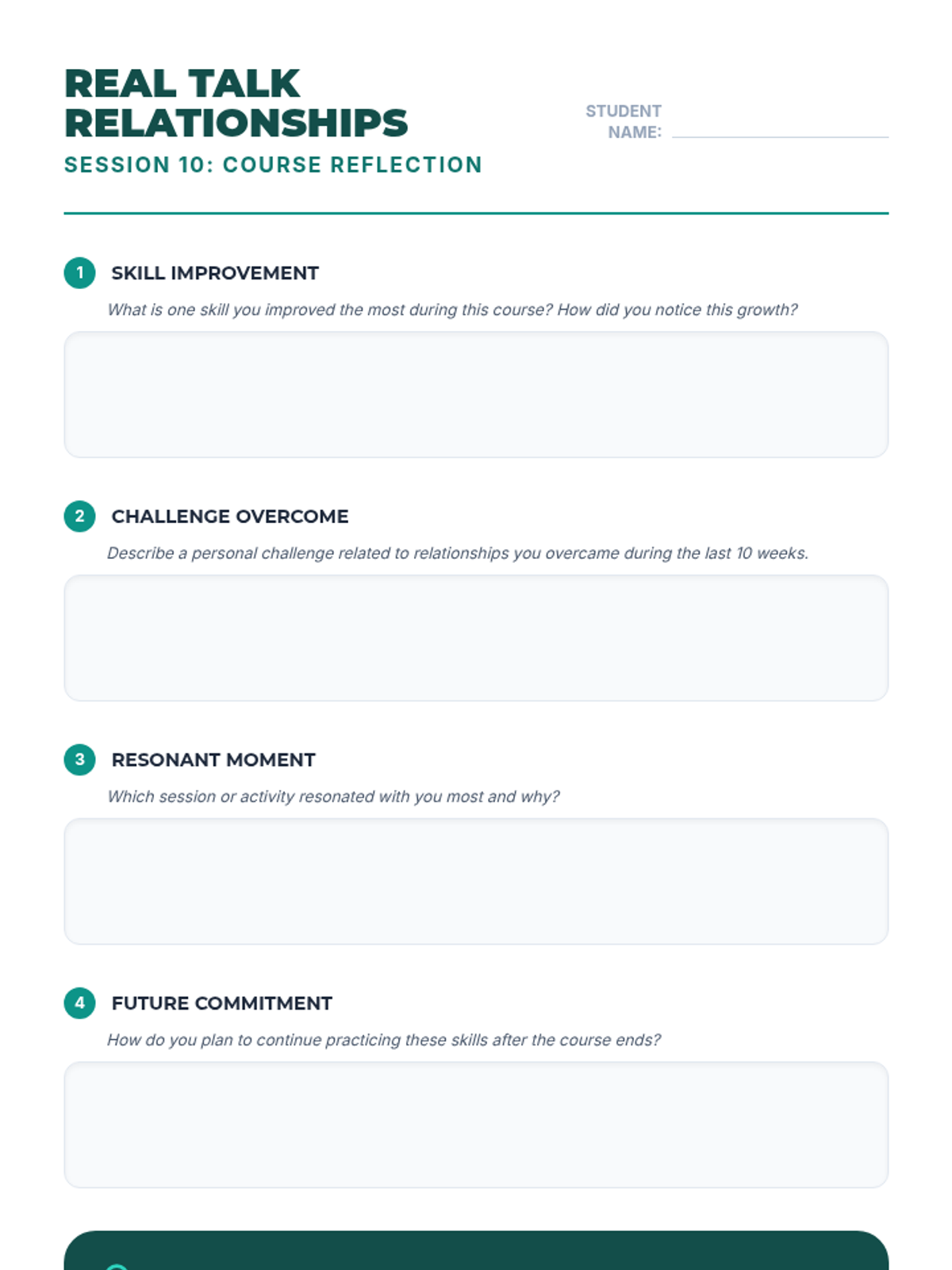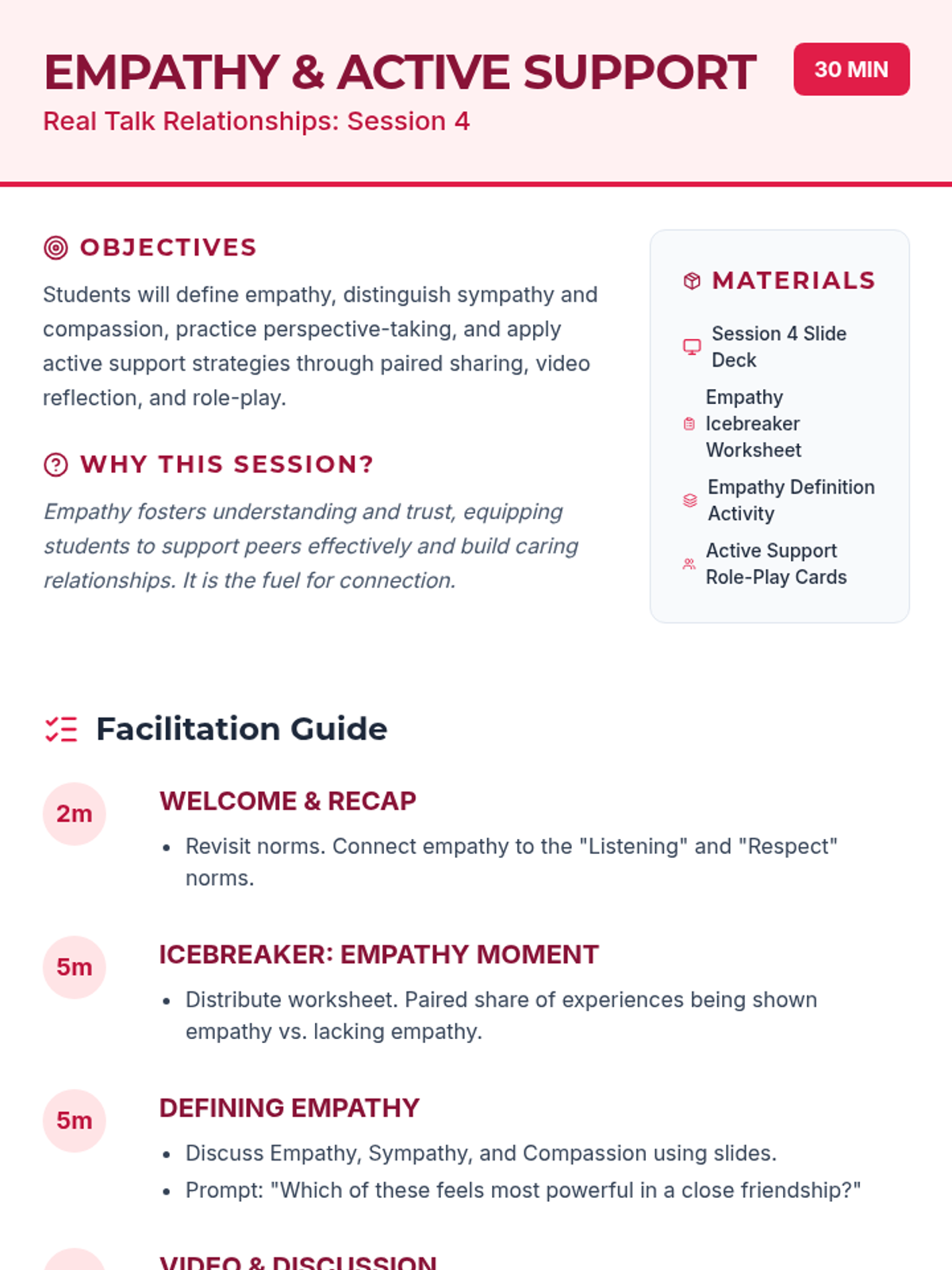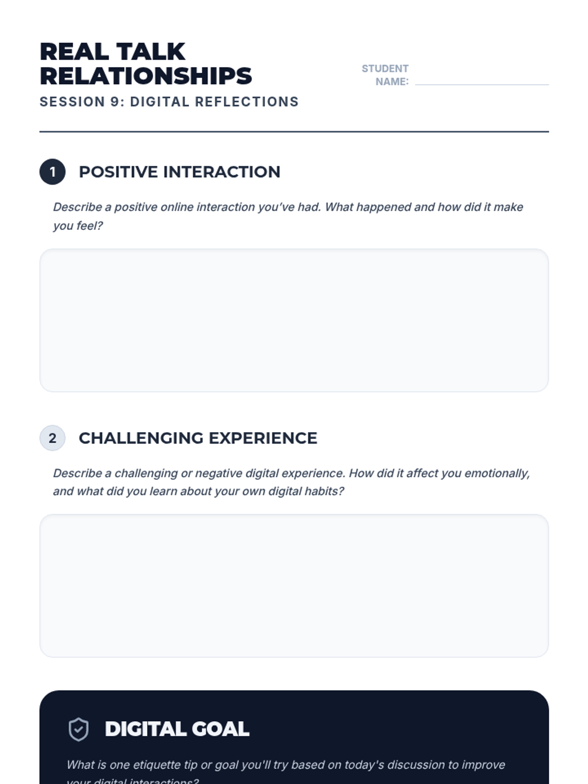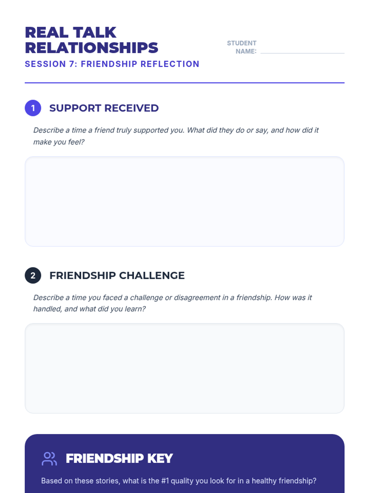 A 10-session course for high school students focused on building and maintaining healthy romantic, platonic, and digital relationships through communication, boundaries, and empathy.