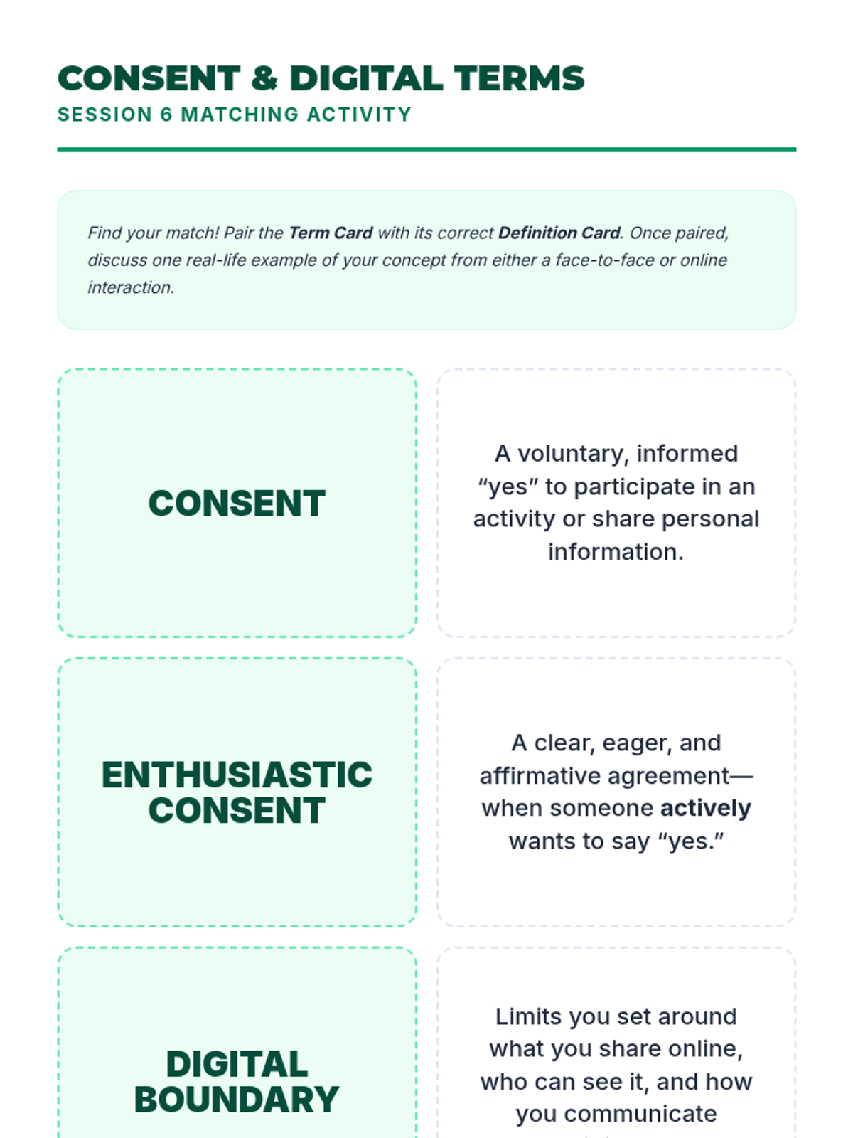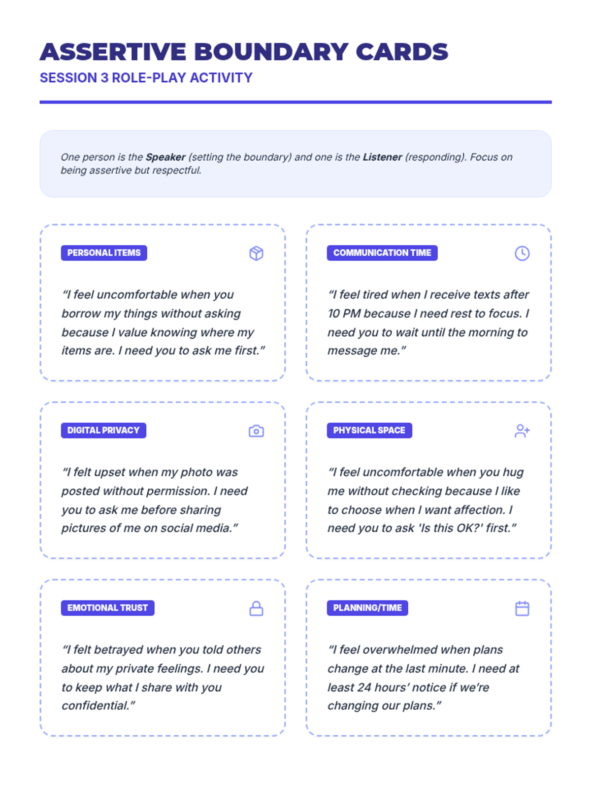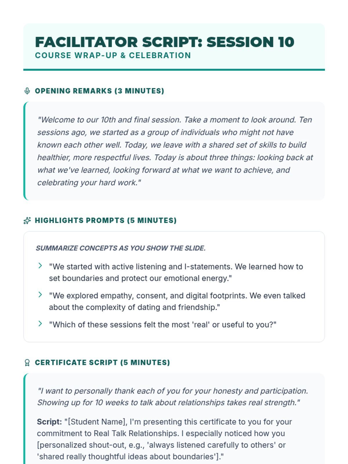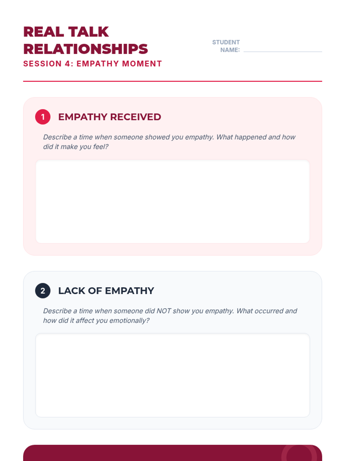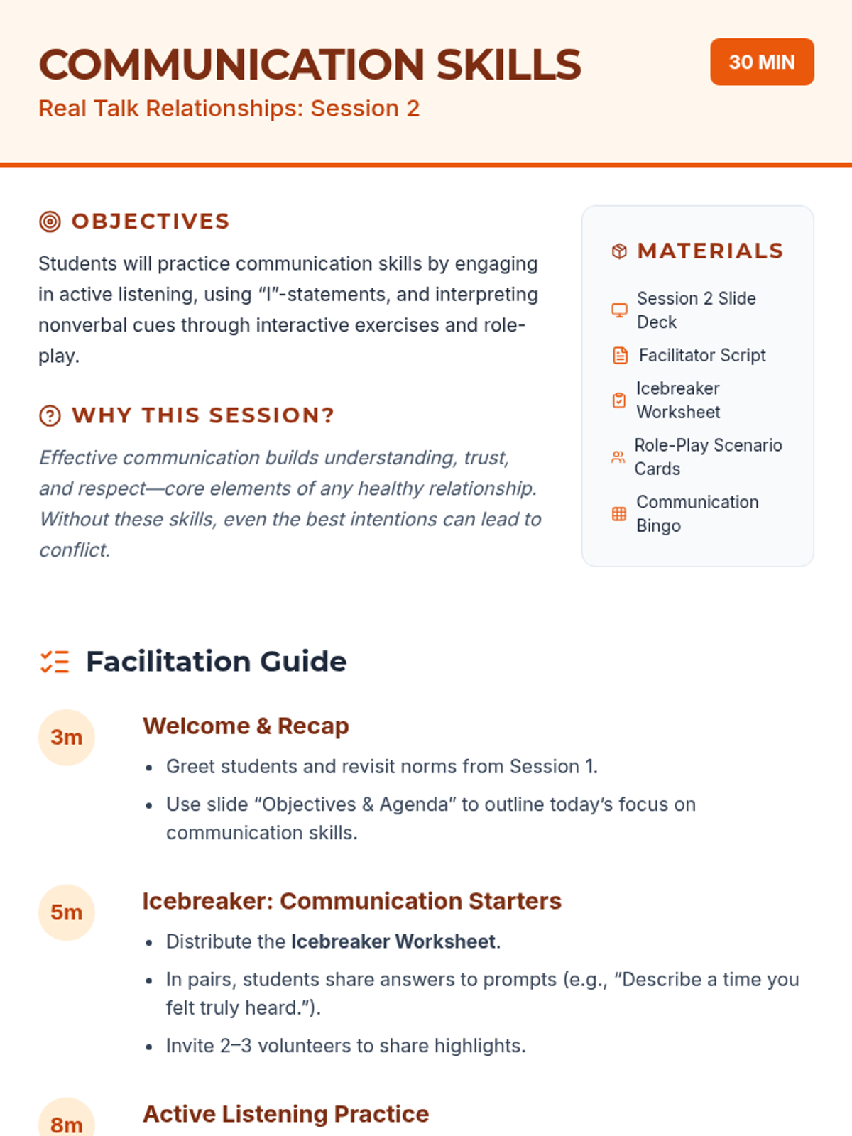 A 10-session course for high school students focused on building and maintaining healthy romantic, platonic, and digital relationships through communication, boundaries, and empathy.