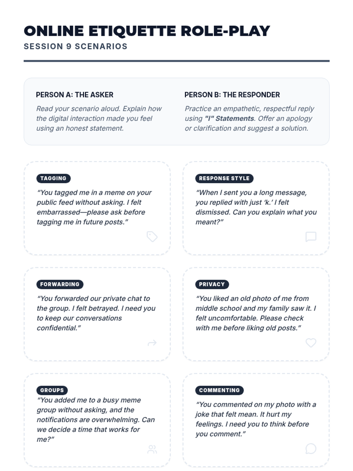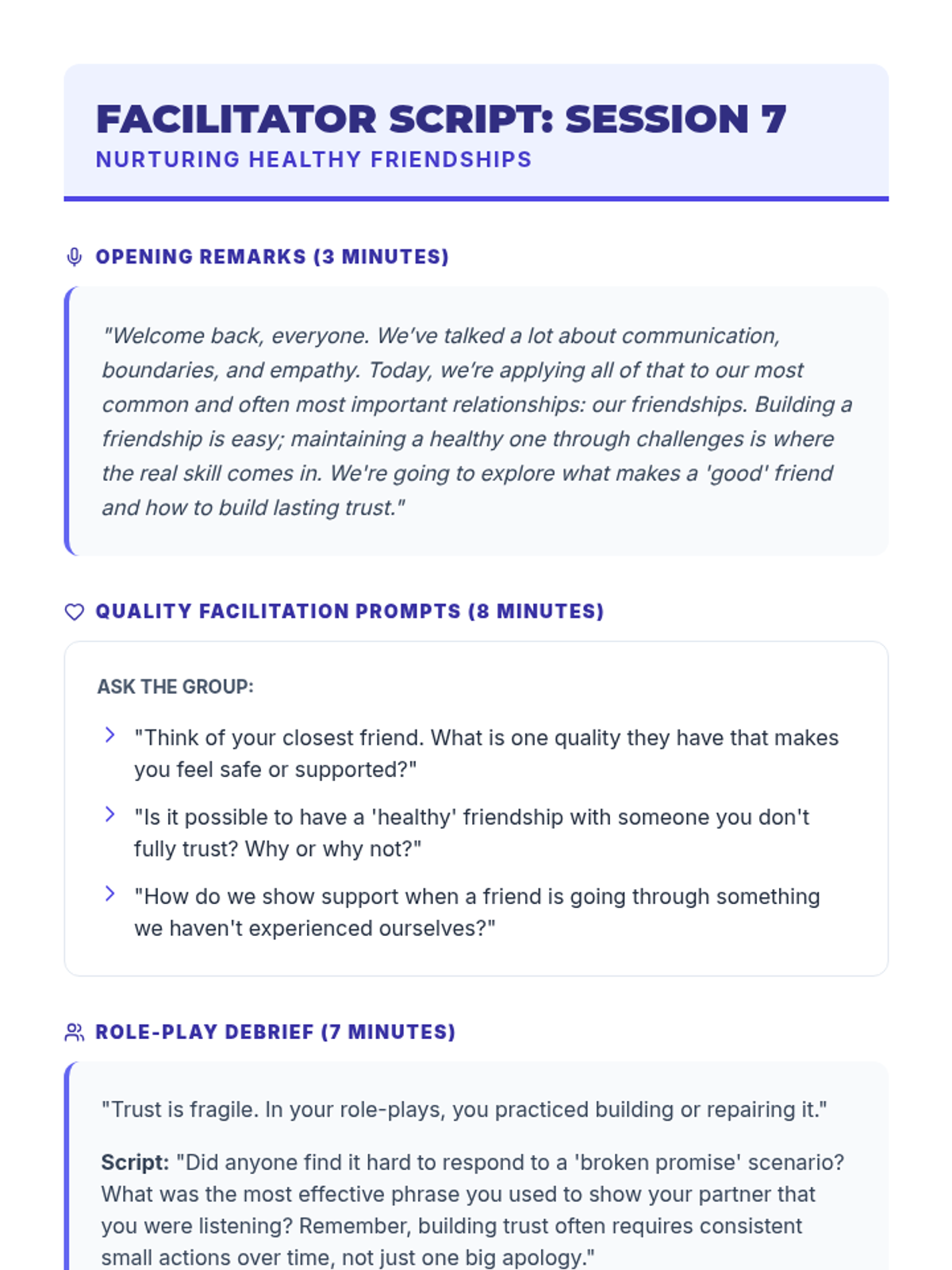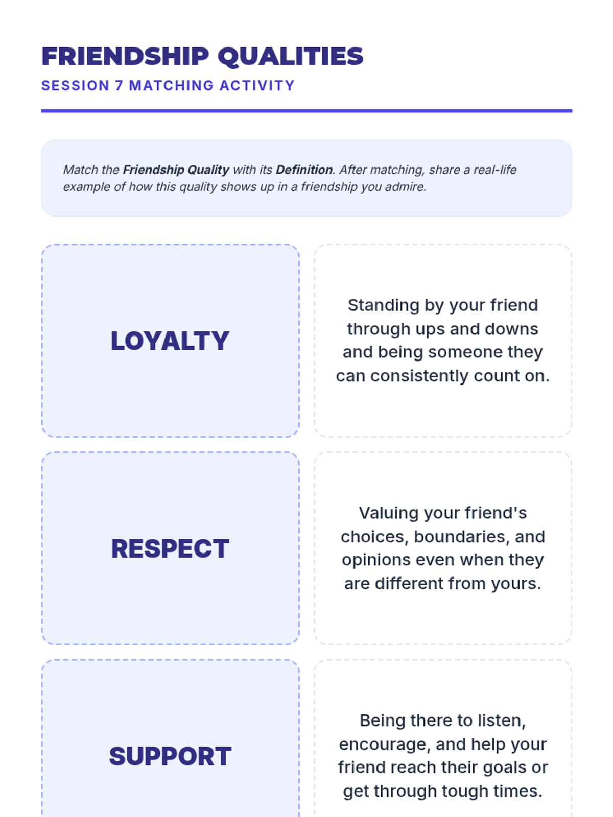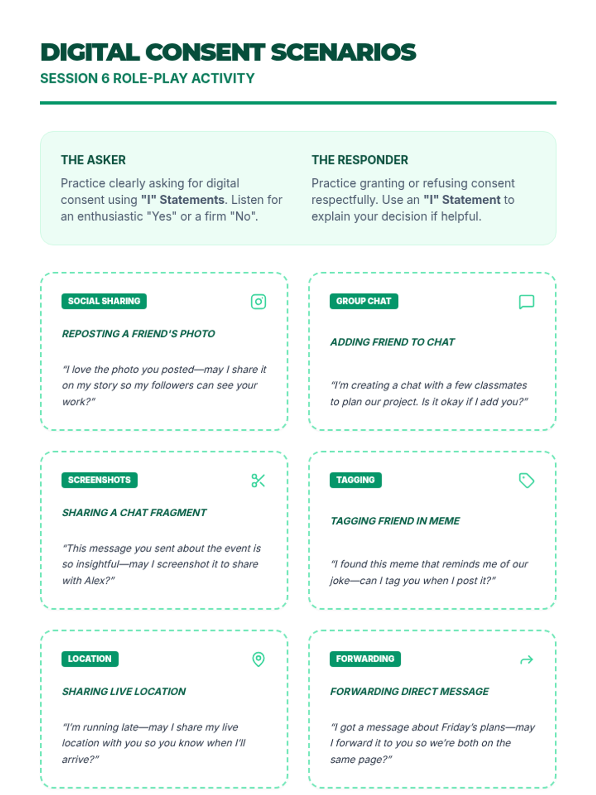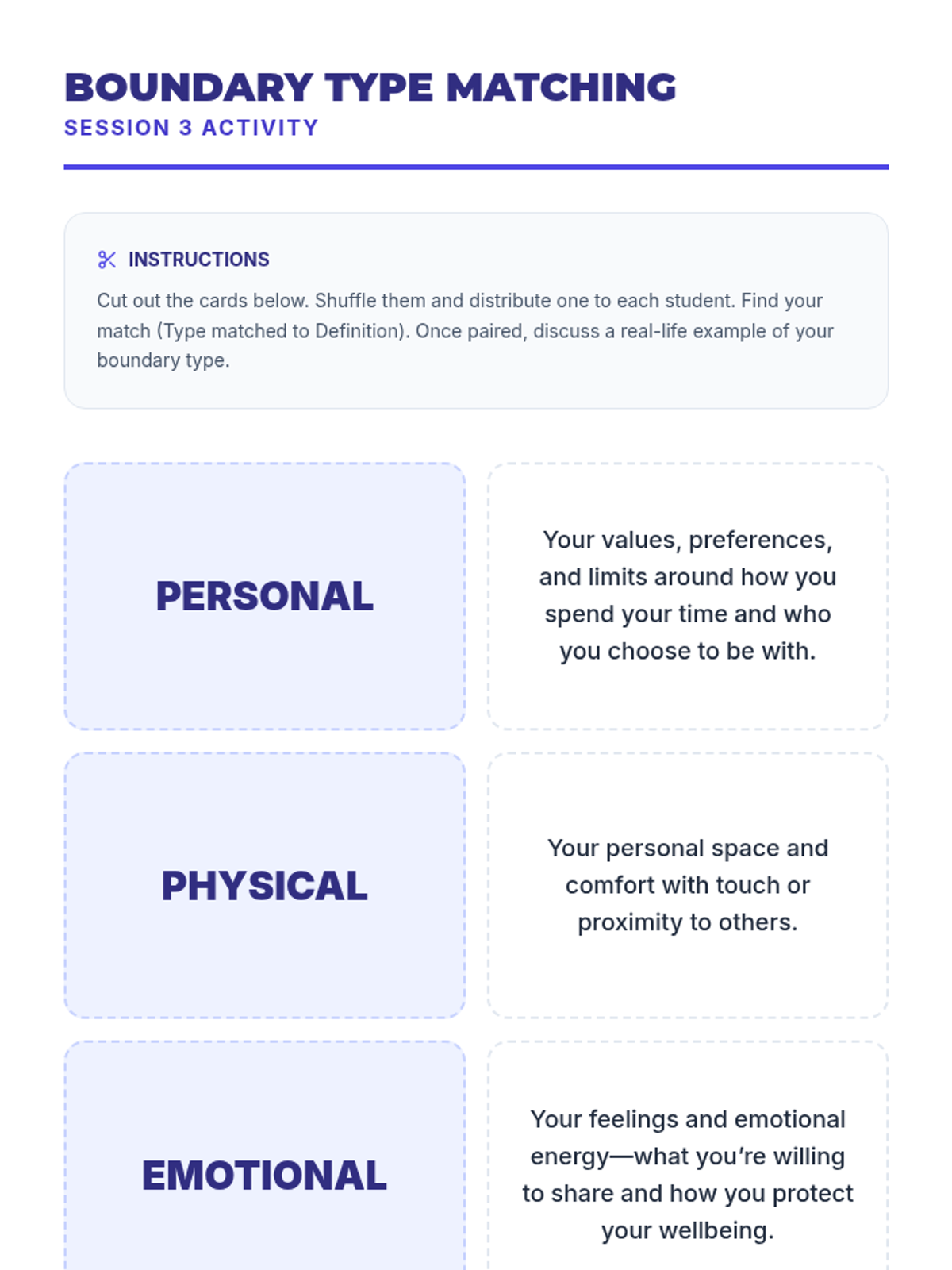 A 10-session course for high school students focused on building and maintaining healthy romantic, platonic, and digital relationships through communication, boundaries, and empathy.
