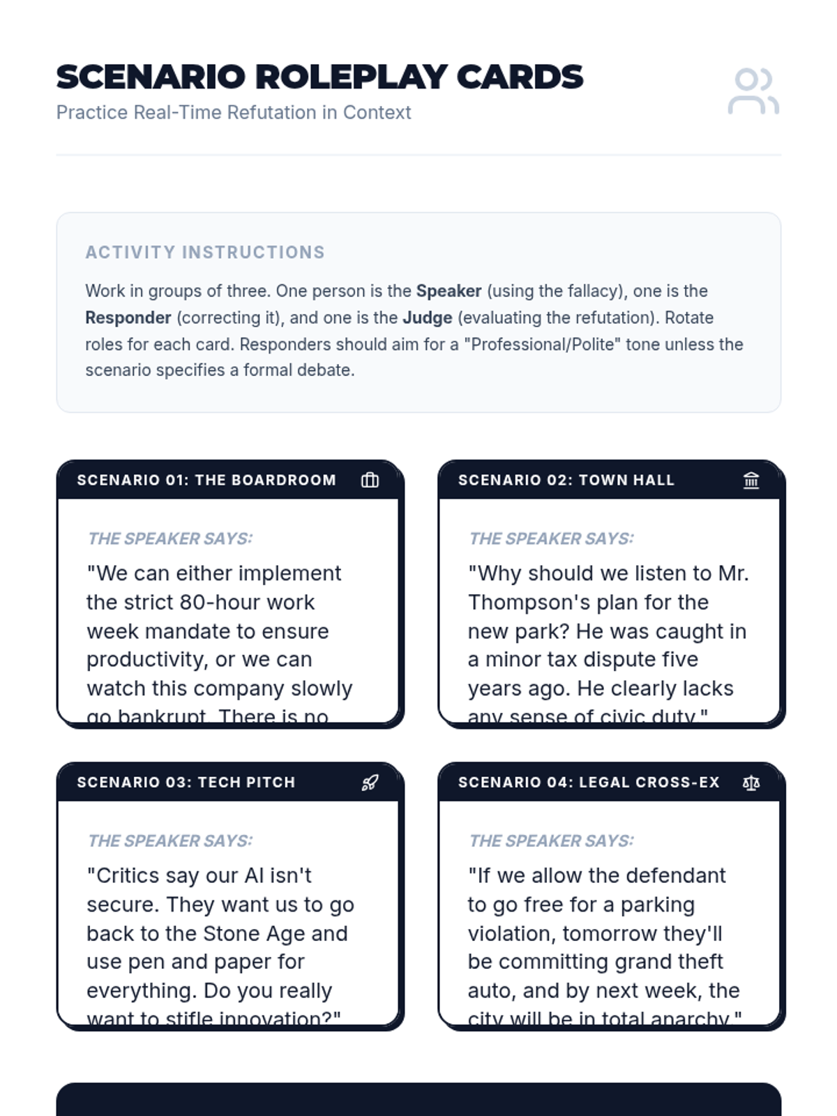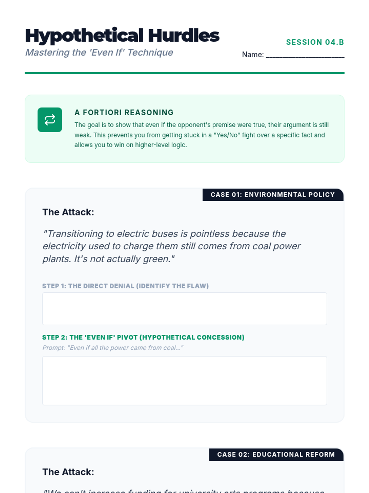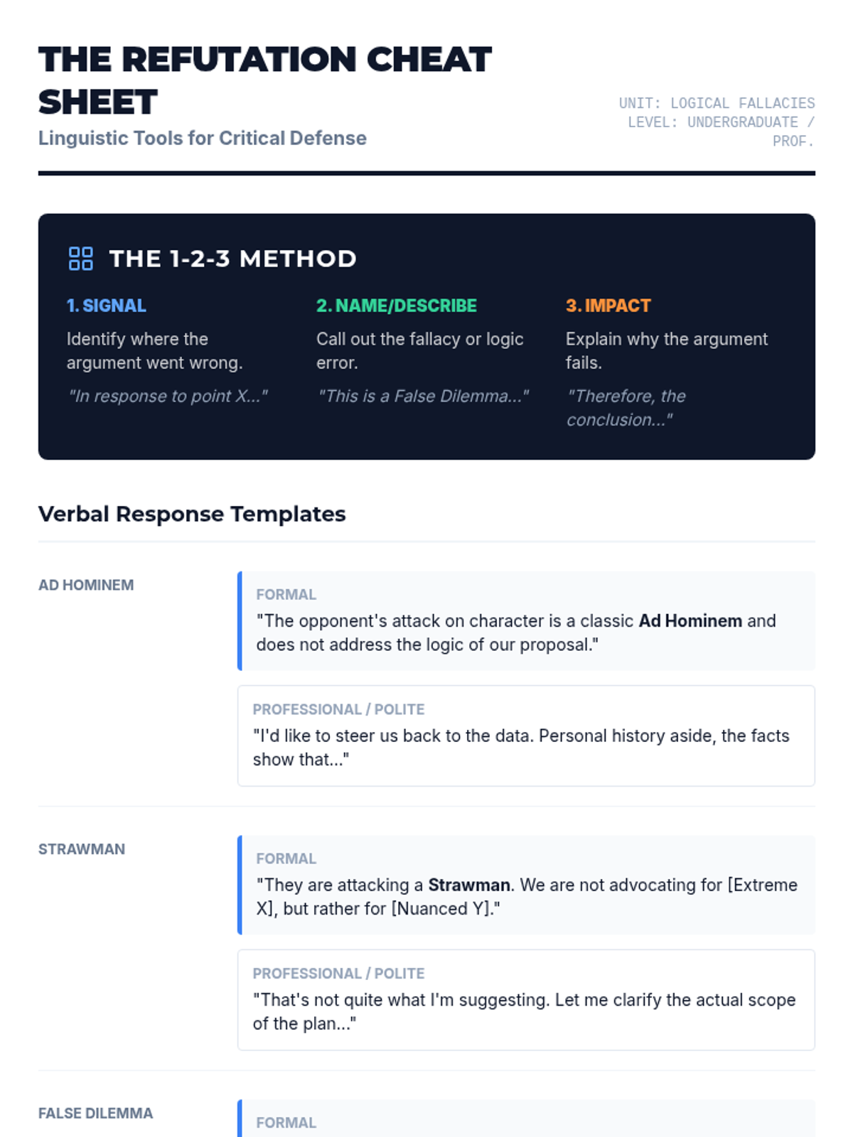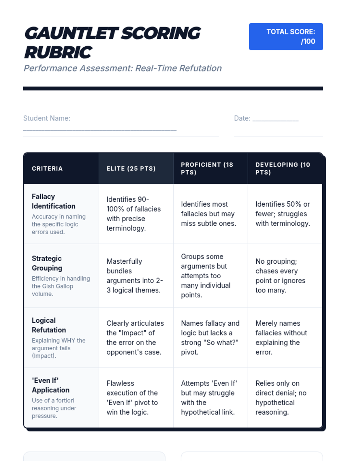 A comprehensive sequence designed for undergraduate students to master the art of real-time fallacy identification and verbal refutation. Students transition from foundational argument tracking to advanced rhetorical techniques like the 'Even If' strategy, culminating in a live debate-style assessment.