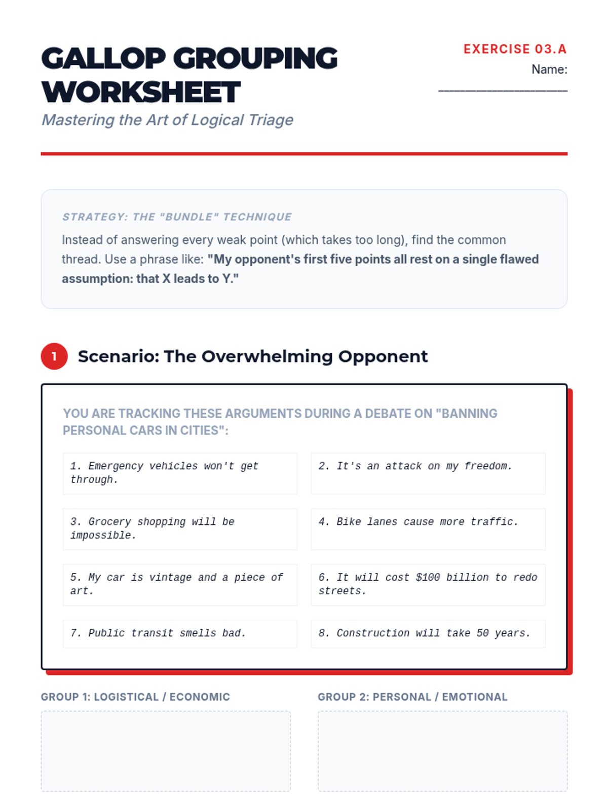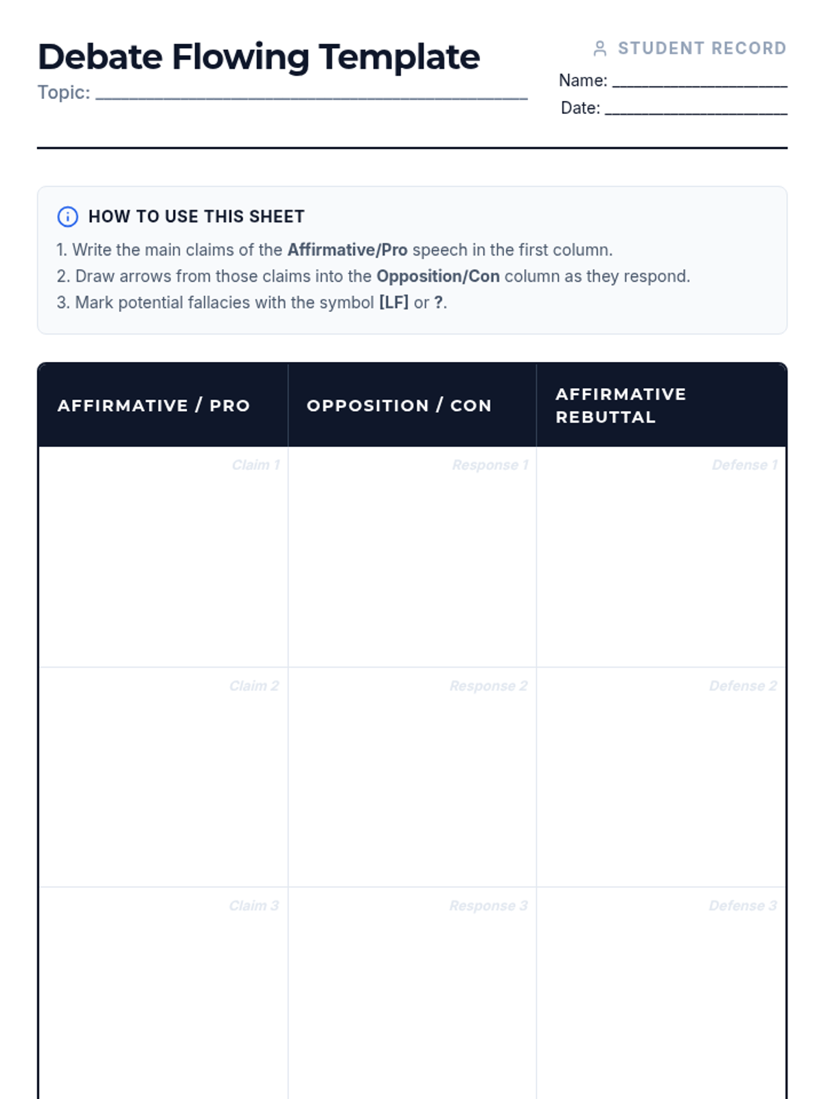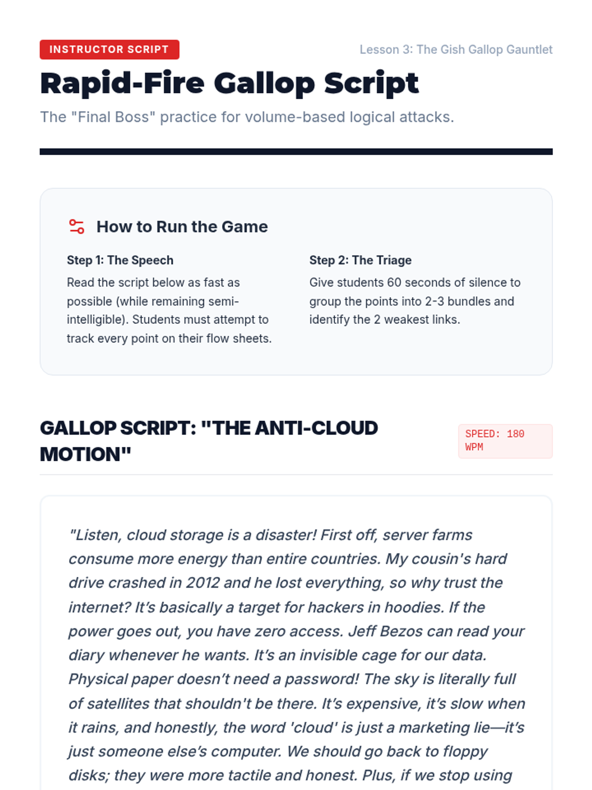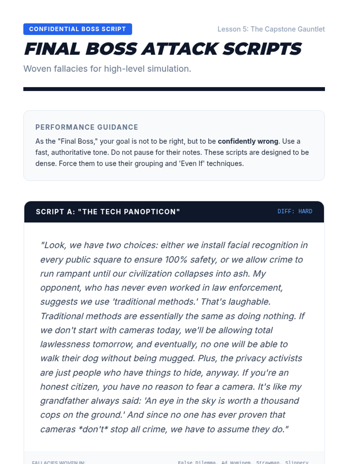 A comprehensive sequence designed for undergraduate students to master the art of real-time fallacy identification and verbal refutation. Students transition from foundational argument tracking to advanced rhetorical techniques like the 'Even If' strategy, culminating in a live debate-style assessment.