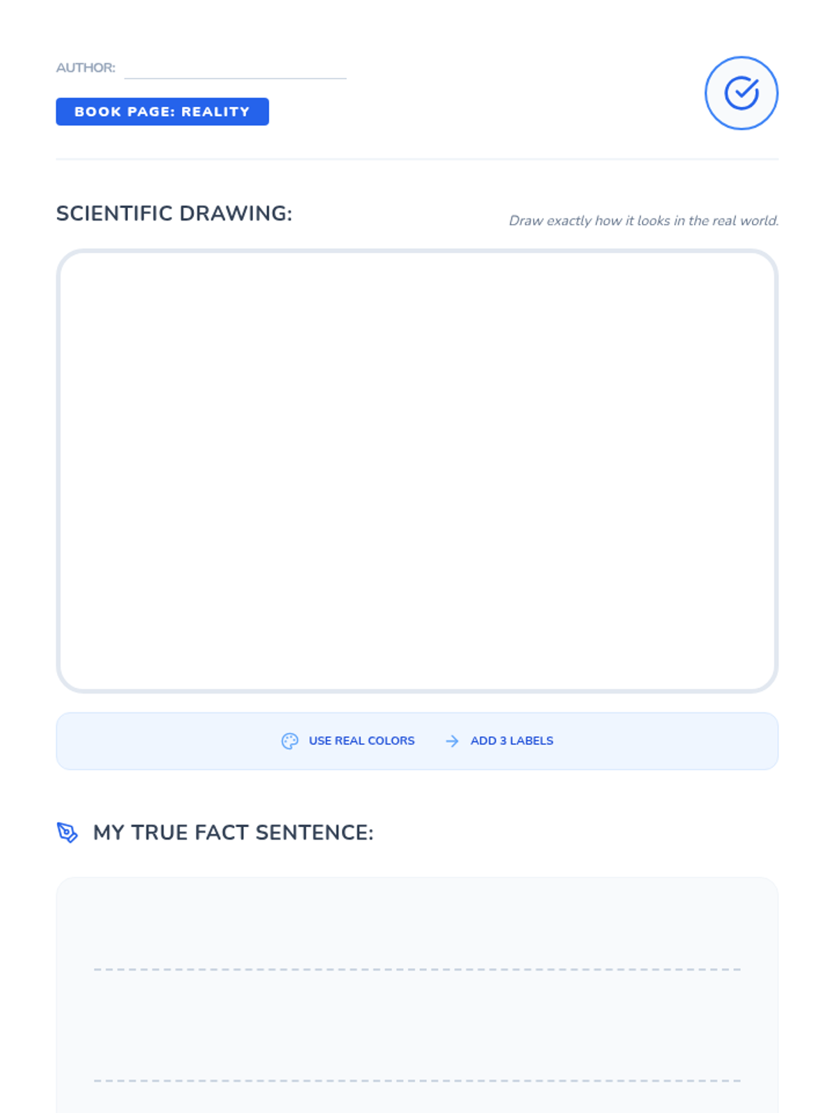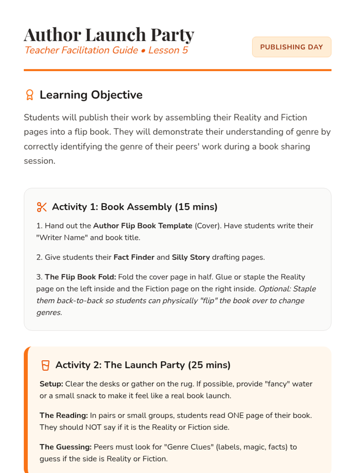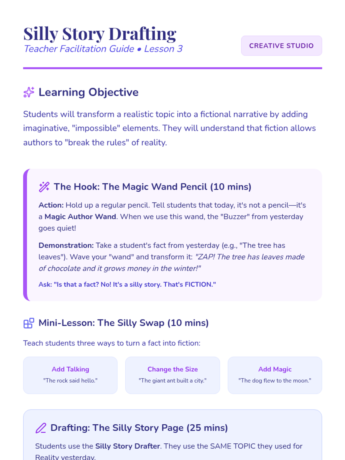 A project-based ELA sequence where 1st Grade students learn the difference between reality and fiction by writing their own 'True Fact' and 'Silly Story' pages. Students explore creative choices authors make to teach truth or tell imaginative tales.