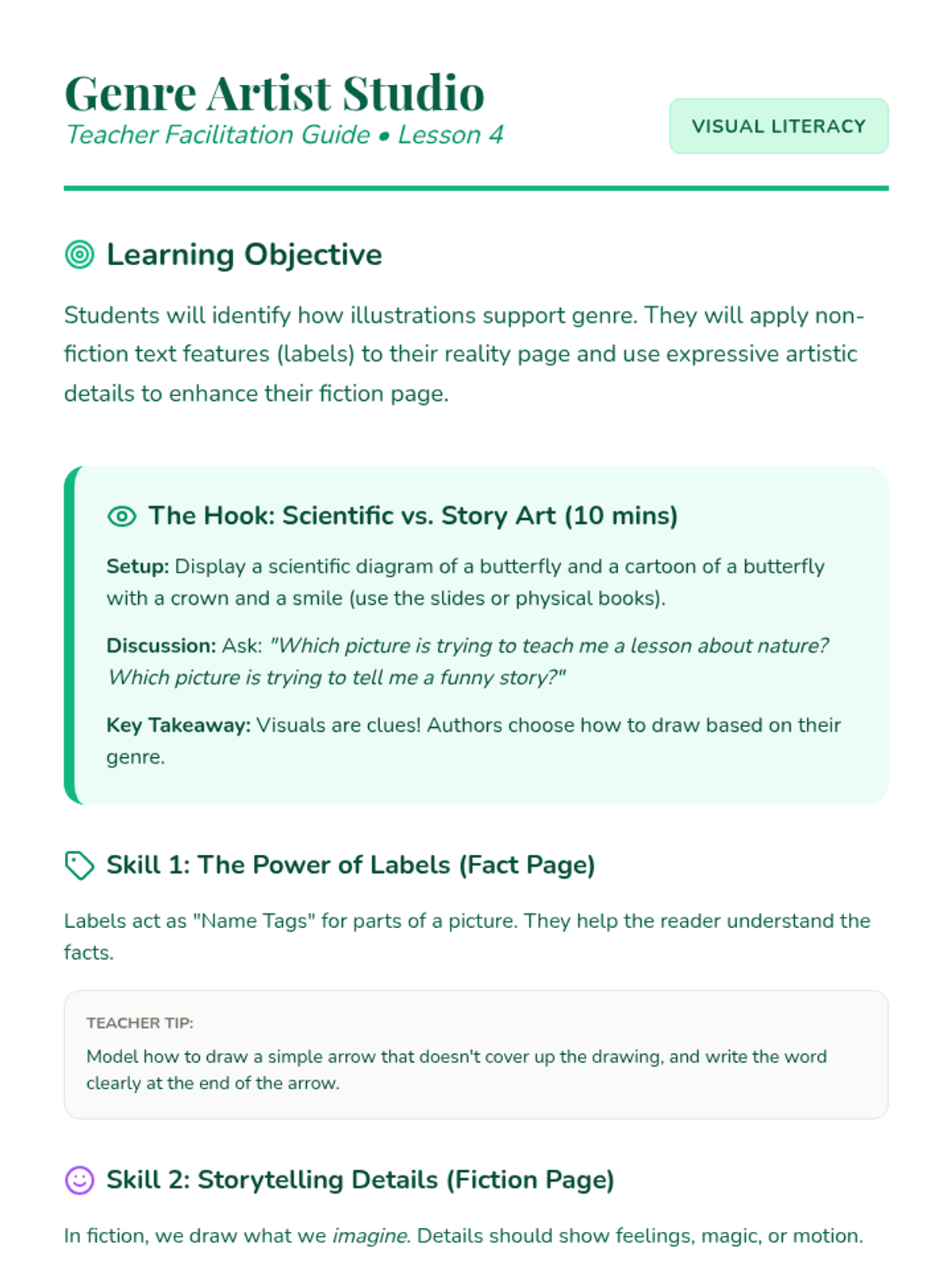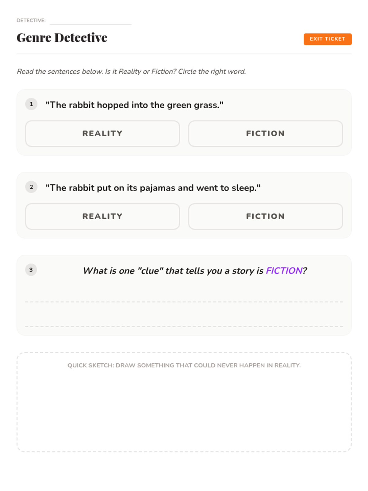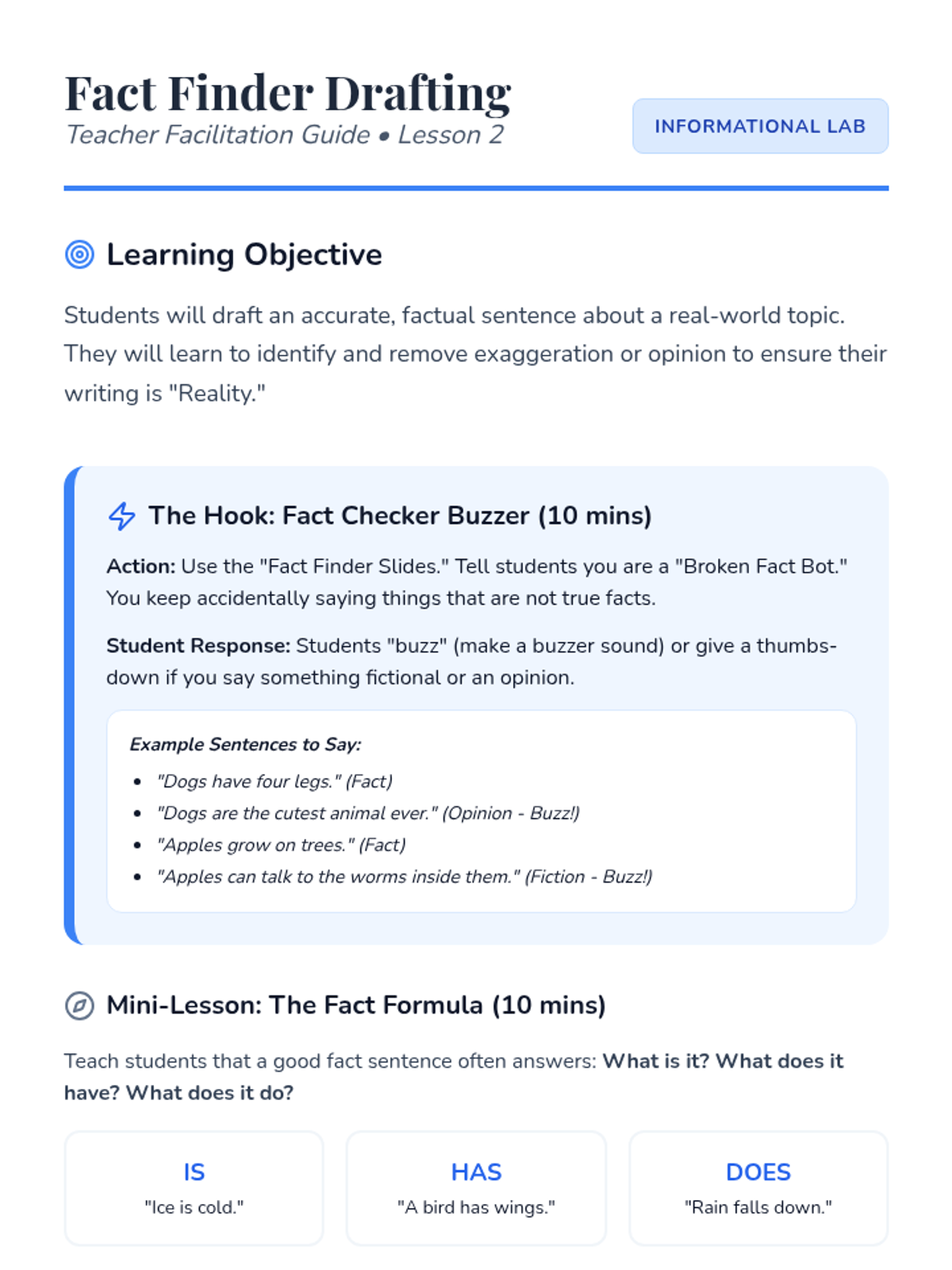 A project-based ELA sequence where 1st Grade students learn the difference between reality and fiction by writing their own 'True Fact' and 'Silly Story' pages. Students explore creative choices authors make to teach truth or tell imaginative tales.
