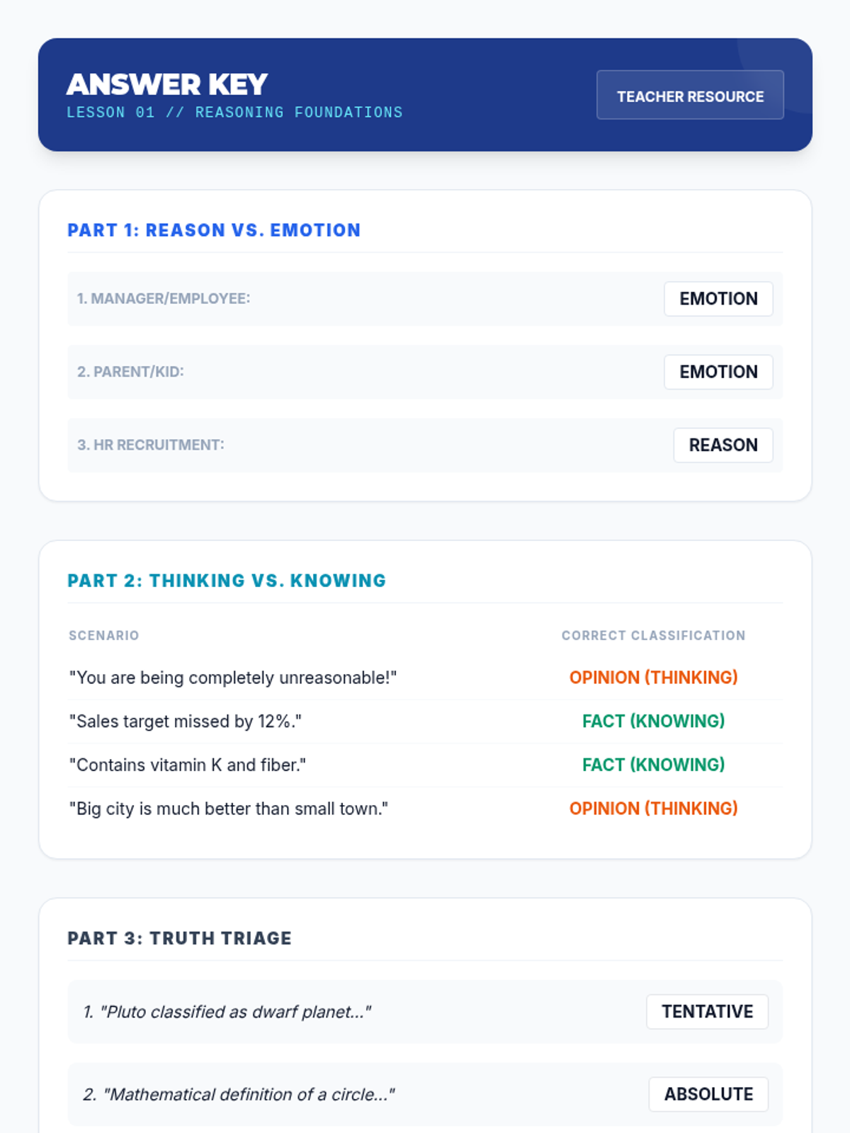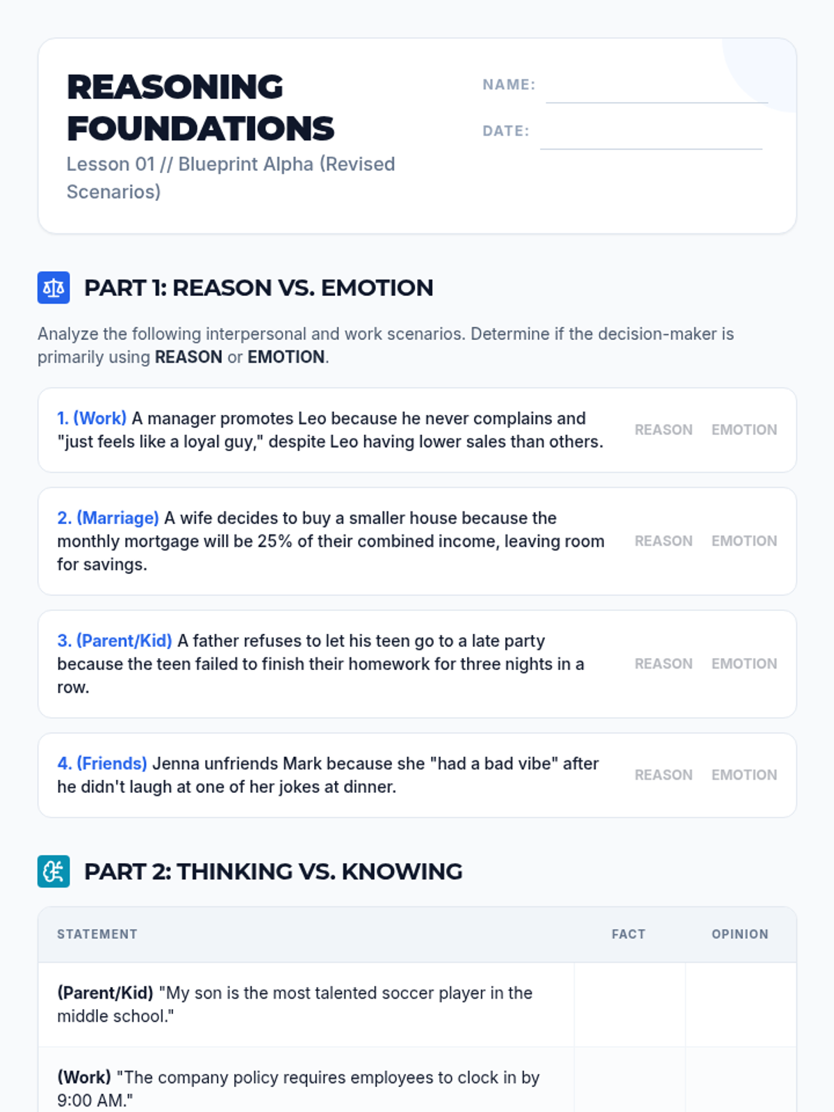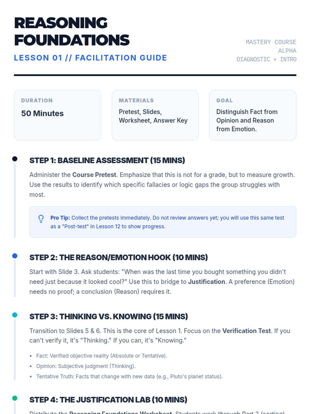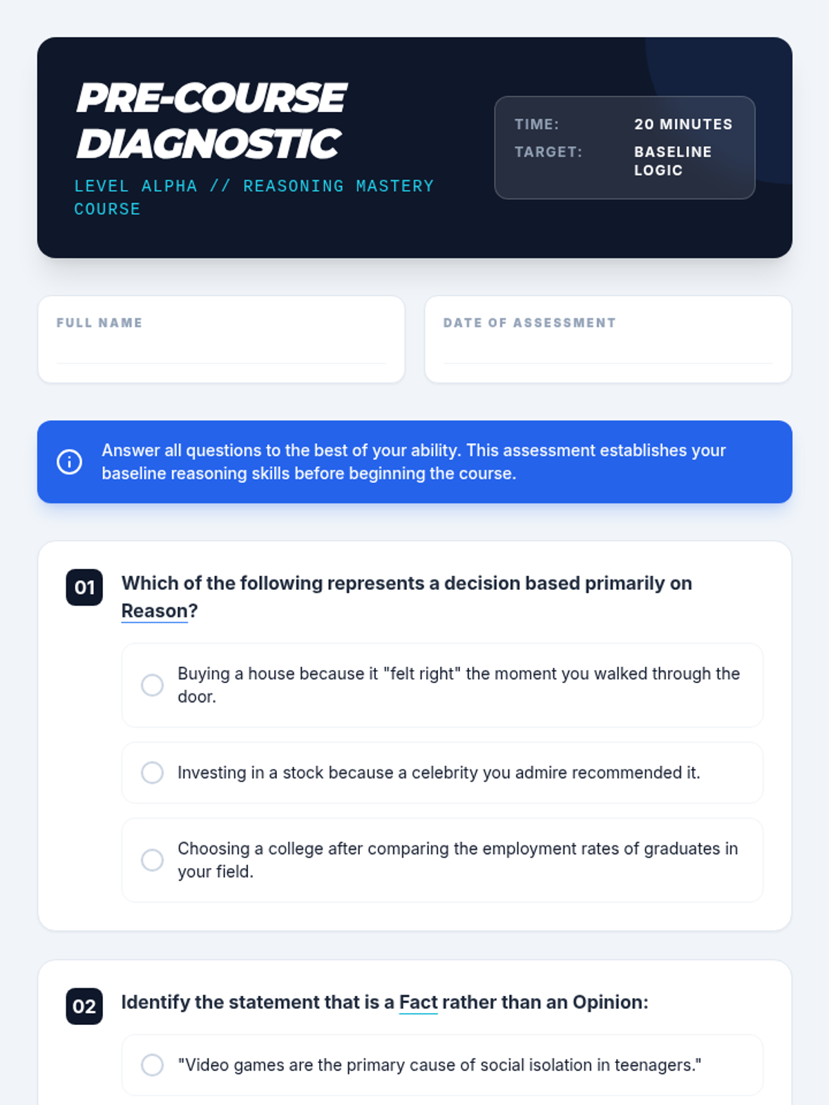 A 12-lesson intensive course on reasoning and critical thinking, aligned with the 'Reasoning Skills Success' framework. This sequence covers everything from the distinction between reason and emotion to complex logical fallacies, statistical analysis, and deductive/inductive logic.