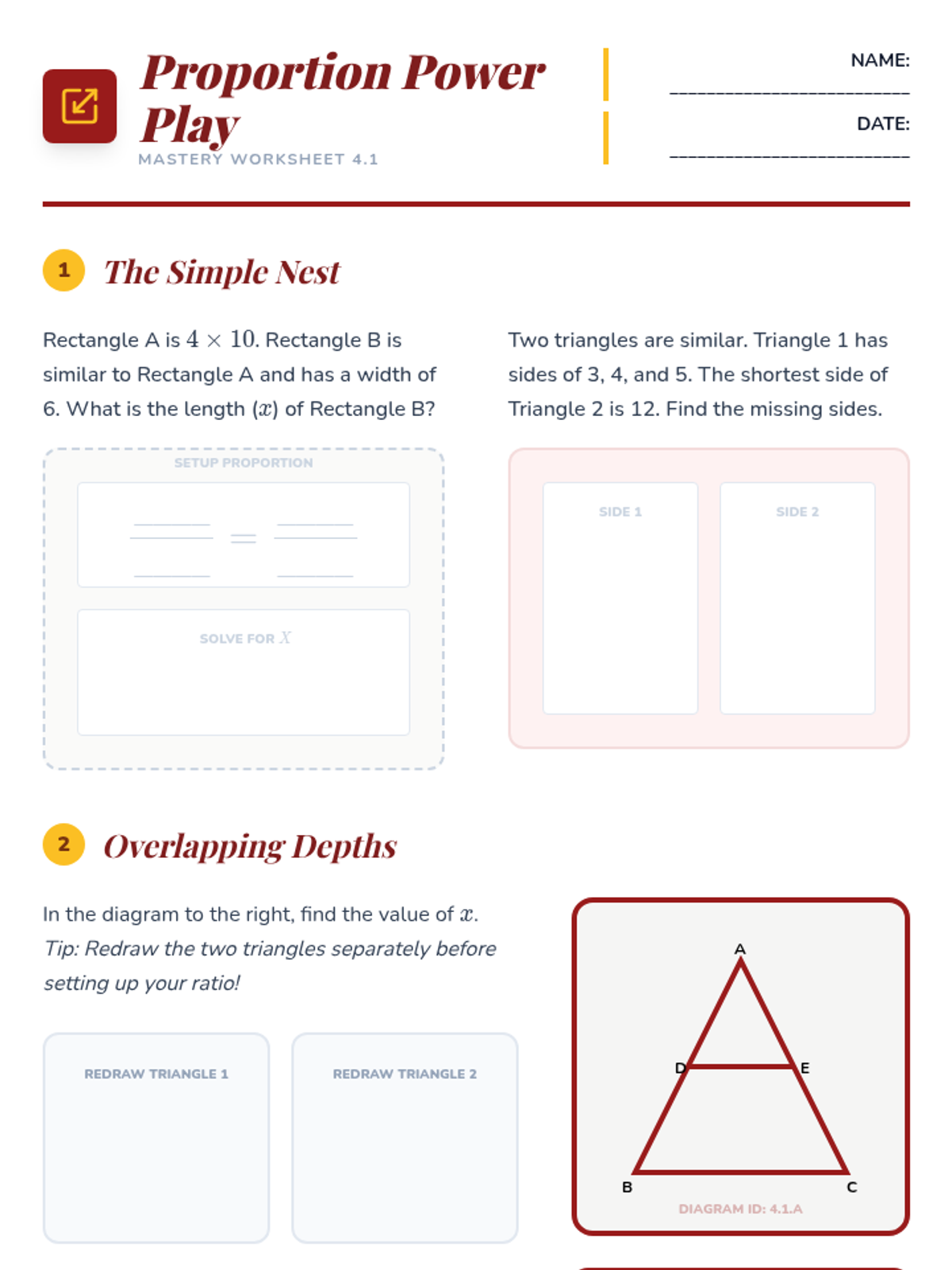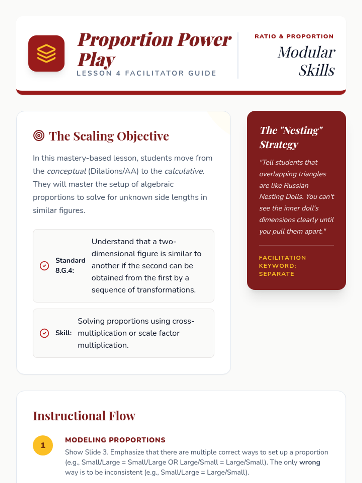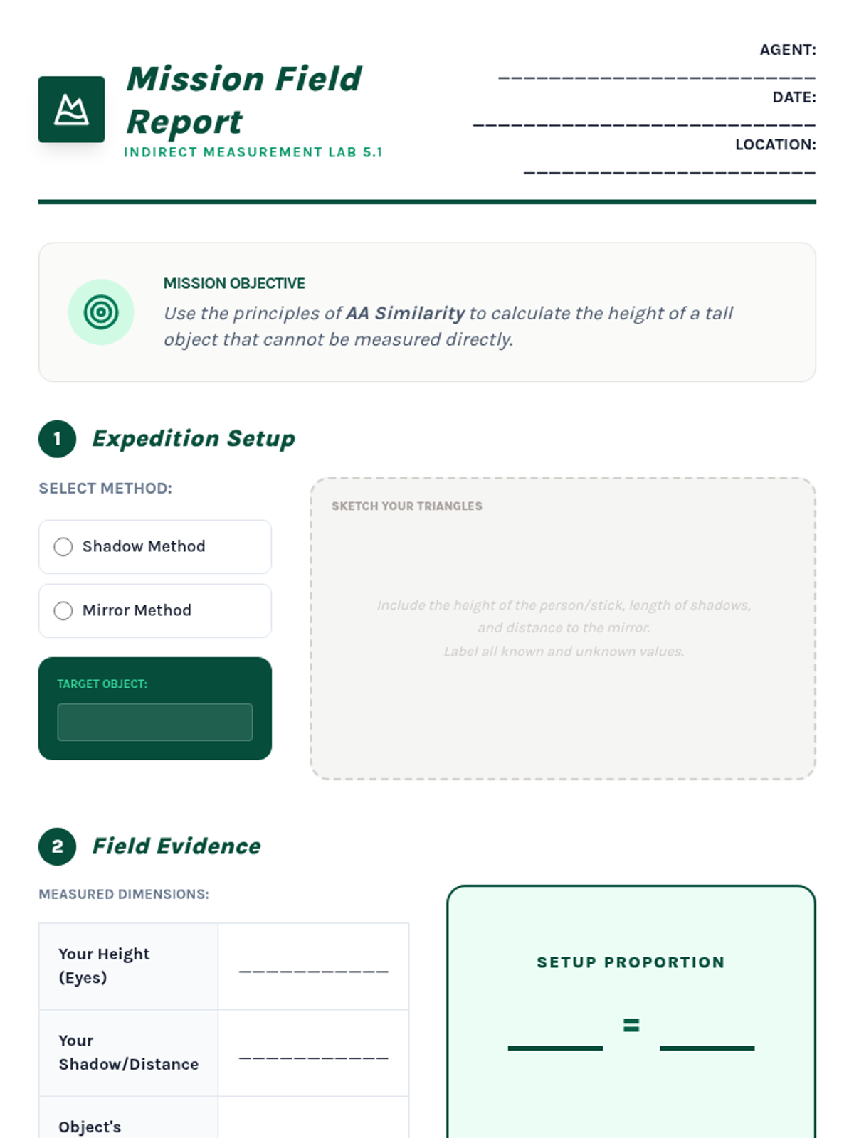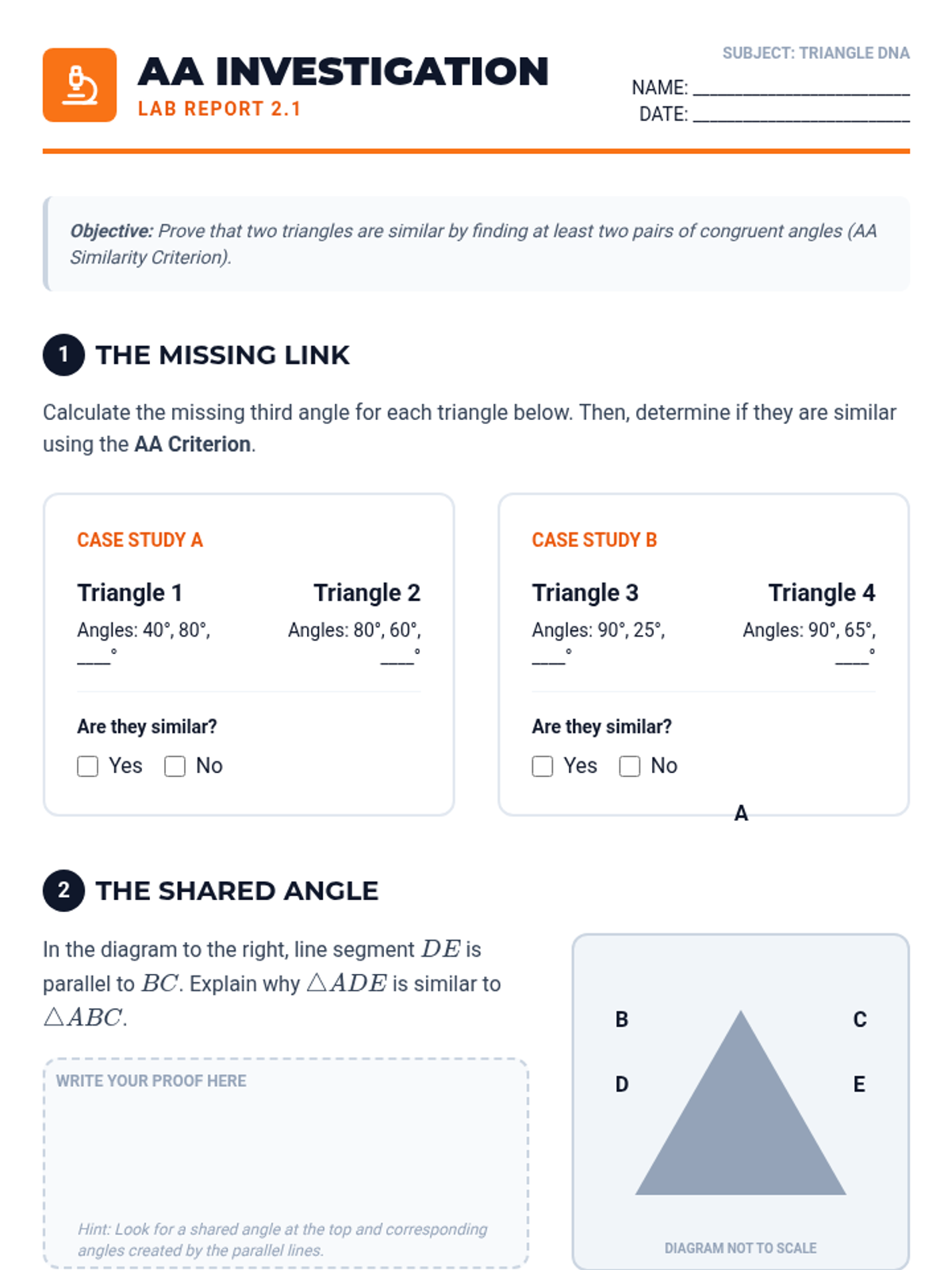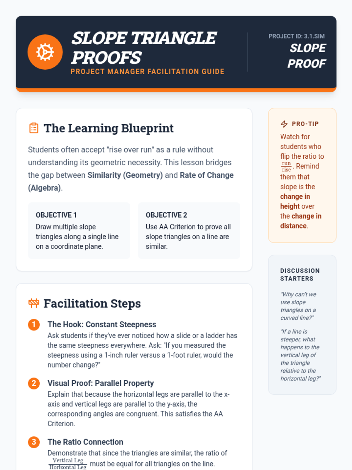 This sequence explores the geometric foundations of similarity, connecting dilations on the coordinate plane to the Angle-Angle criterion. Students will prove the constancy of slope using similar right triangles and apply these theorems to solve real-world indirect measurement problems.