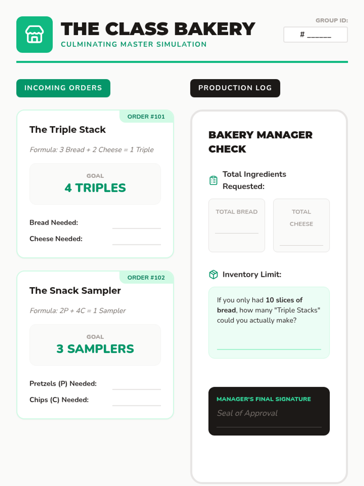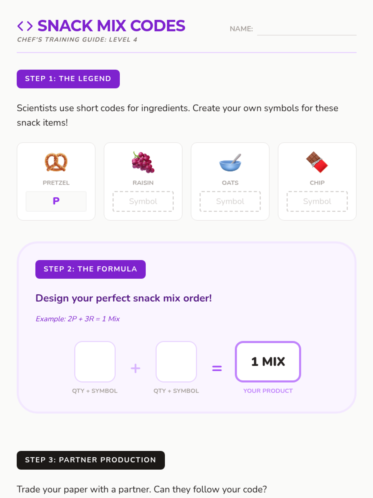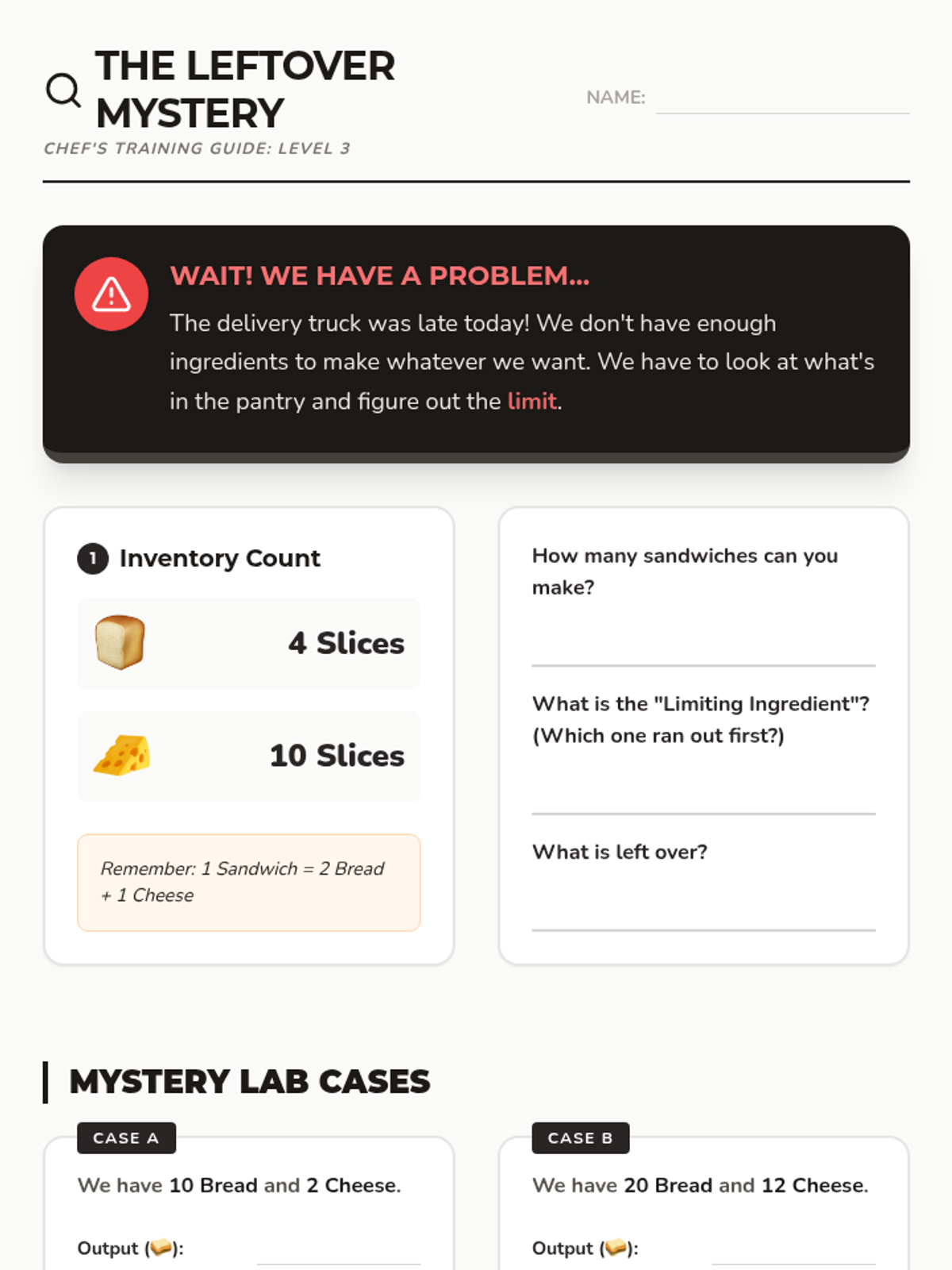 This sequence introduces chemical equations through the analogy of sandwiches and snacks. Students learn about reactants, products, coefficients, and limiting reagents by following and writing 'recipe codes' to fill customer orders.