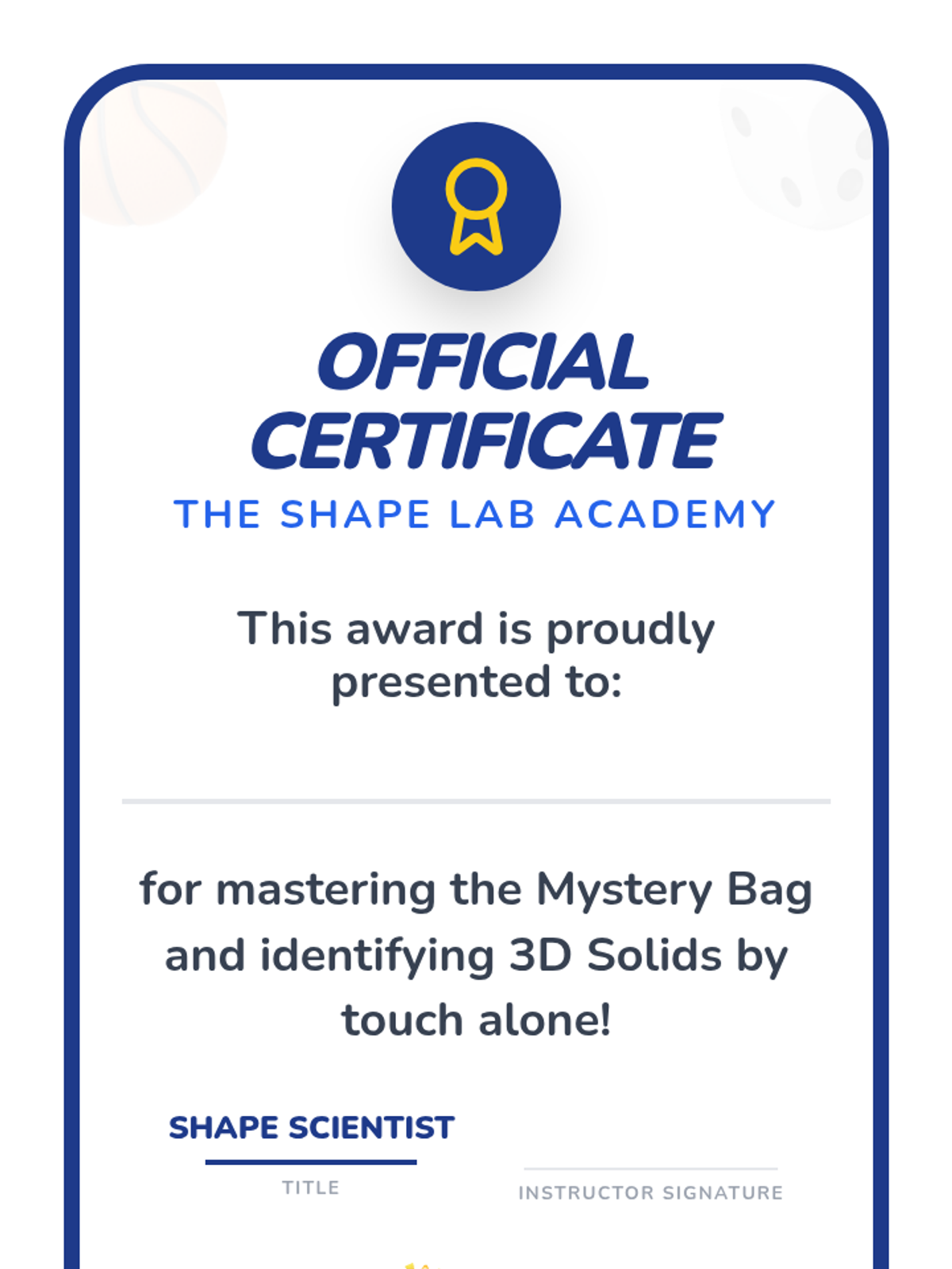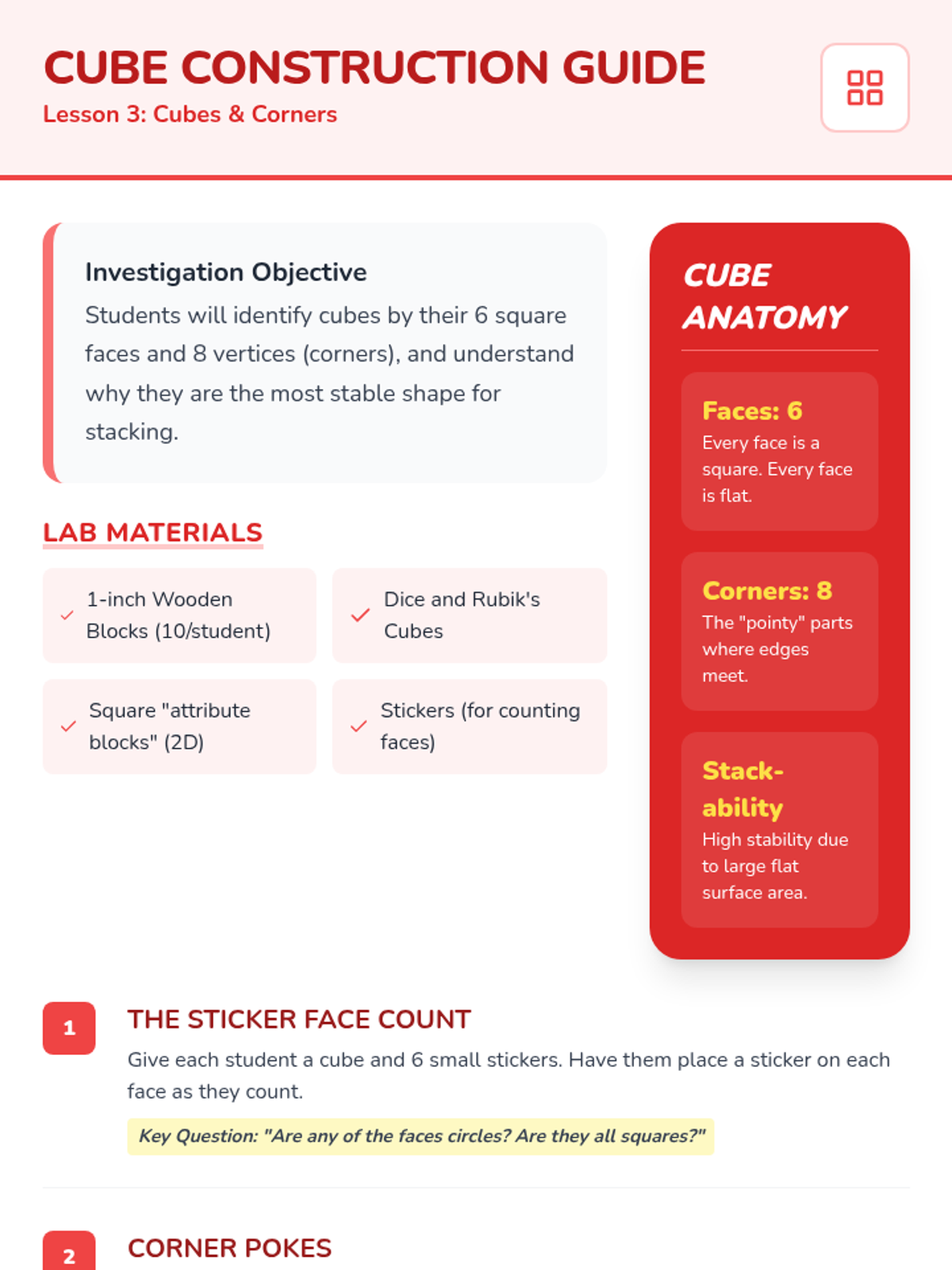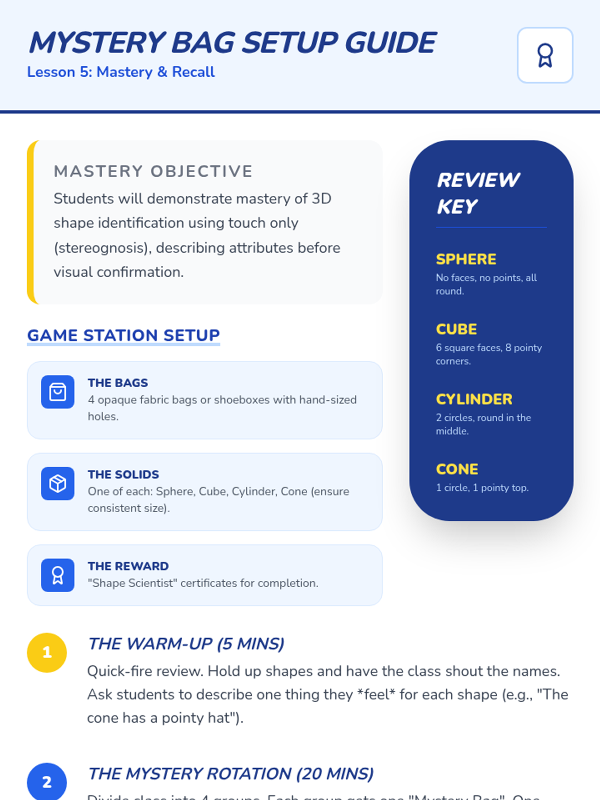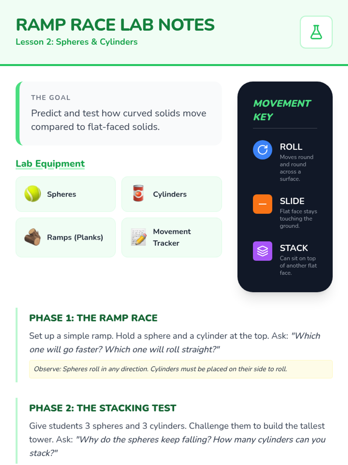 A Kindergarten sequence exploring 3D solids (spheres, cubes, cylinders, cones) through hands-on tactile exploration, movement experiments, and vocabulary building. Students learn to distinguish between flat 2D shapes and solid 3D shapes.