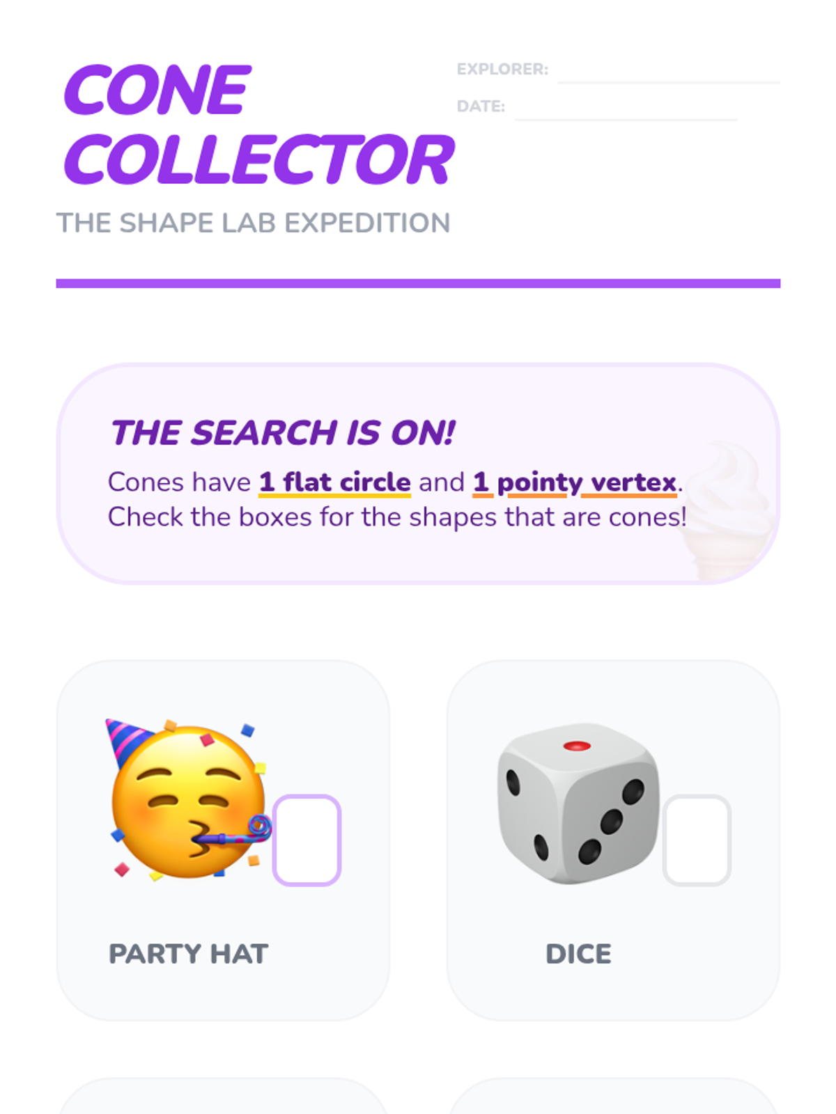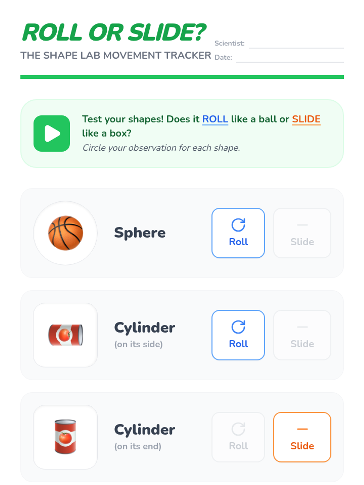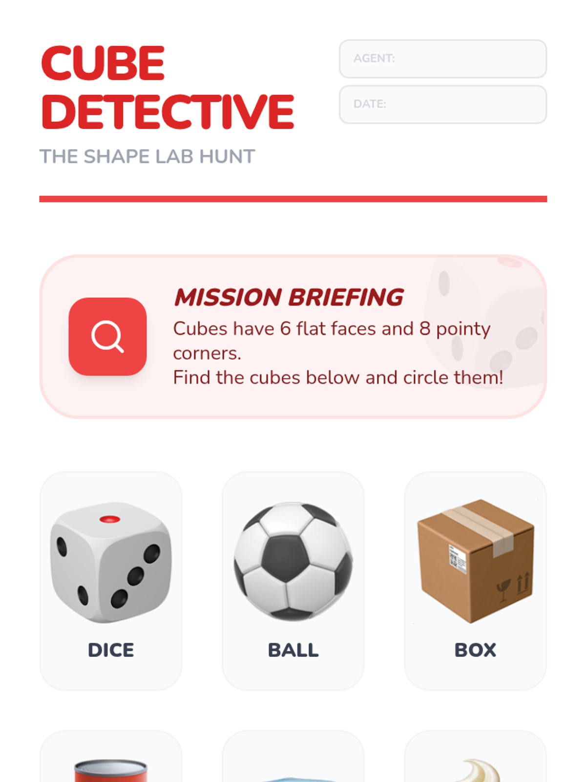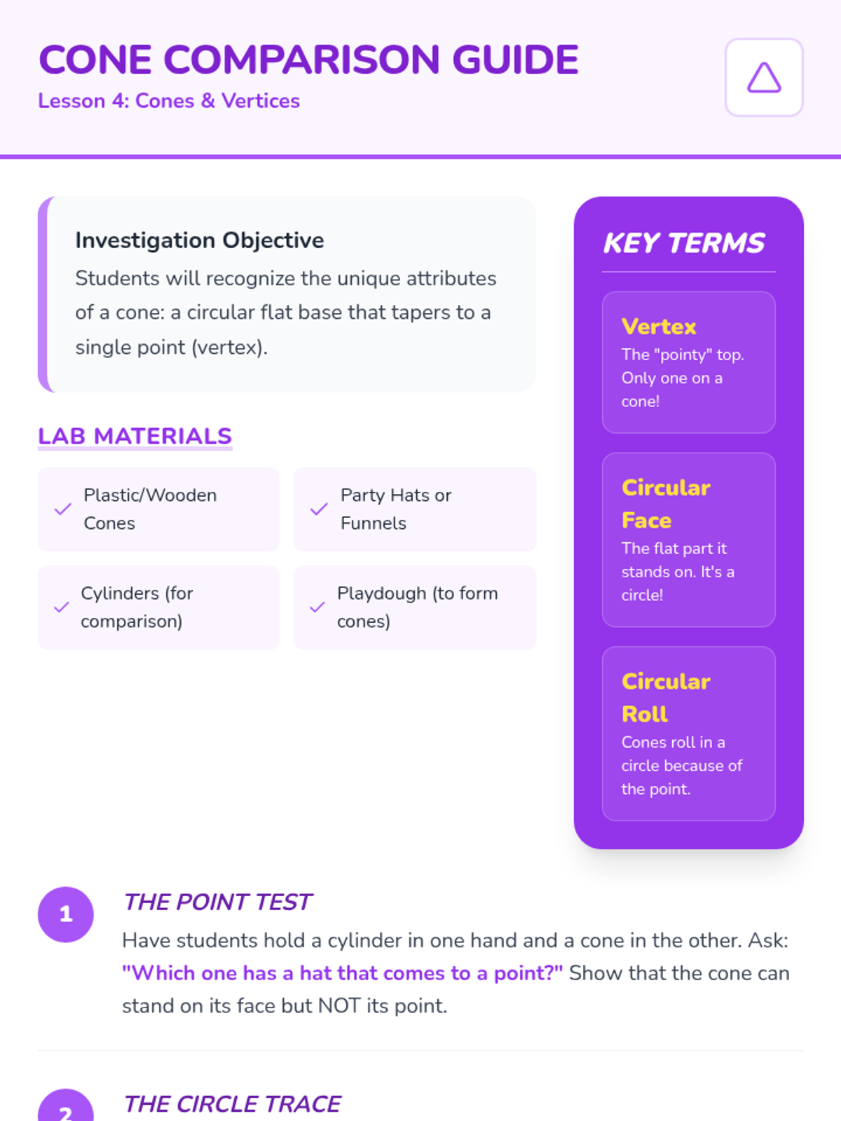 A Kindergarten sequence exploring 3D solids (spheres, cubes, cylinders, cones) through hands-on tactile exploration, movement experiments, and vocabulary building. Students learn to distinguish between flat 2D shapes and solid 3D shapes.