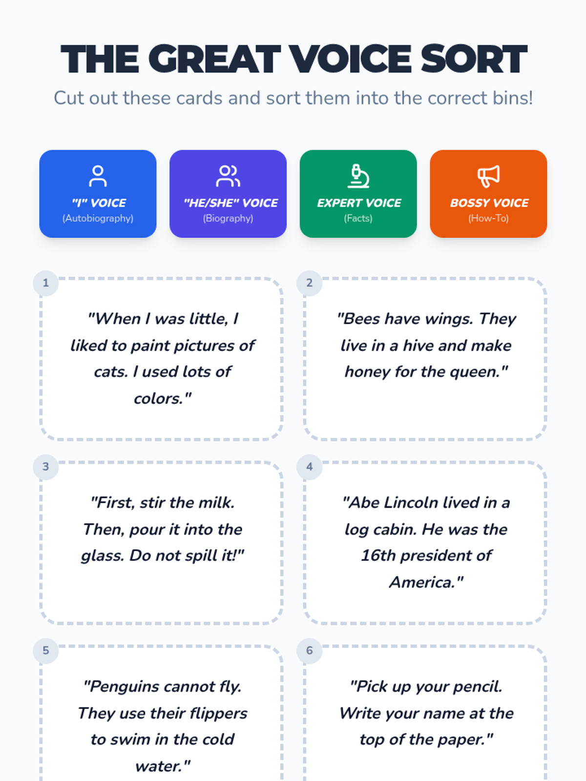 A 1st Grade sequence exploring Point of View in nonfiction, helping students distinguish between autobiographies, biographies, informational texts, and instructional manuals.