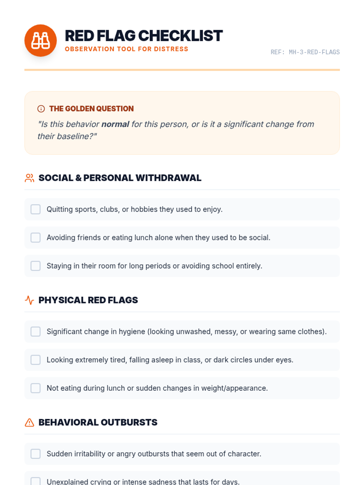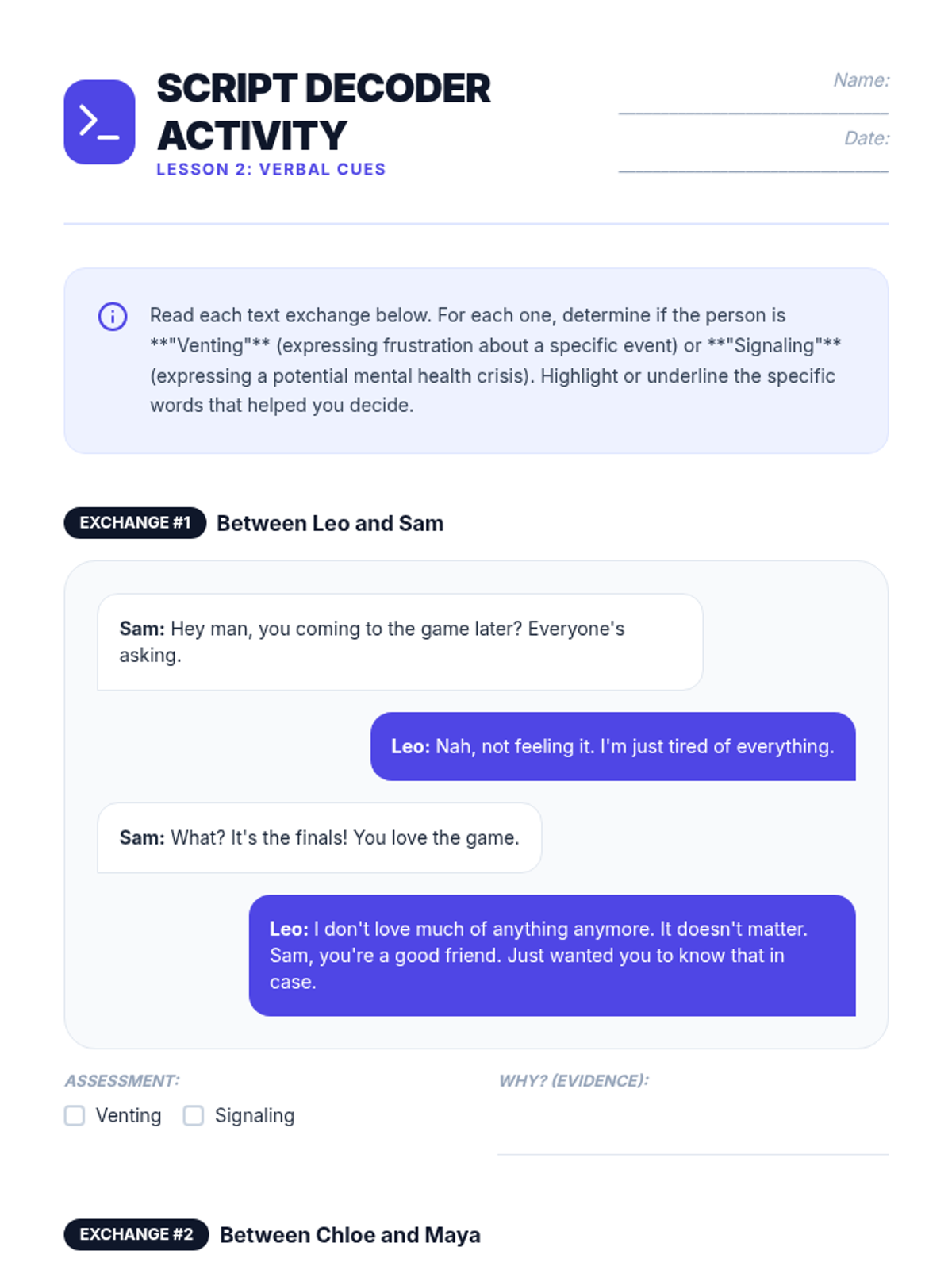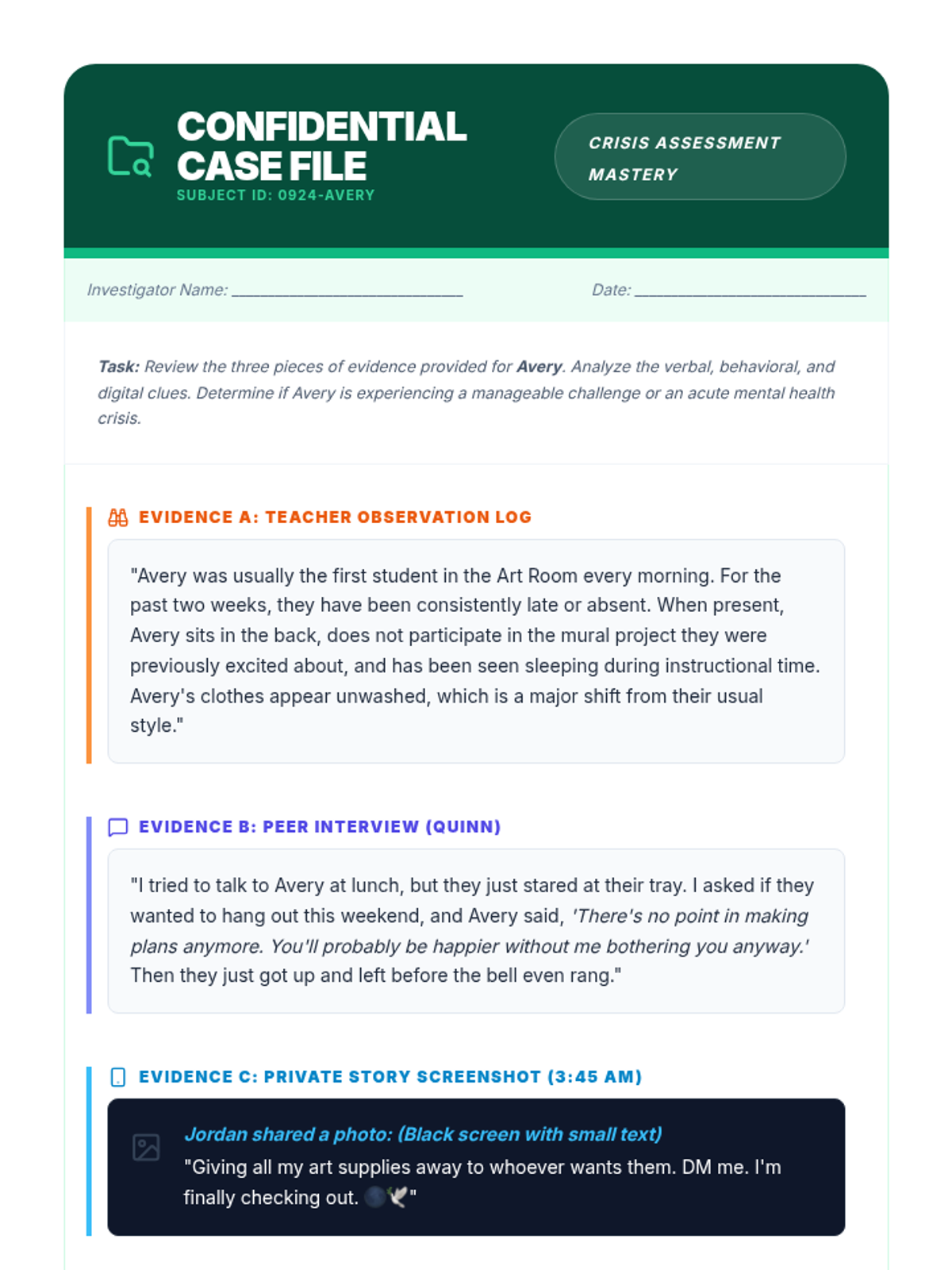 A comprehensive 5-lesson unit for 7th graders focused on identifying mental health crises through emotional, verbal, behavioral, and digital indicators. Students learn to distinguish between normal stress and critical situations requiring adult intervention.