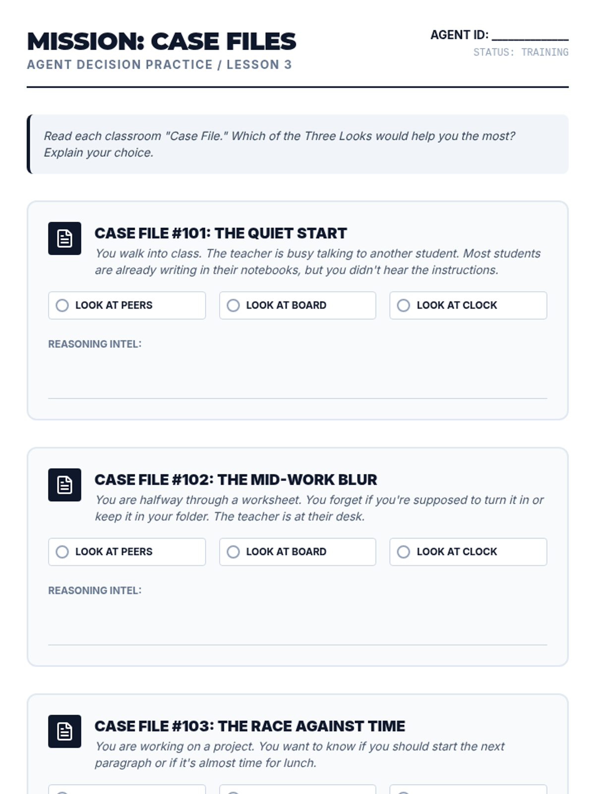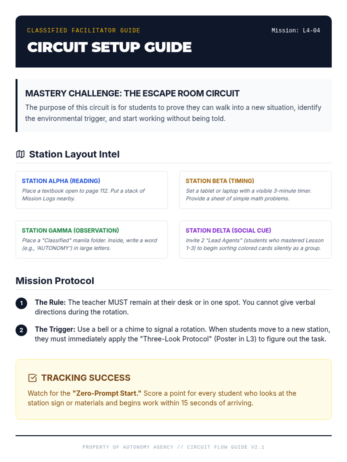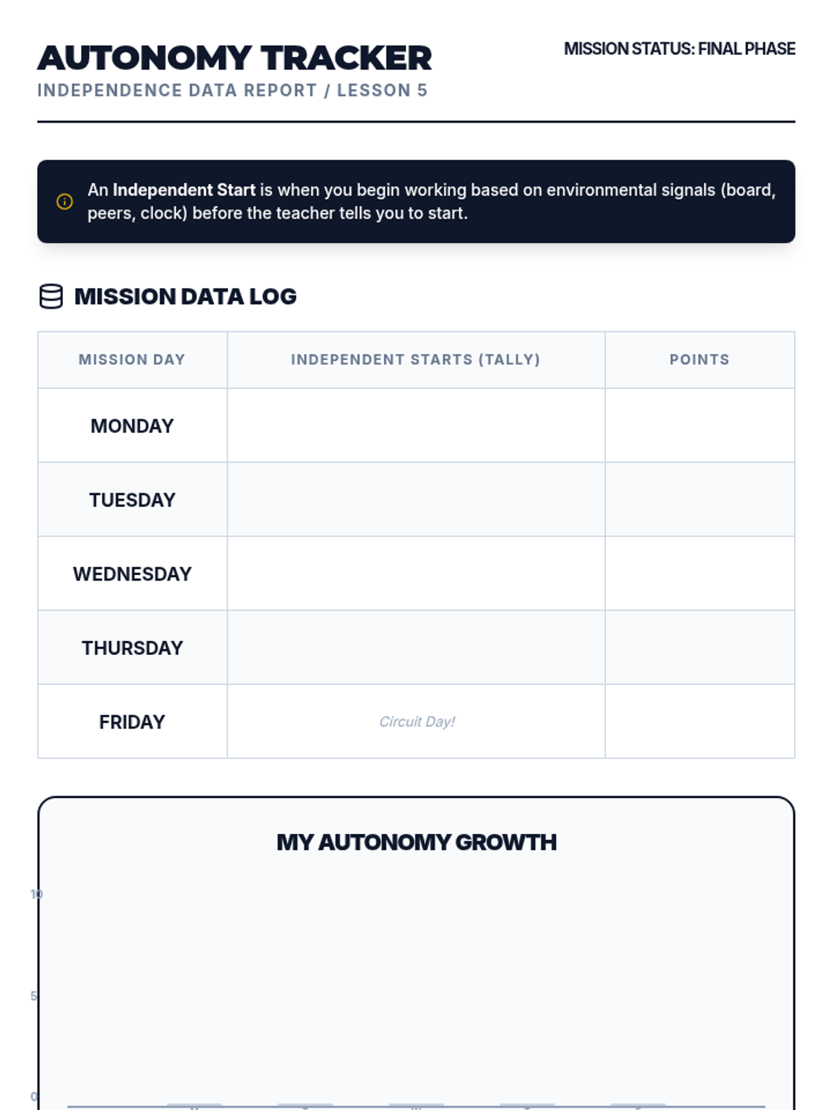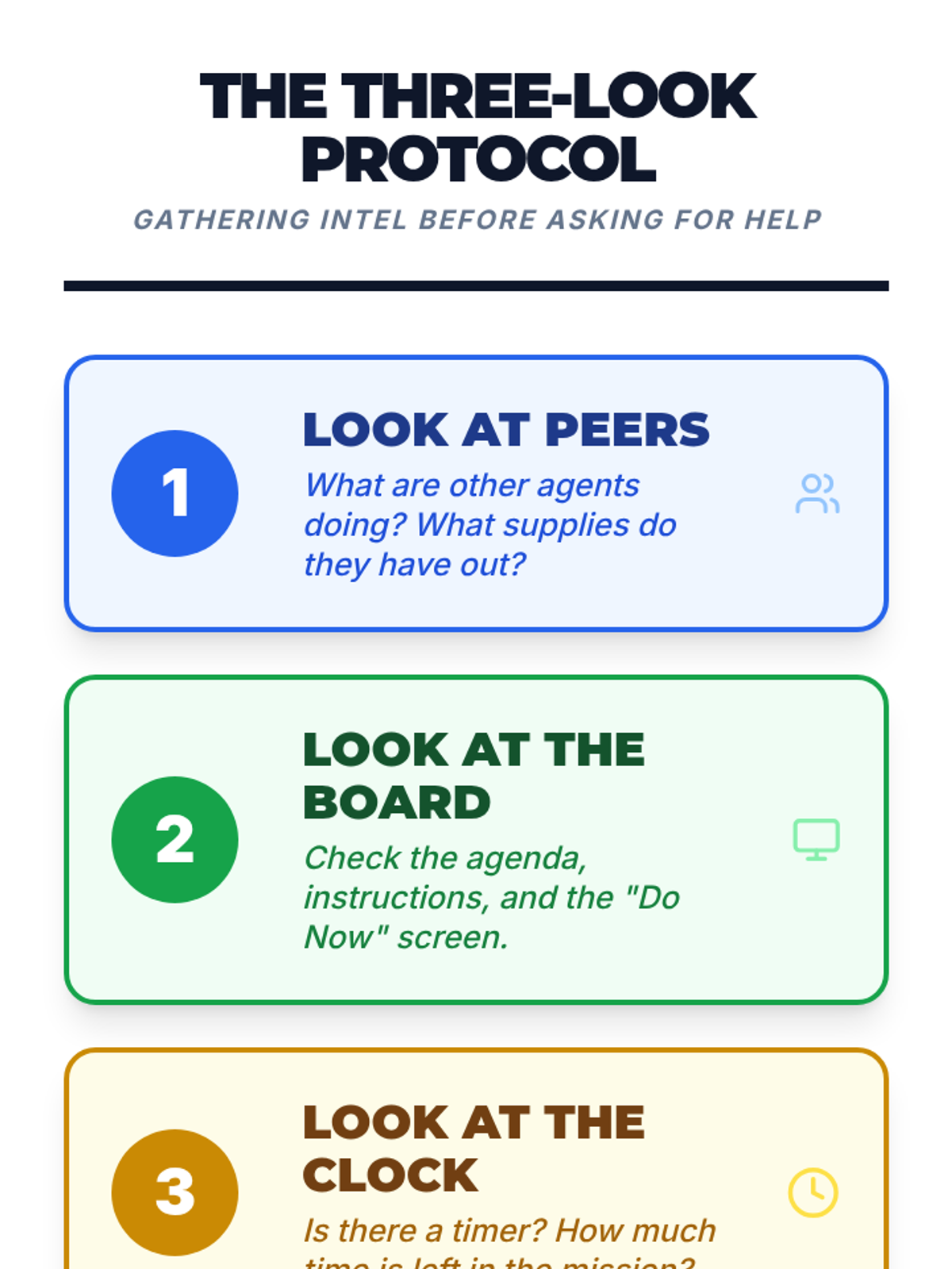 A 5-lesson sequence for 6th-grade students to master task initiation by recognizing environmental cues rather than waiting for verbal prompts. Using a 'Classroom Detective' theme, students learn to decode signals, apply a 'Three-Look' protocol, and track their own progress toward independence.