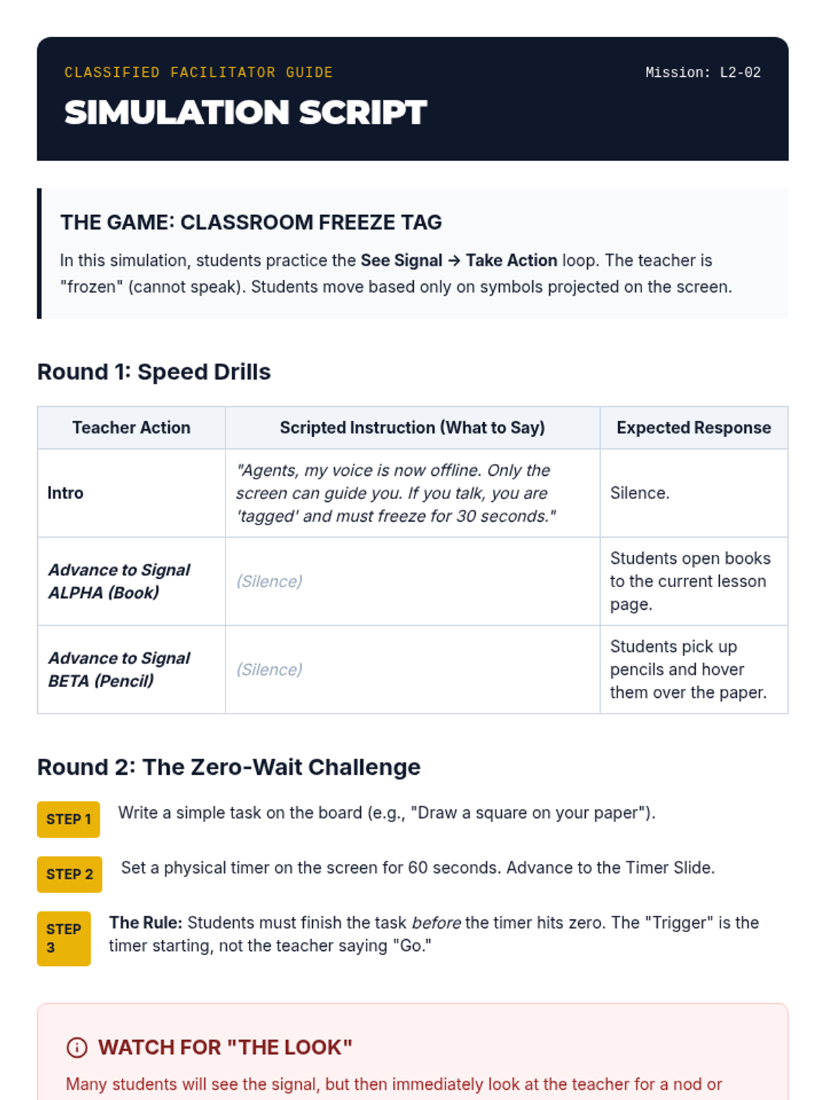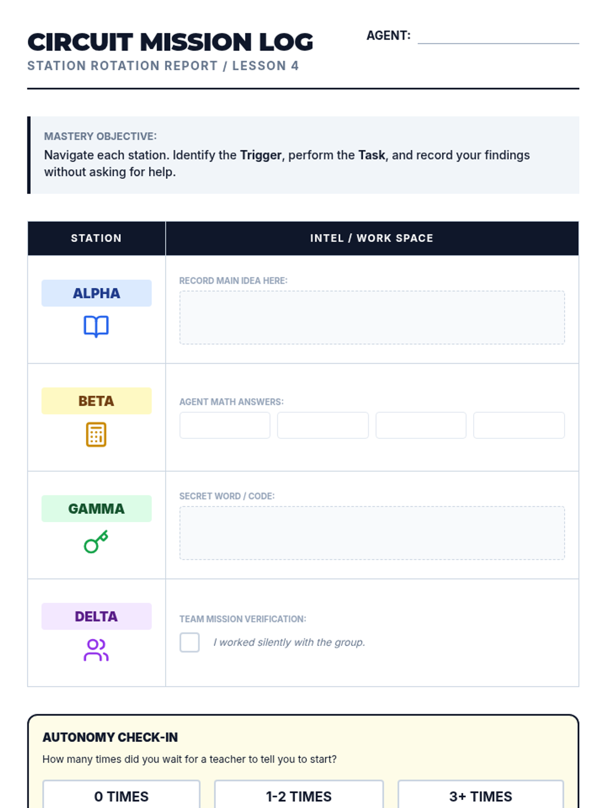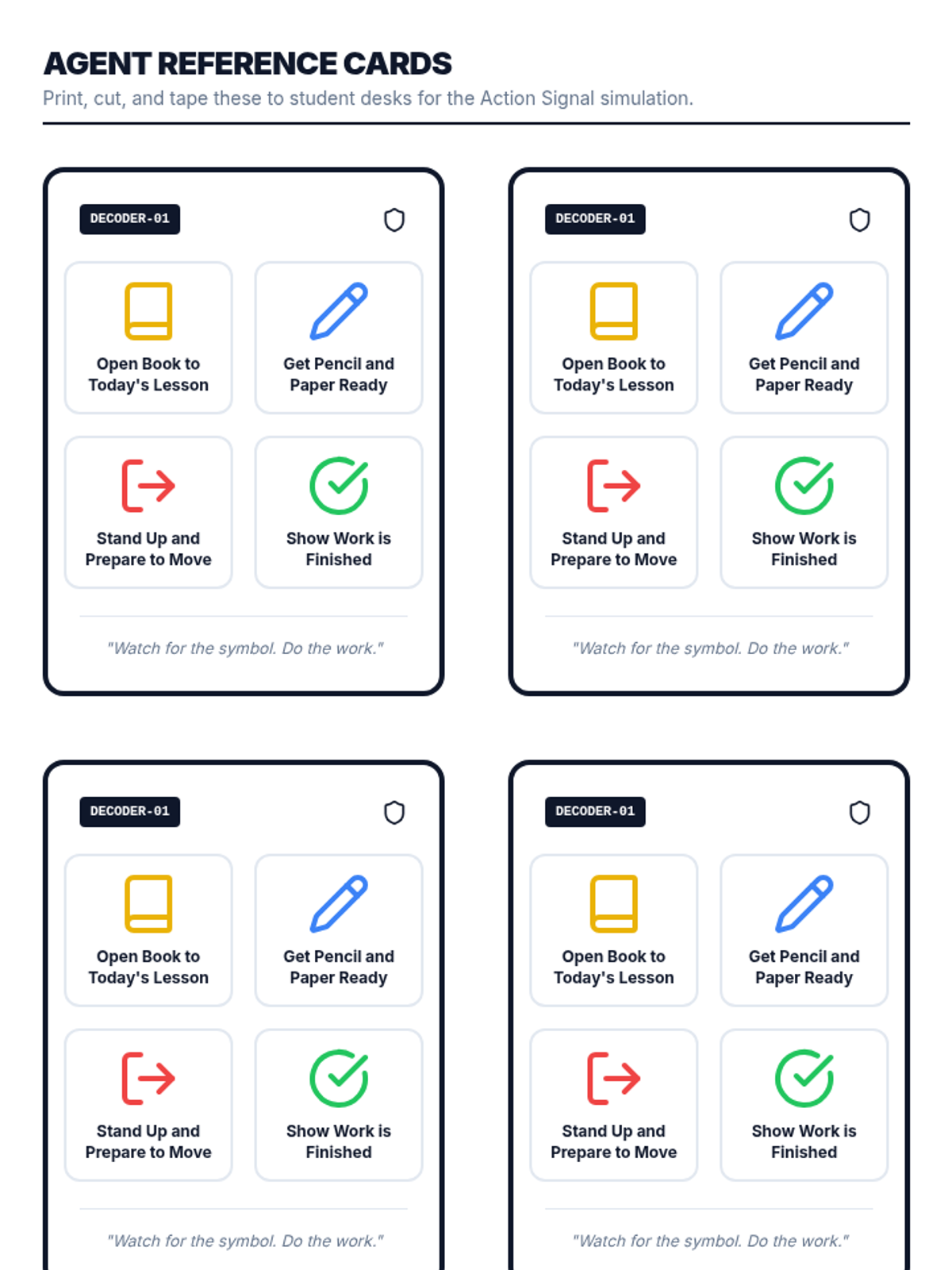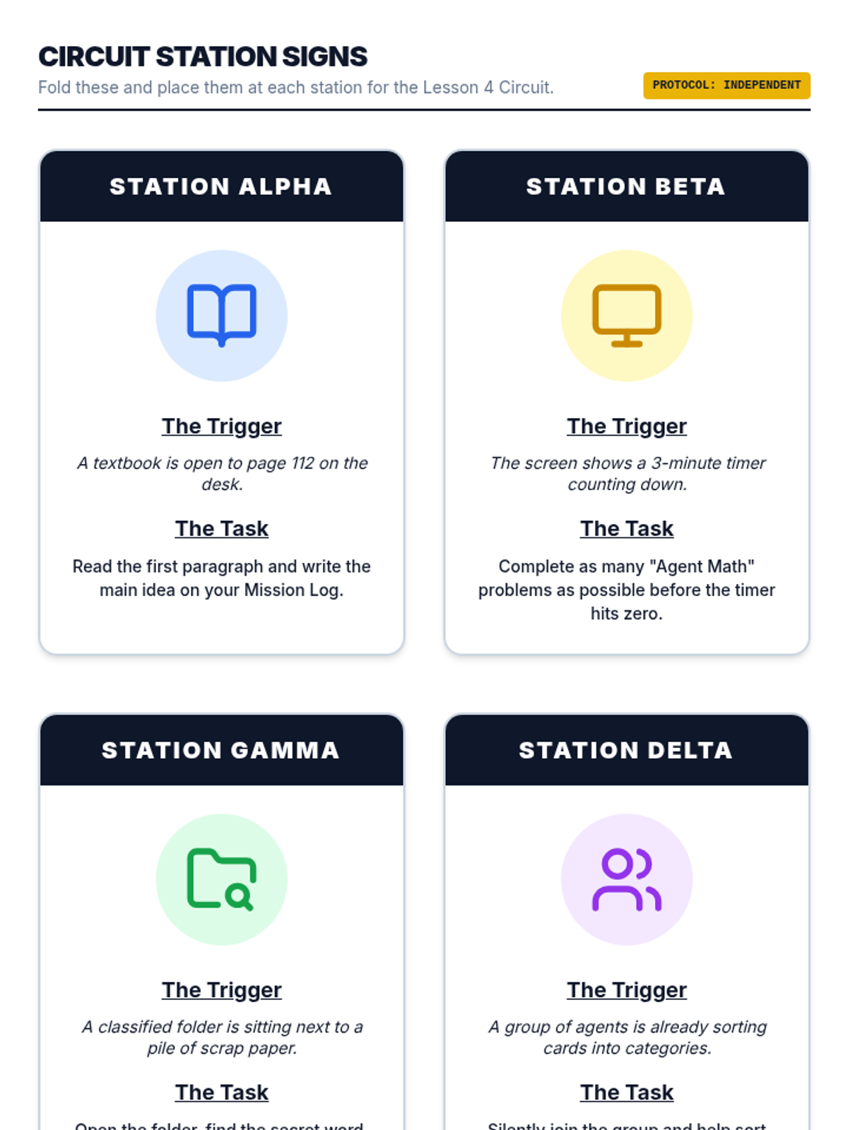 A 5-lesson sequence for 6th-grade students to master task initiation by recognizing environmental cues rather than waiting for verbal prompts. Using a 'Classroom Detective' theme, students learn to decode signals, apply a 'Three-Look' protocol, and track their own progress toward independence.