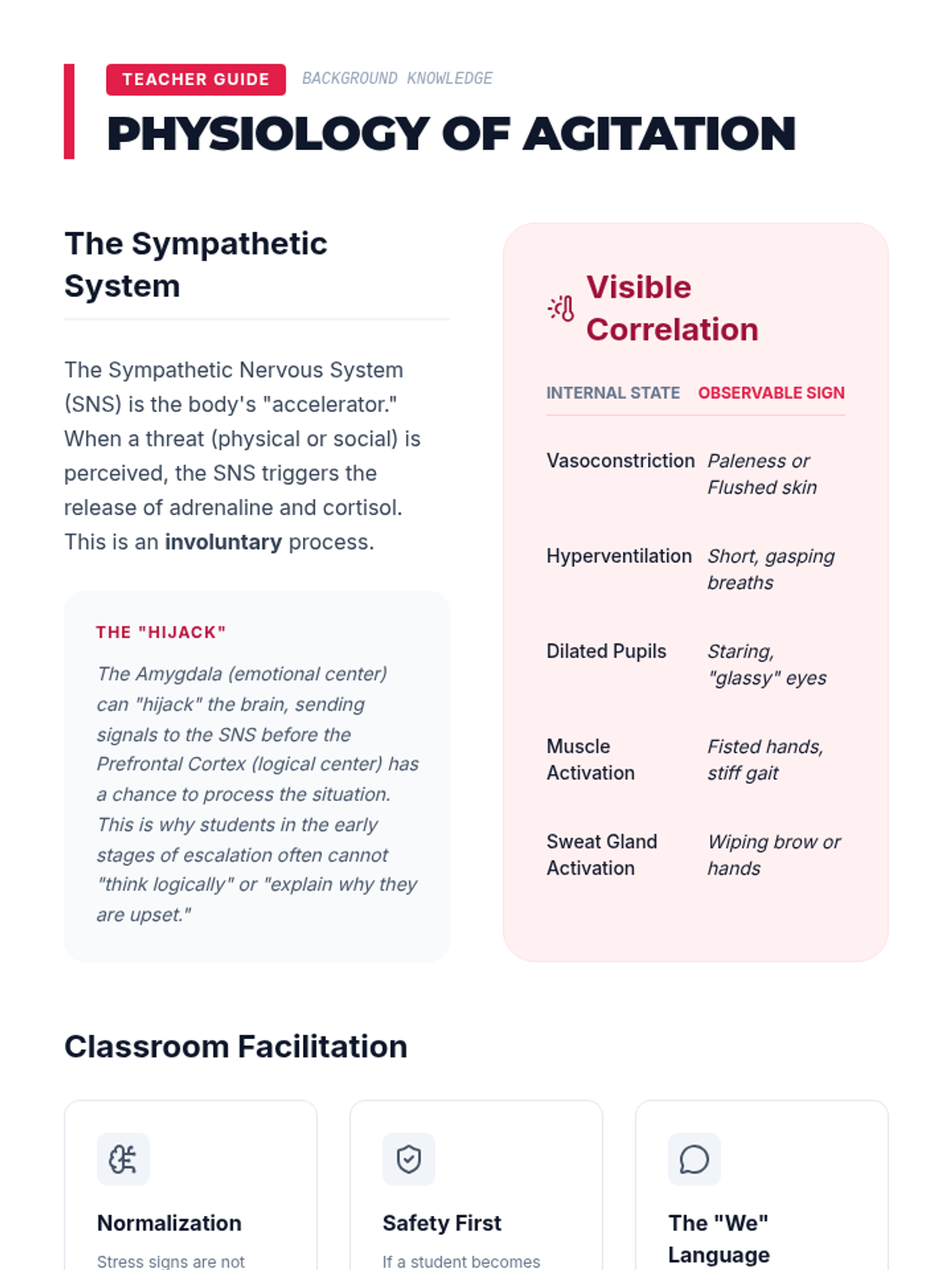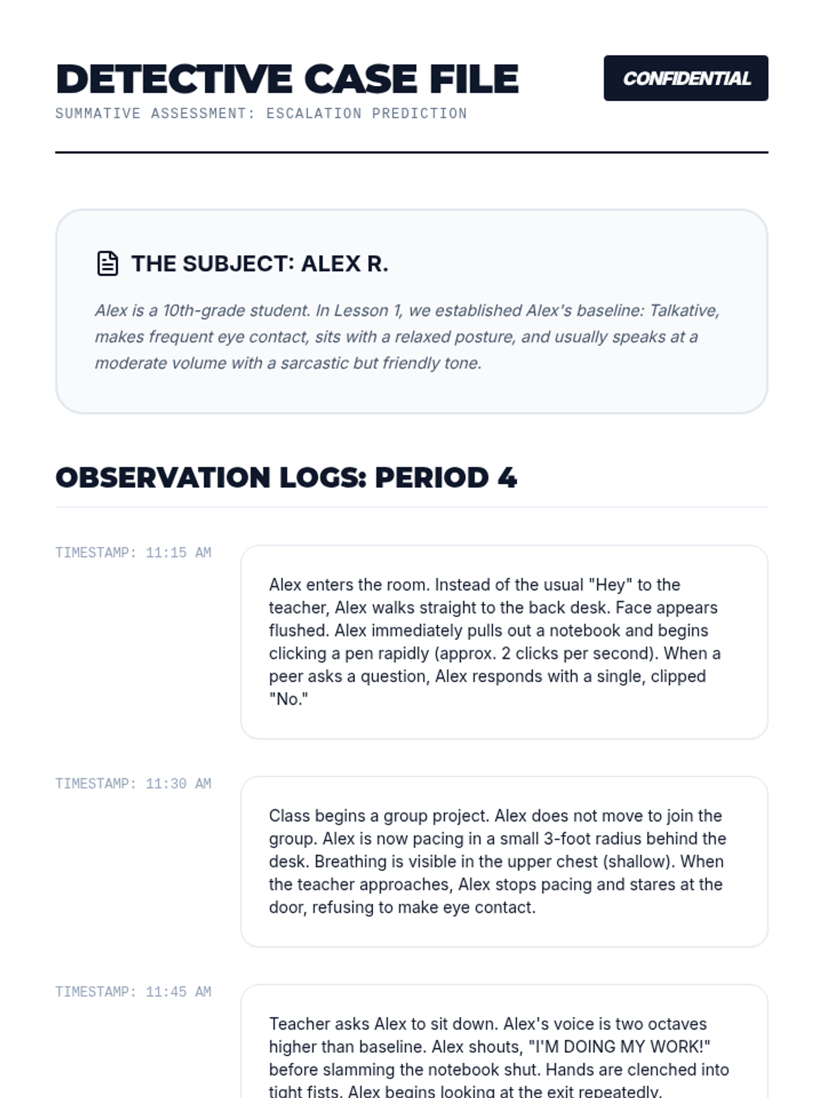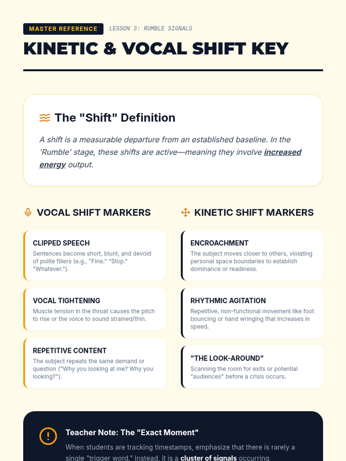 This sequence guides students through identifying physiological and behavioral warning signs of distress, focusing on establishing baselines, mapping internal stress responses, and analyzing external kinetic and vocal shifts to prevent crisis.