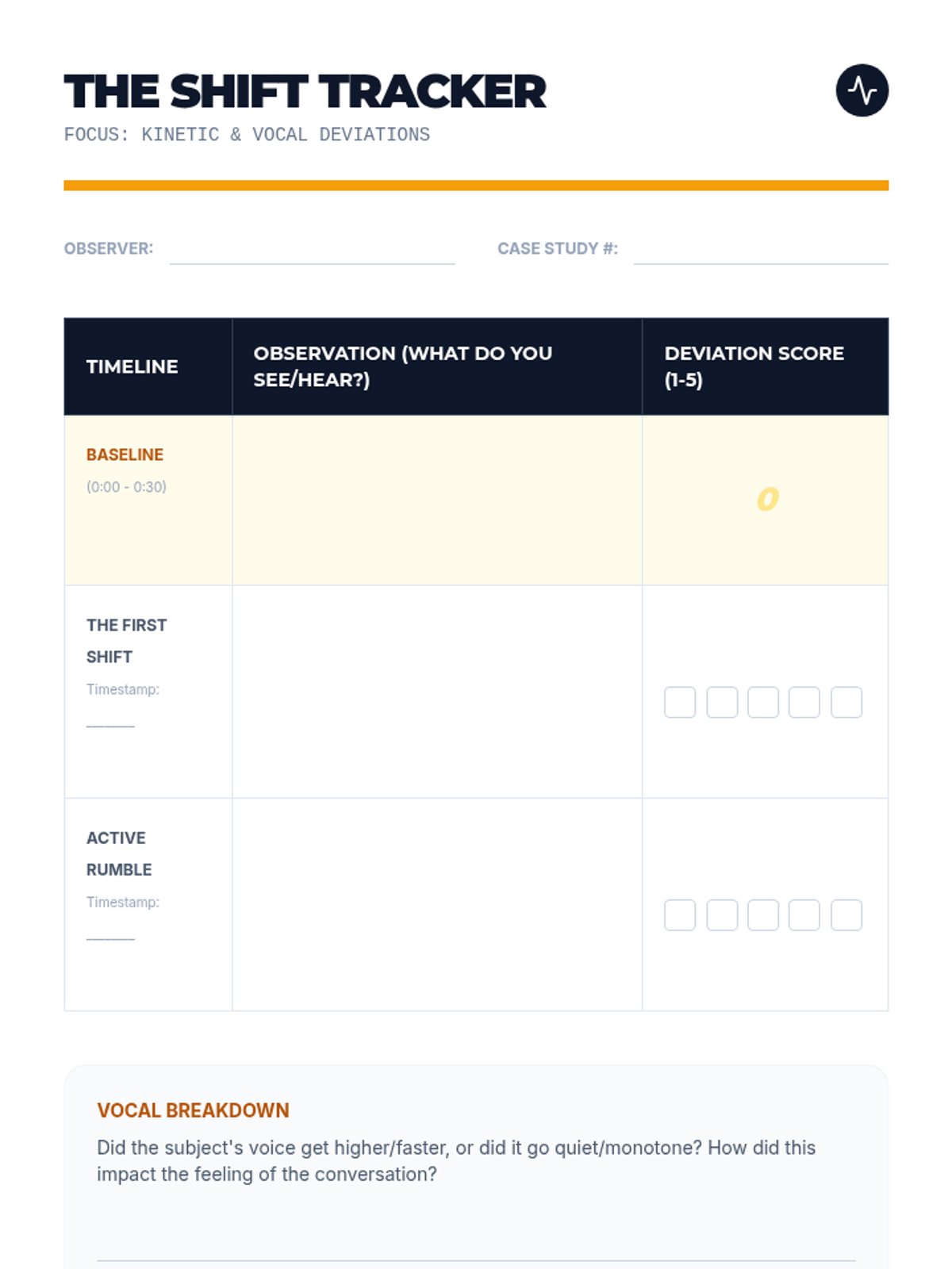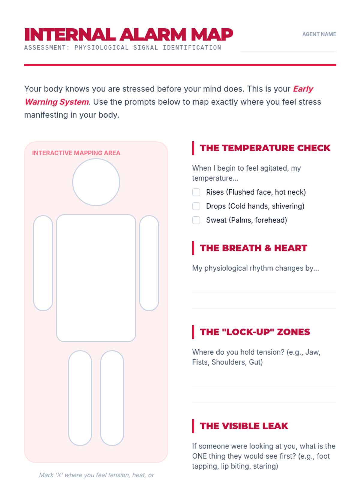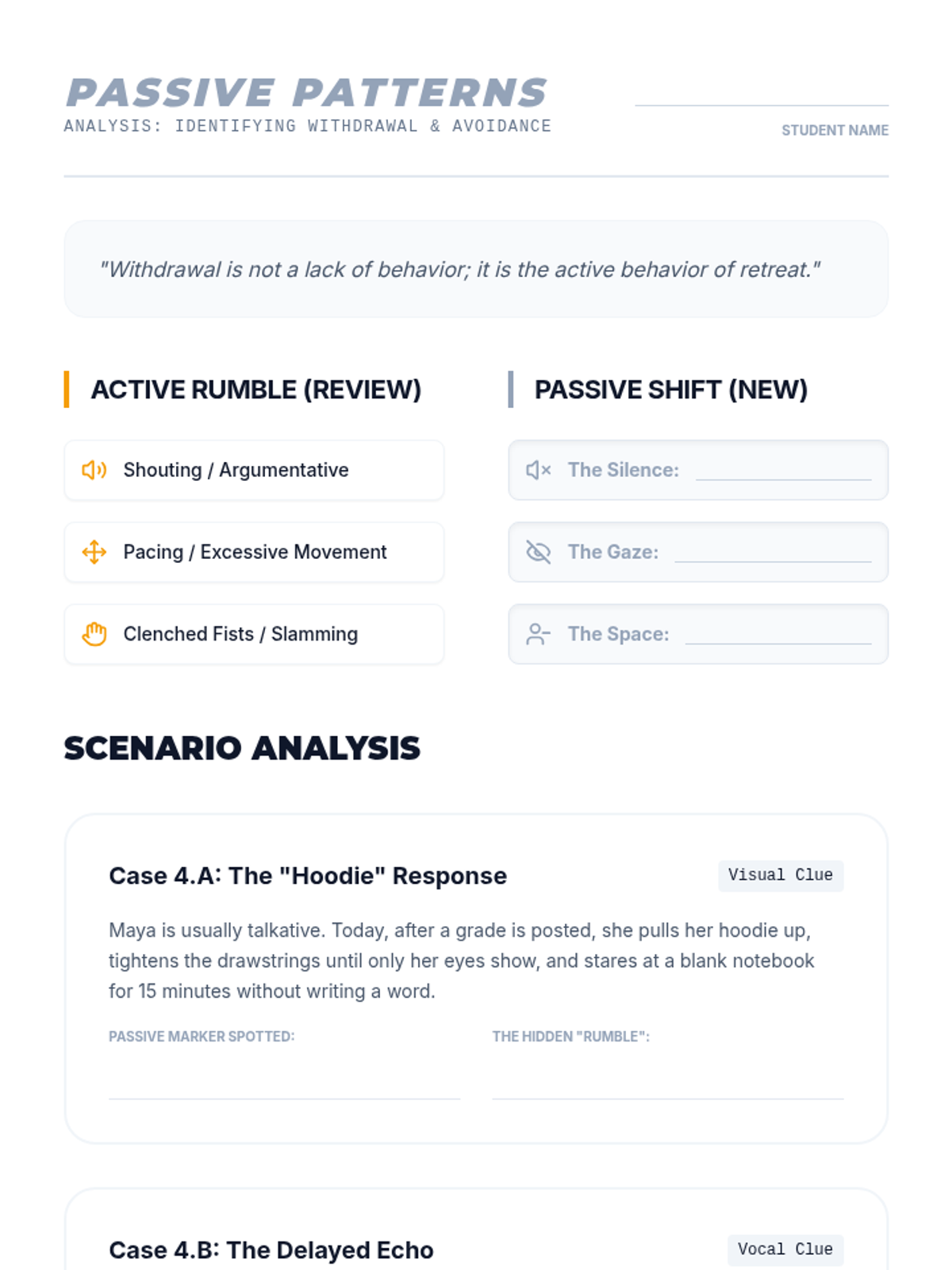 This sequence guides students through identifying physiological and behavioral warning signs of distress, focusing on establishing baselines, mapping internal stress responses, and analyzing external kinetic and vocal shifts to prevent crisis.