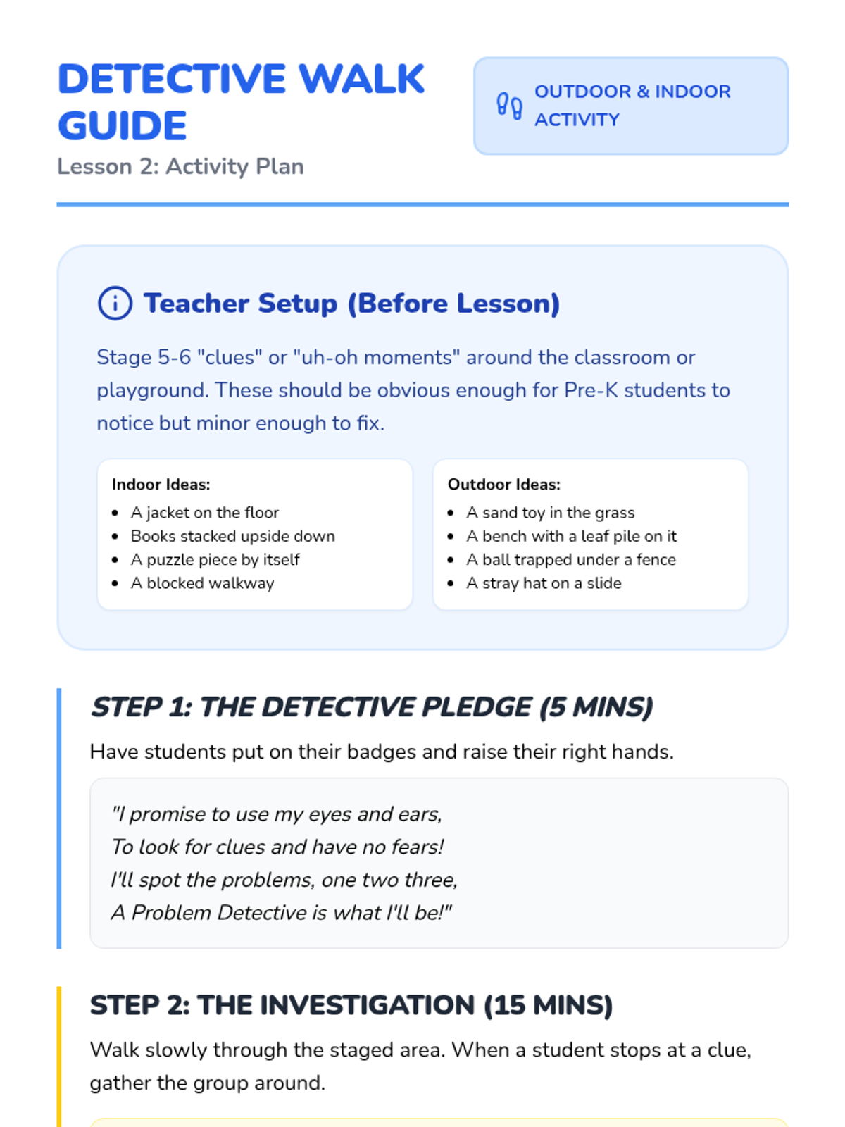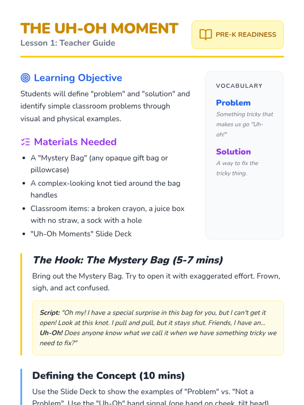 A 5-lesson unit for Pre-K students focusing on identifying everyday problems, recognizing physical cues of frustration, and learning when to ask for help. Using a detective-themed approach, students build vocabulary and self-awareness to navigate social and practical obstacles.