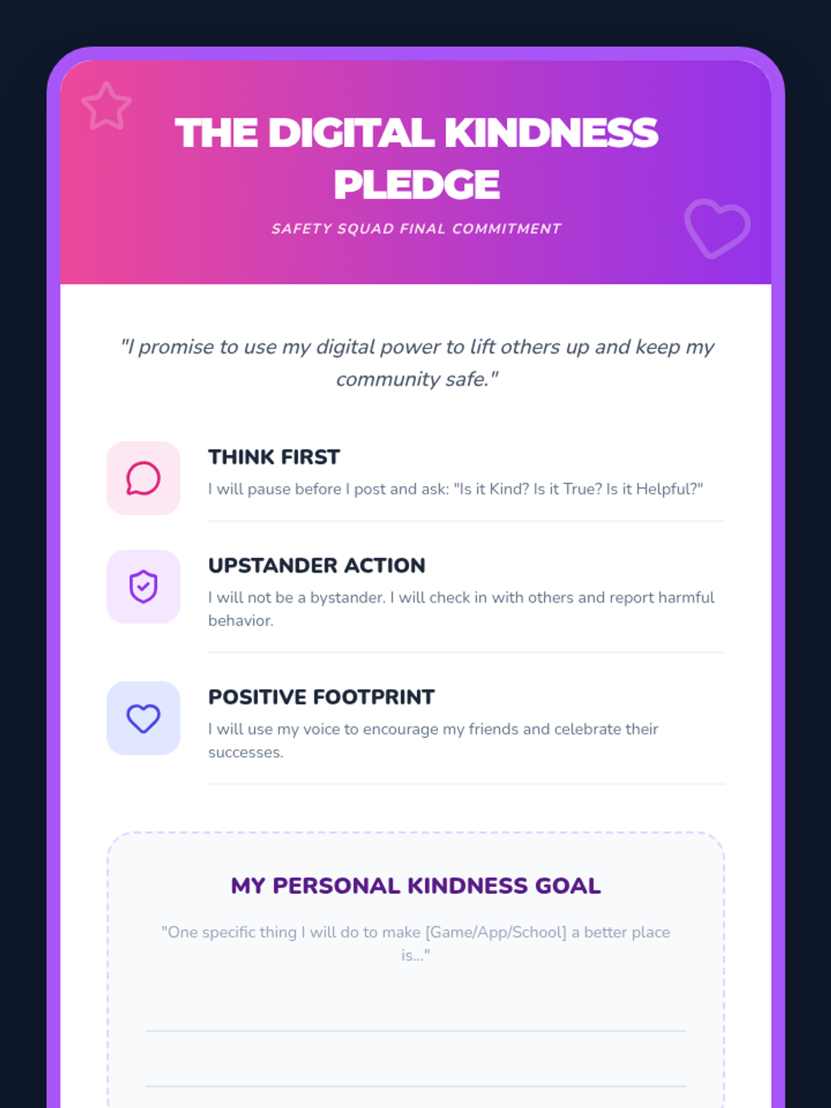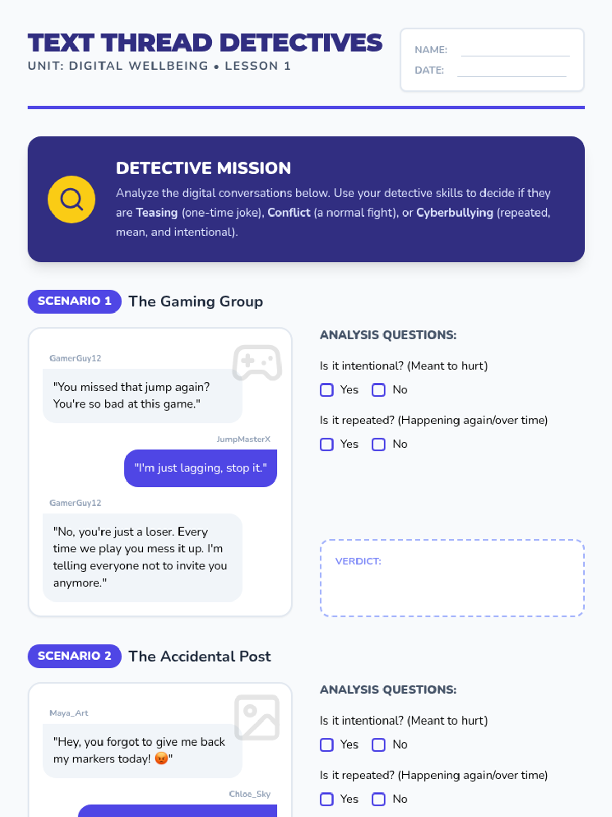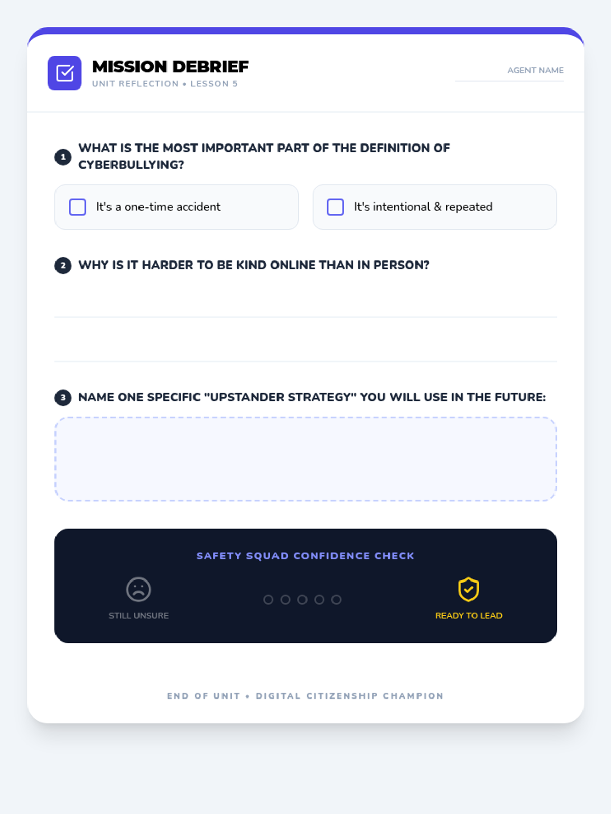 A comprehensive 4th-grade sequence on recognizing and preventing cyberbullying. Students progress from defining harmful online behaviors to practicing active upstander strategies and promoting a culture of digital kindness.