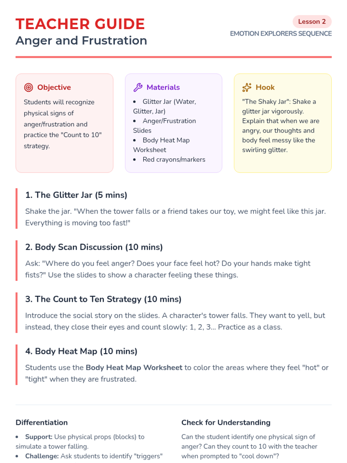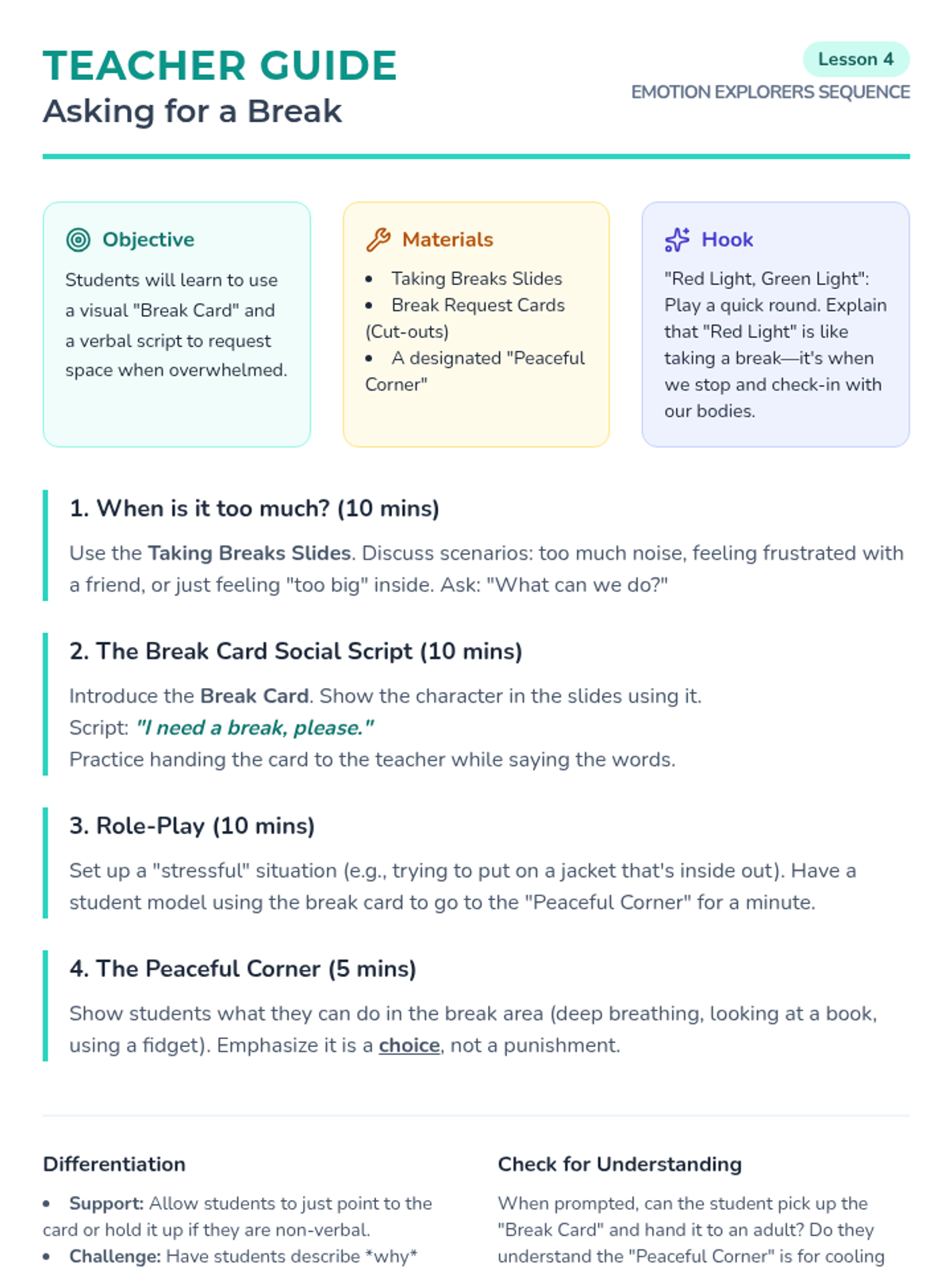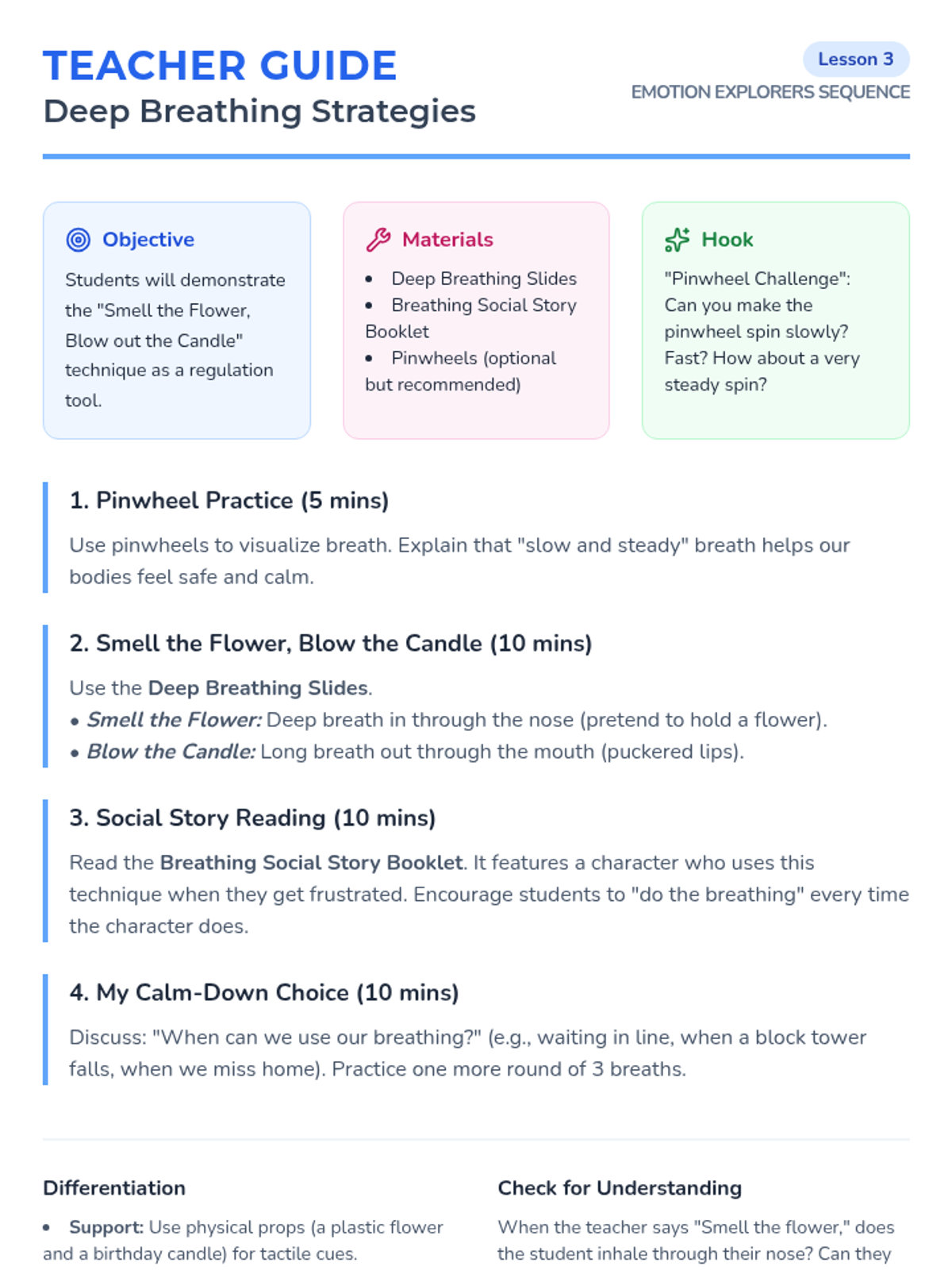 A 5-lesson unit for Pre-K students focused on emotional literacy and self-regulation. Students learn to identify emotions (happy, sad, angry), recognize body sensations, and utilize positive behavior supports like deep breathing and requesting breaks through personalized social stories.