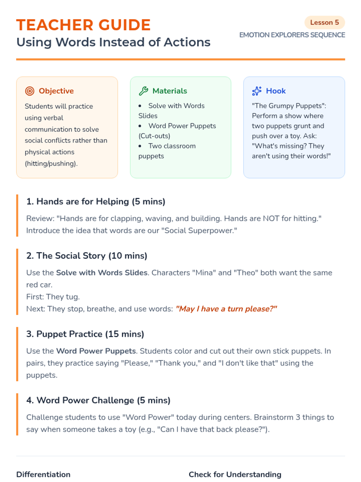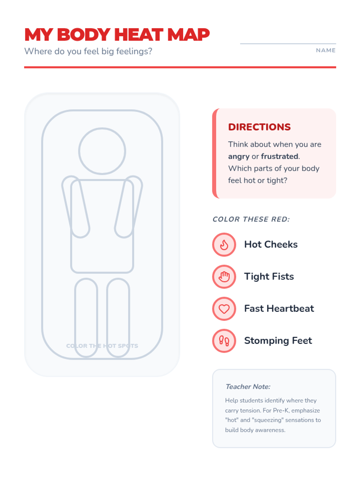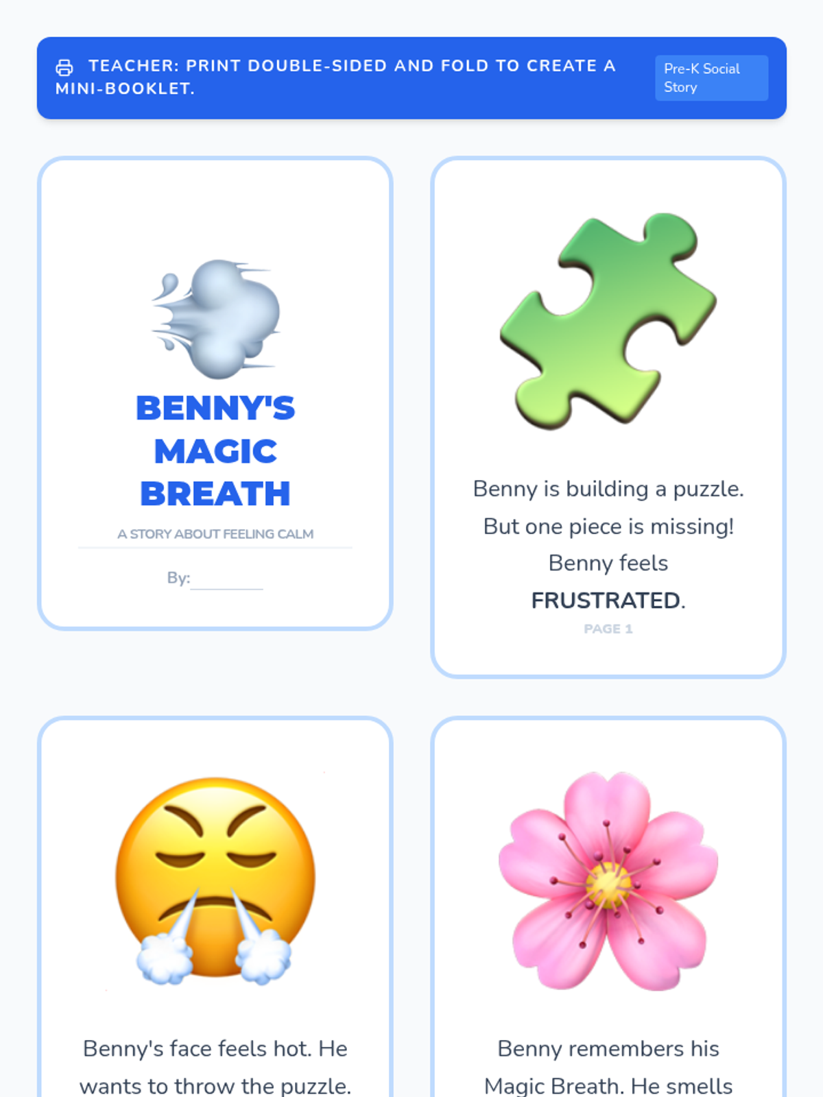 A 5-lesson unit for Pre-K students focused on emotional literacy and self-regulation. Students learn to identify emotions (happy, sad, angry), recognize body sensations, and utilize positive behavior supports like deep breathing and requesting breaks through personalized social stories.
