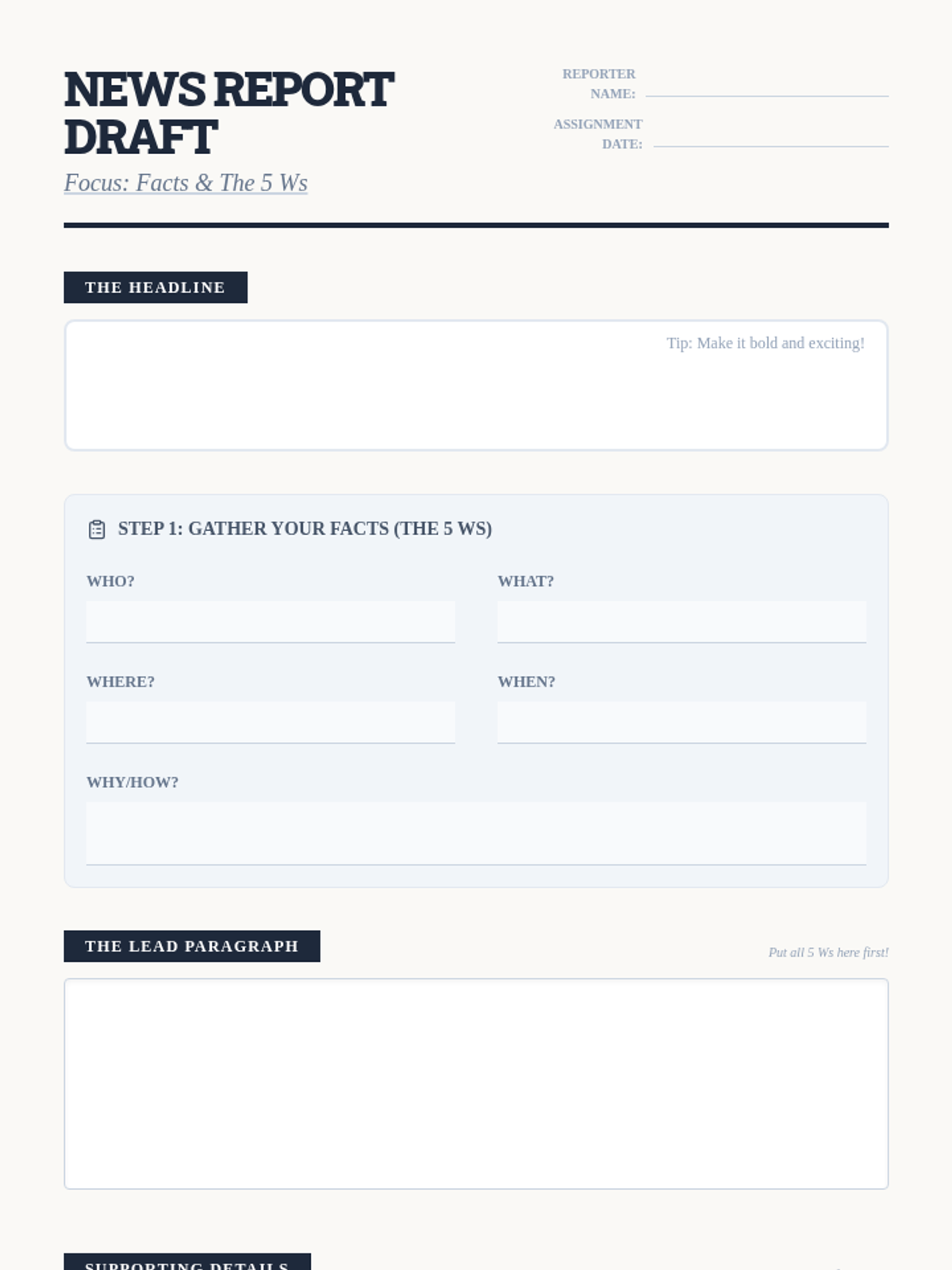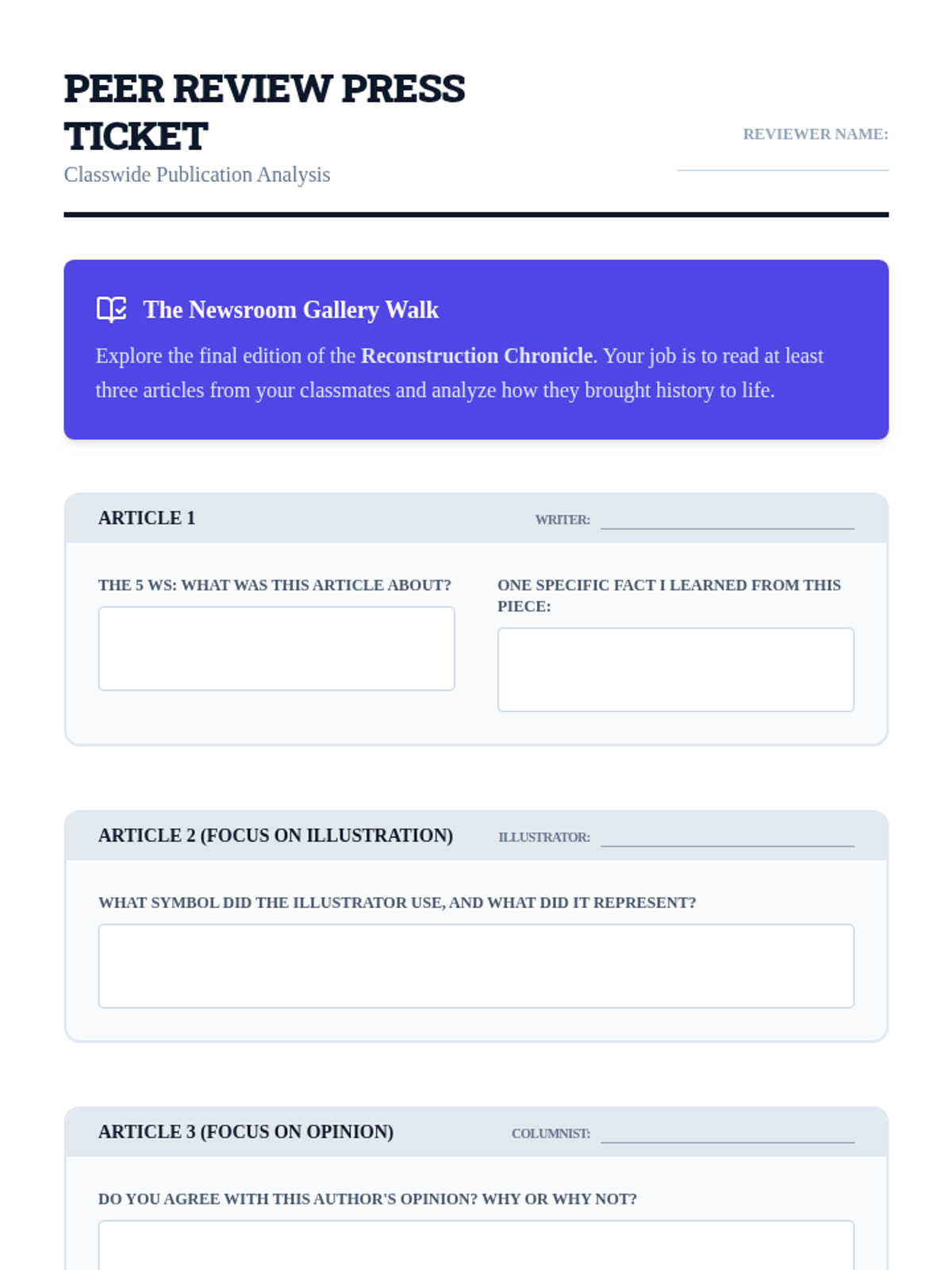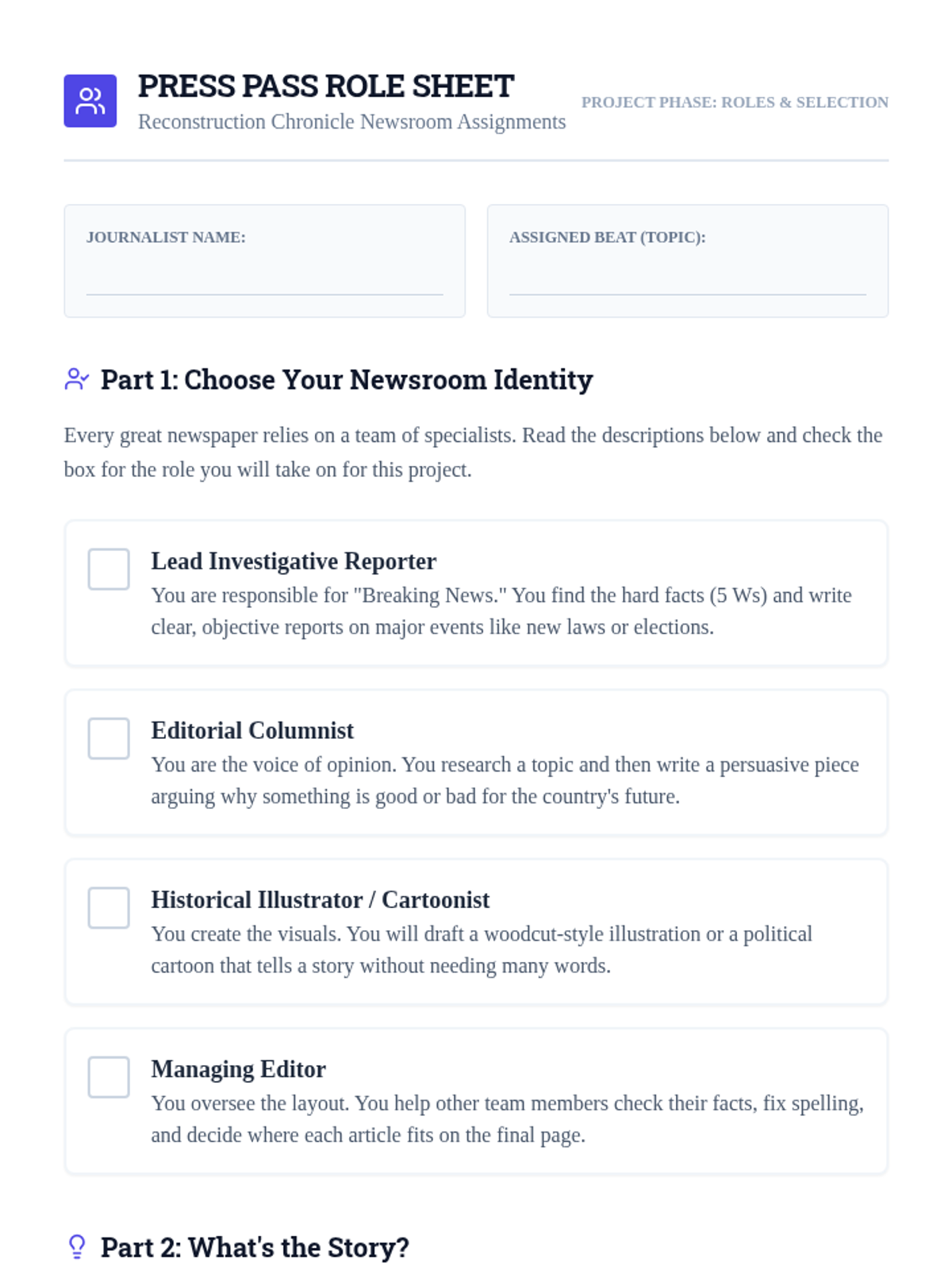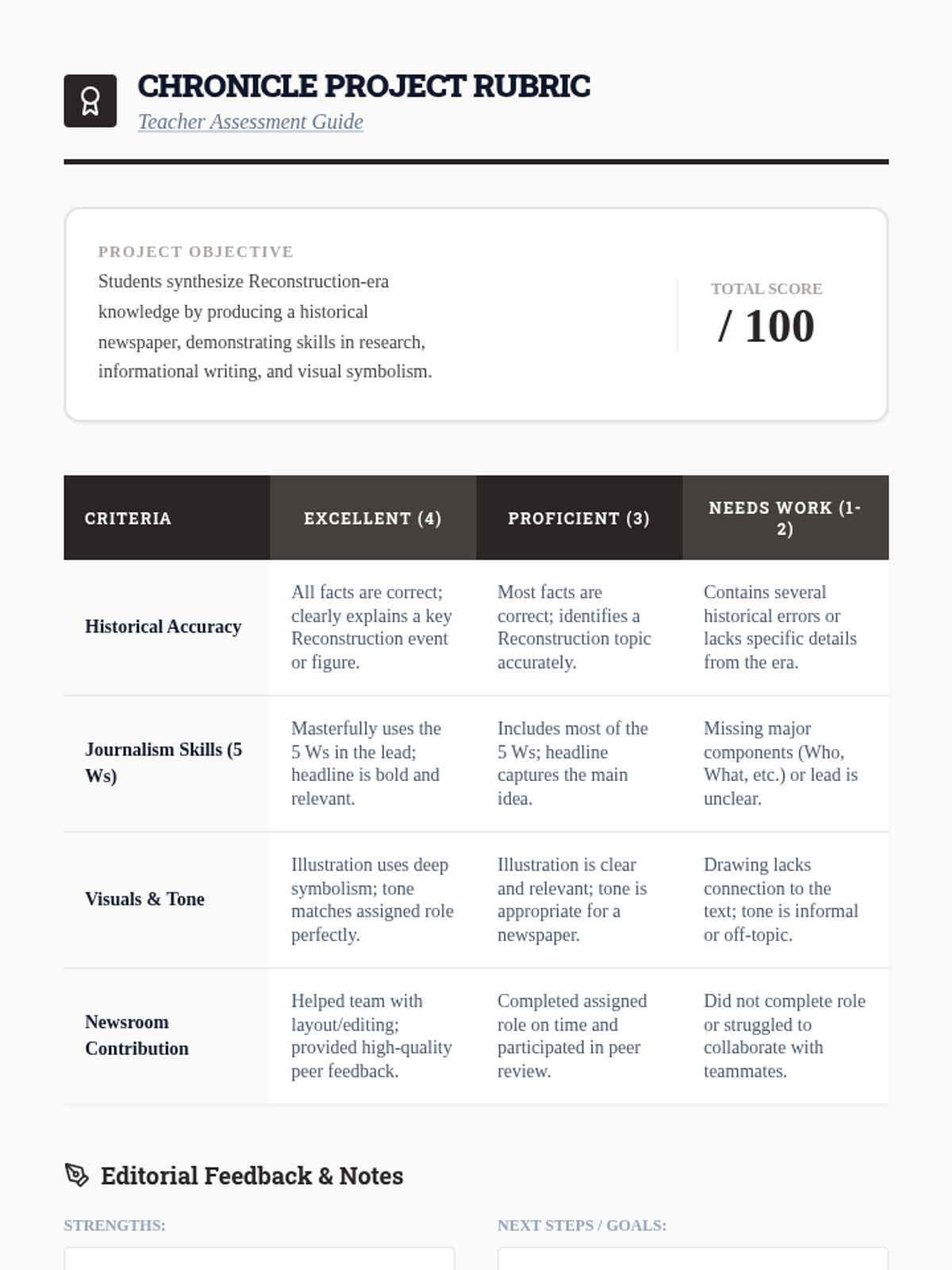 A project-based sequence where 4th-grade students act as historical journalists to synthesize their knowledge of the Reconstruction era through the creation of a collaborative newspaper. Students move from analyzing 19th-century media to researching, drafting, and illustrating their own historical accounts.
