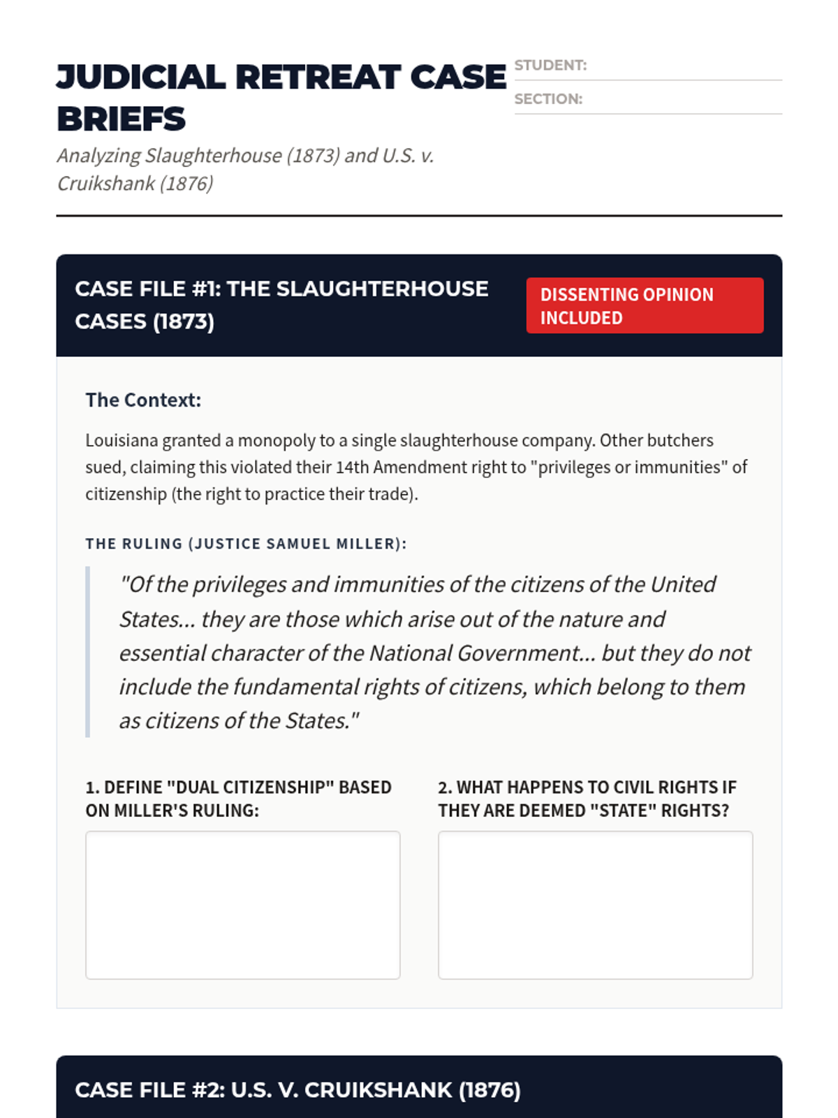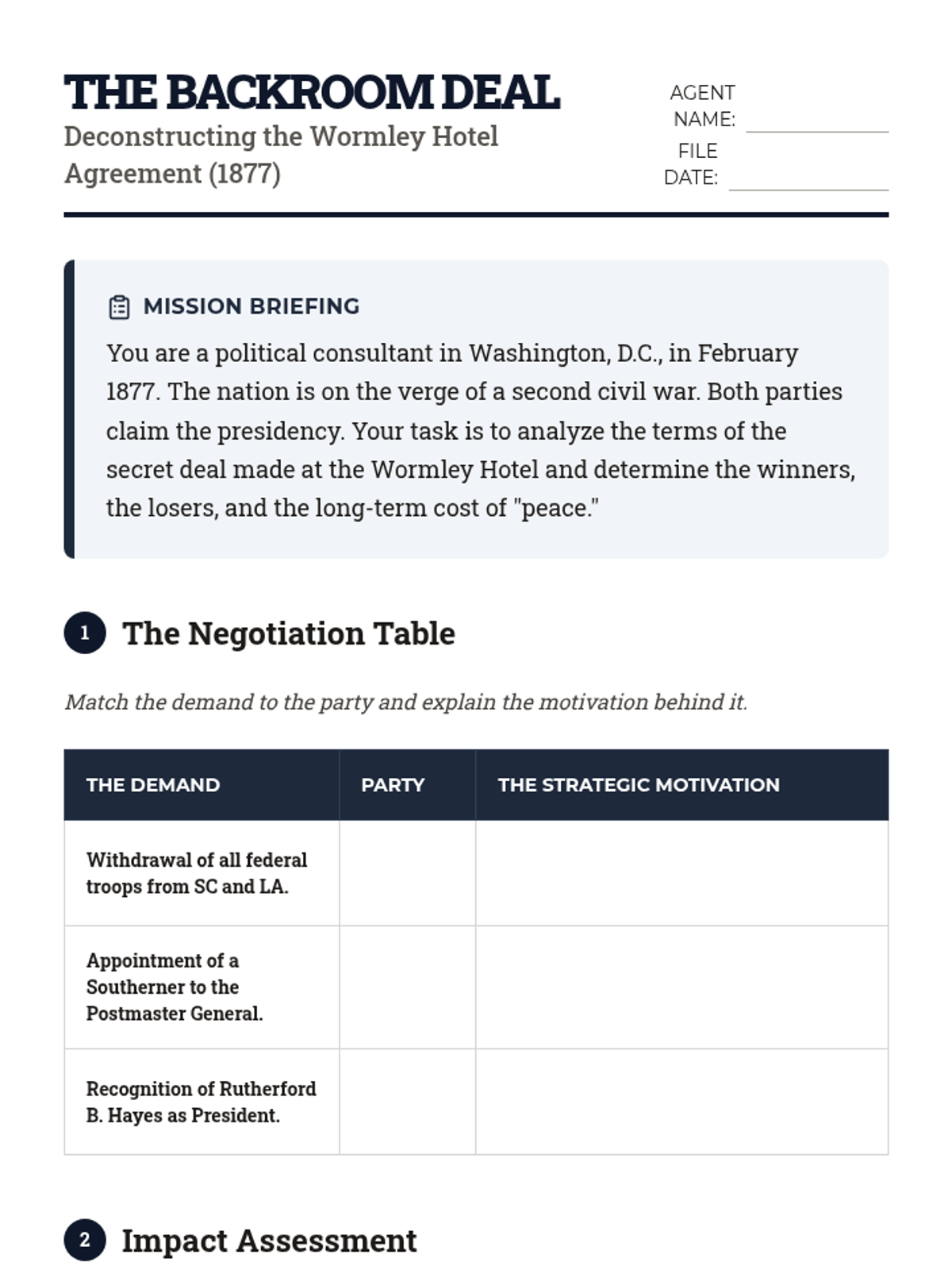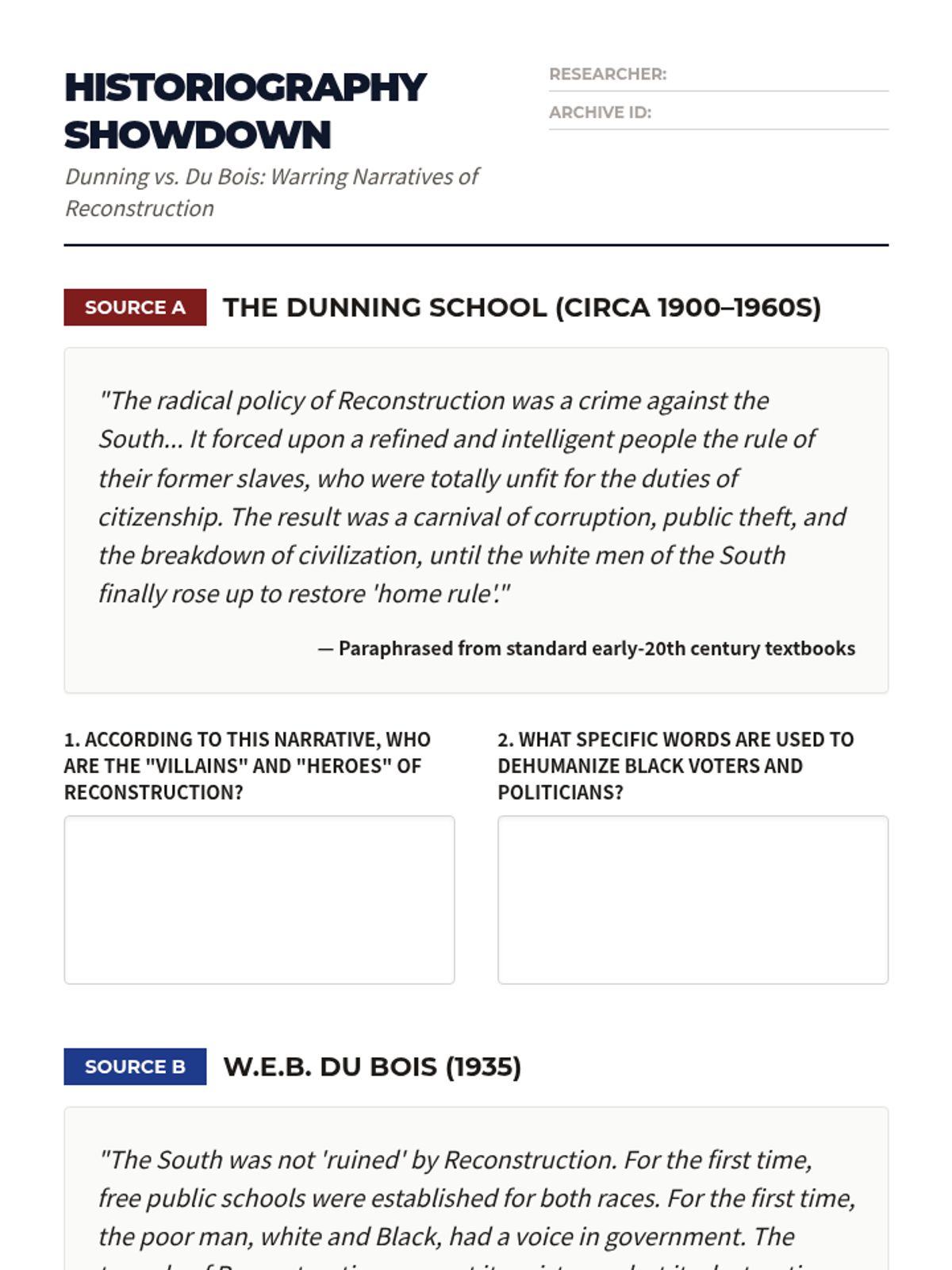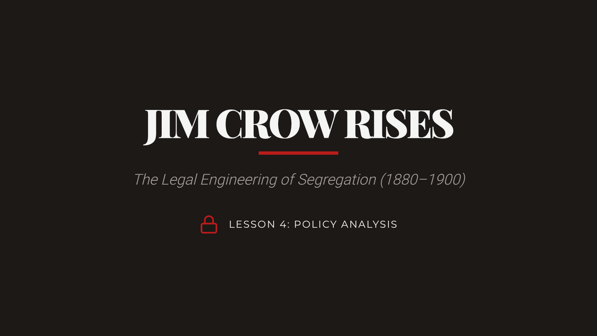 This high school history sequence investigates the factors that led to the end of Reconstruction and the subsequent rise of Jim Crow. Students analyze economic shifts, political compromises, judicial rulings, and the long-term impact of historical narratives on American memory.