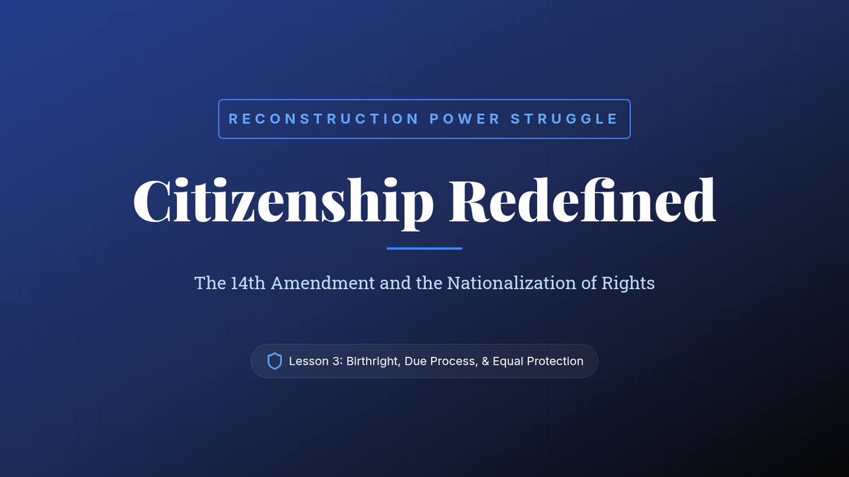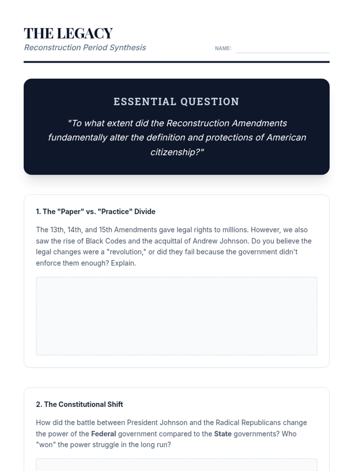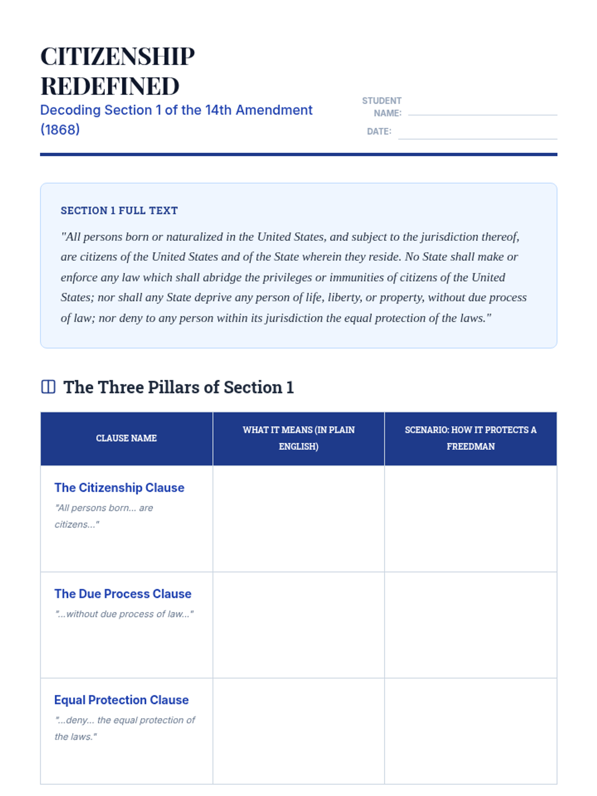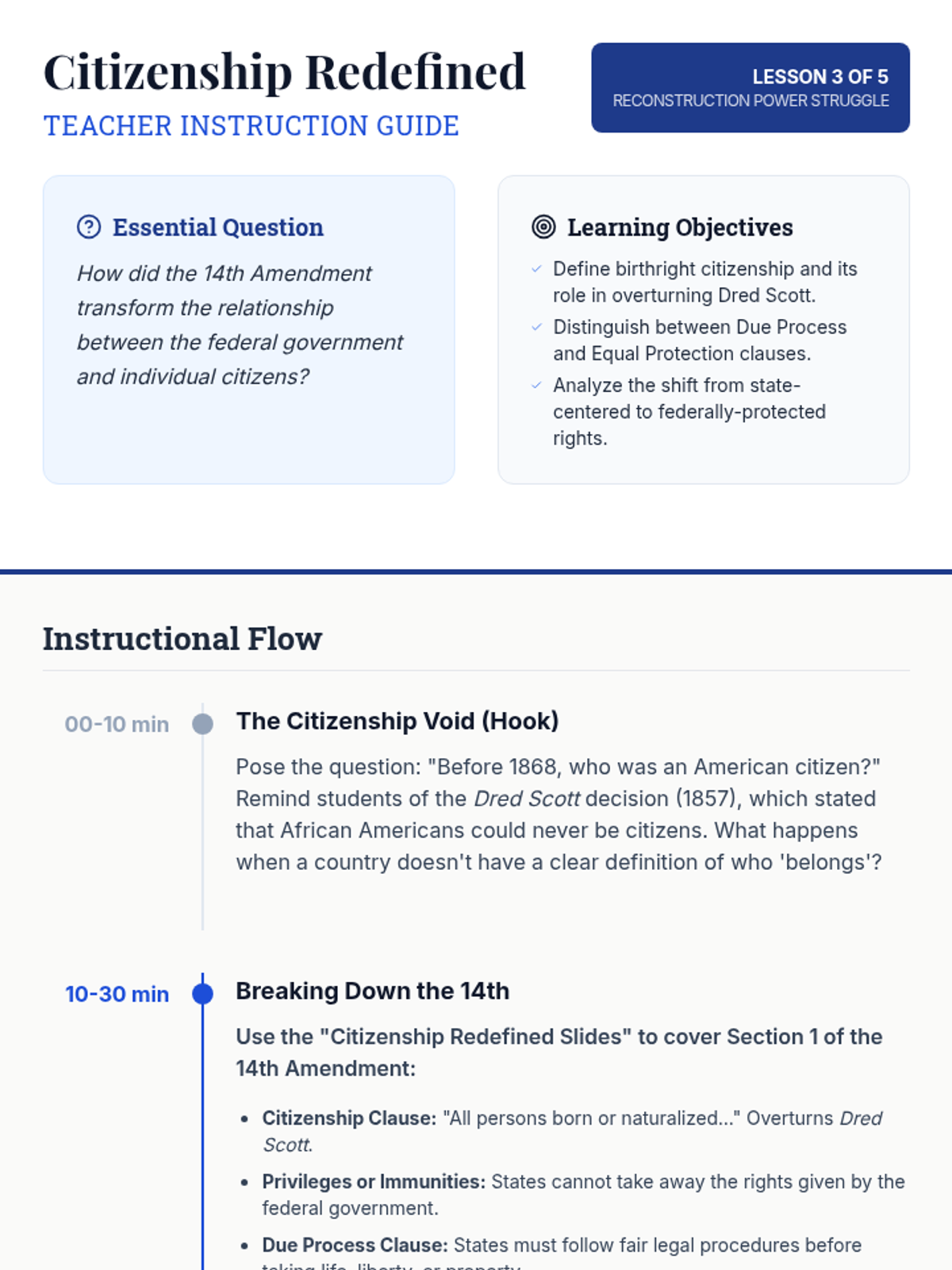 This sequence explores the legal and political battles of the Reconstruction era, focusing on the 13th, 14th, and 15th Amendments and the conflict between Presidential and Congressional authority. Students will analyze primary sources and evaluate the transformation of American citizenship.