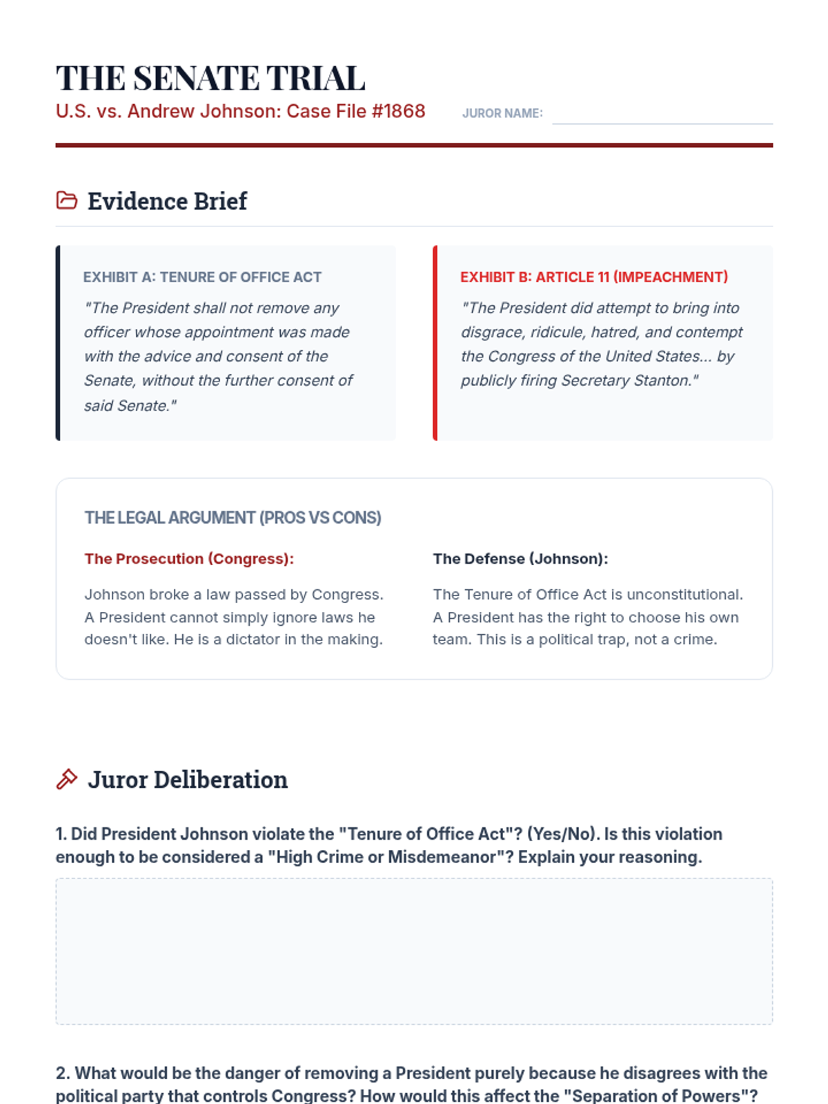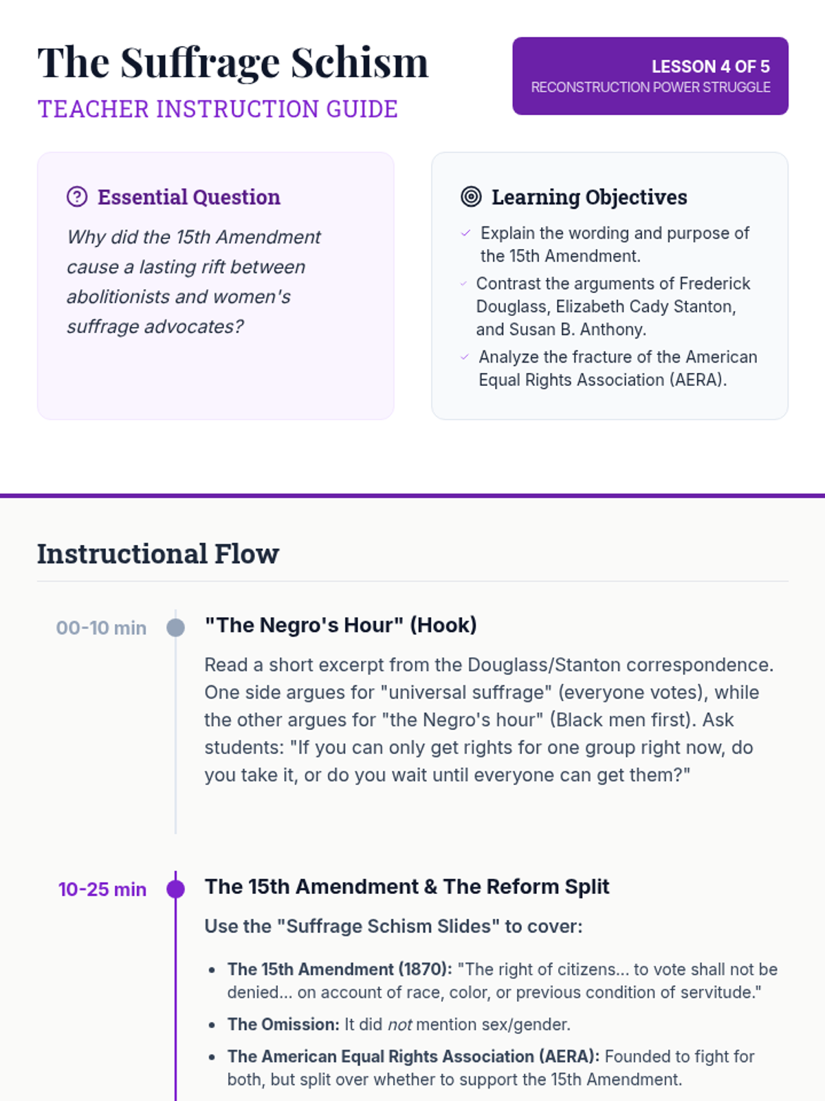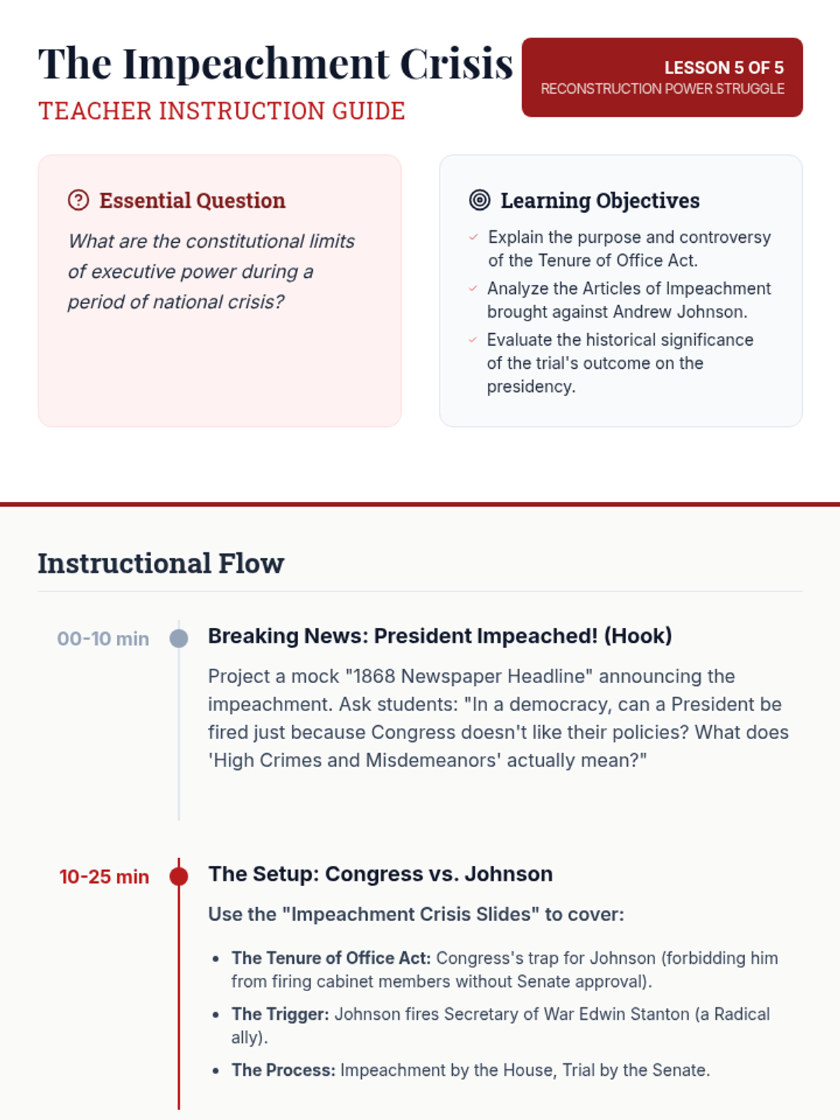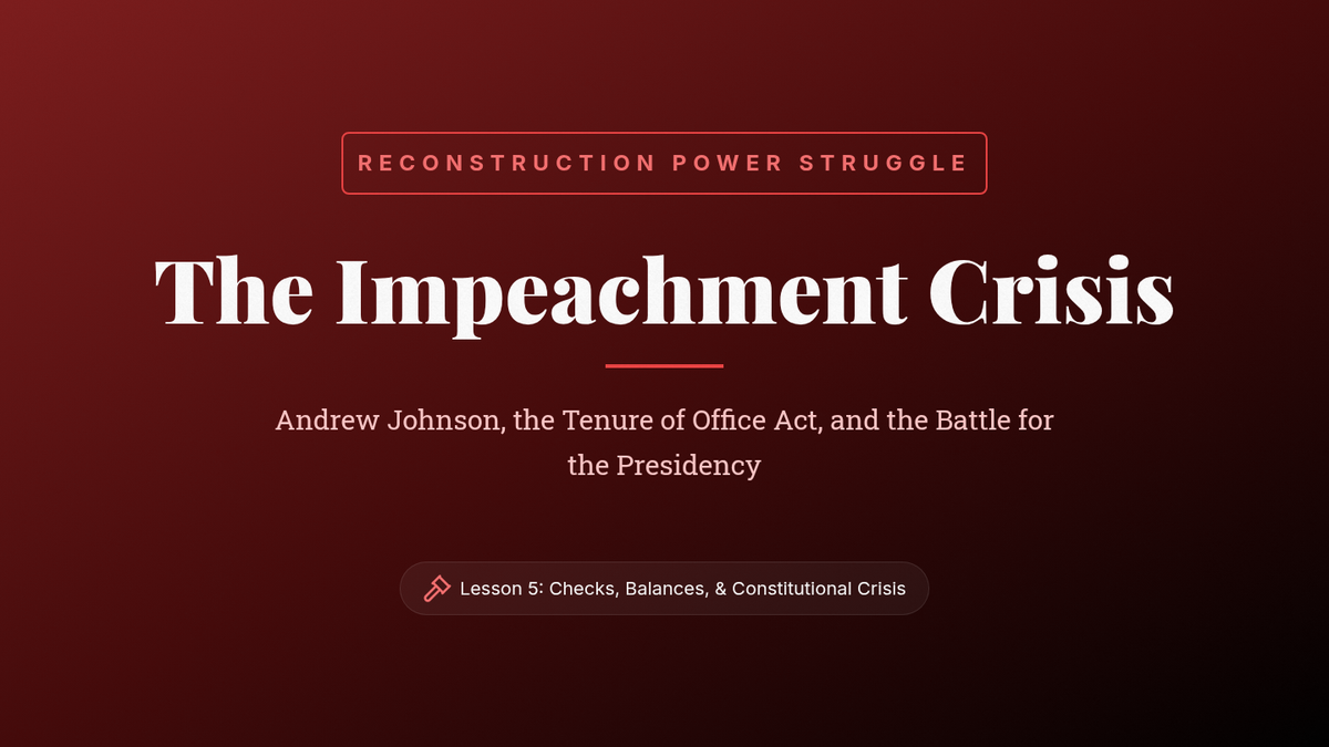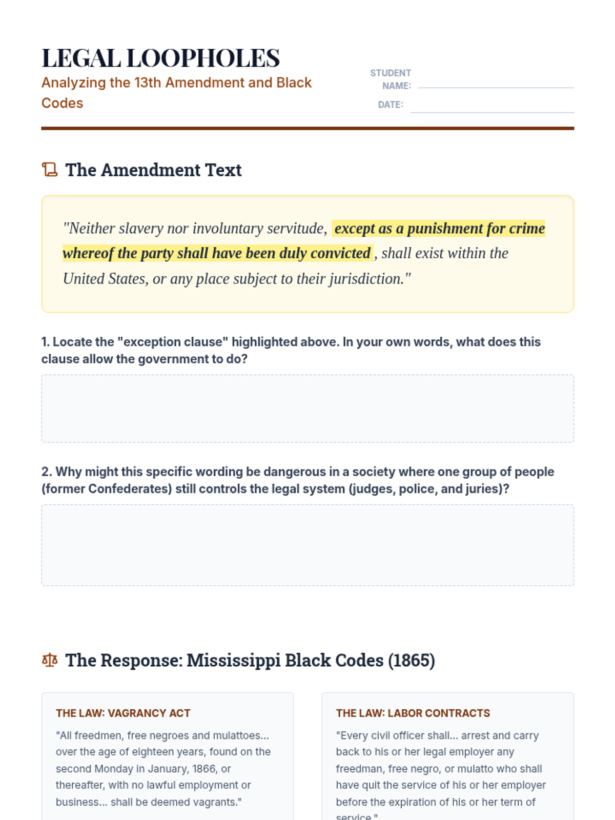 This sequence explores the legal and political battles of the Reconstruction era, focusing on the 13th, 14th, and 15th Amendments and the conflict between Presidential and Congressional authority. Students will analyze primary sources and evaluate the transformation of American citizenship.