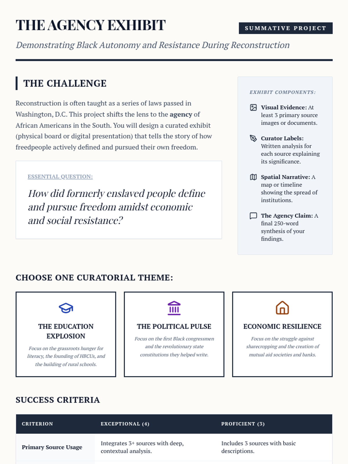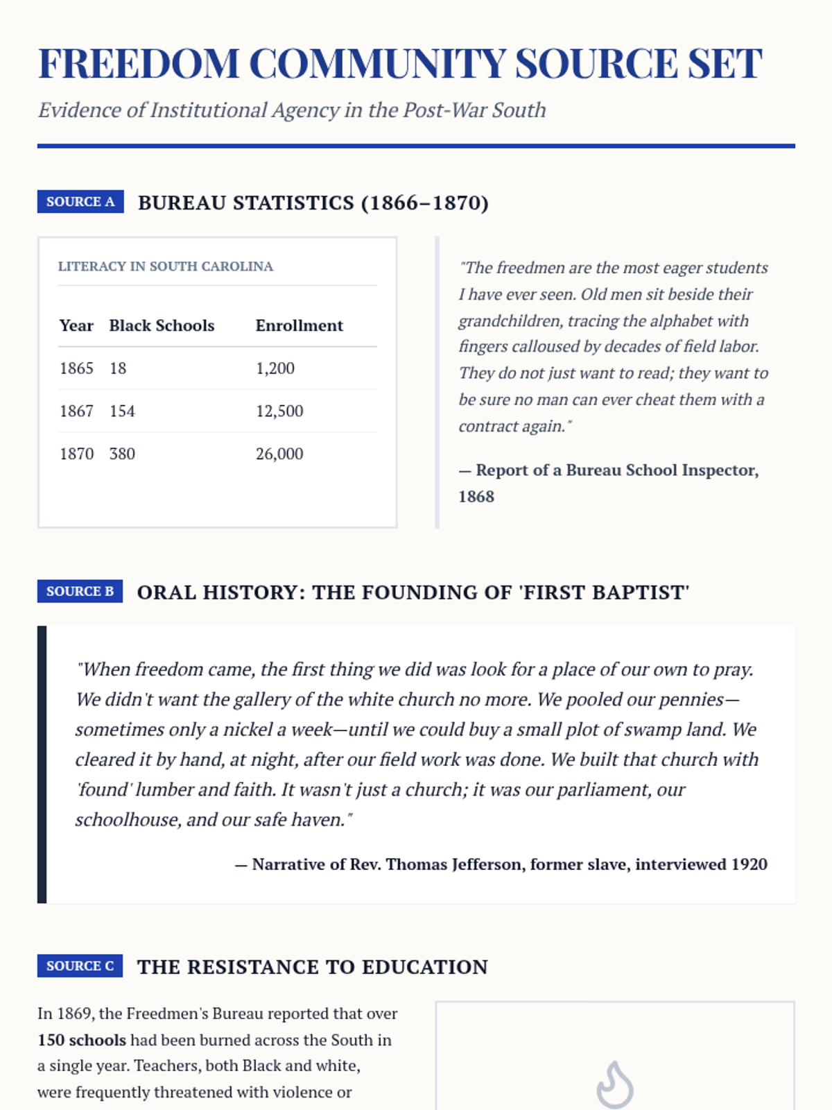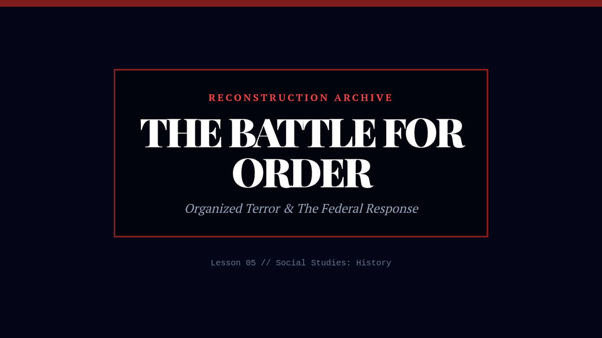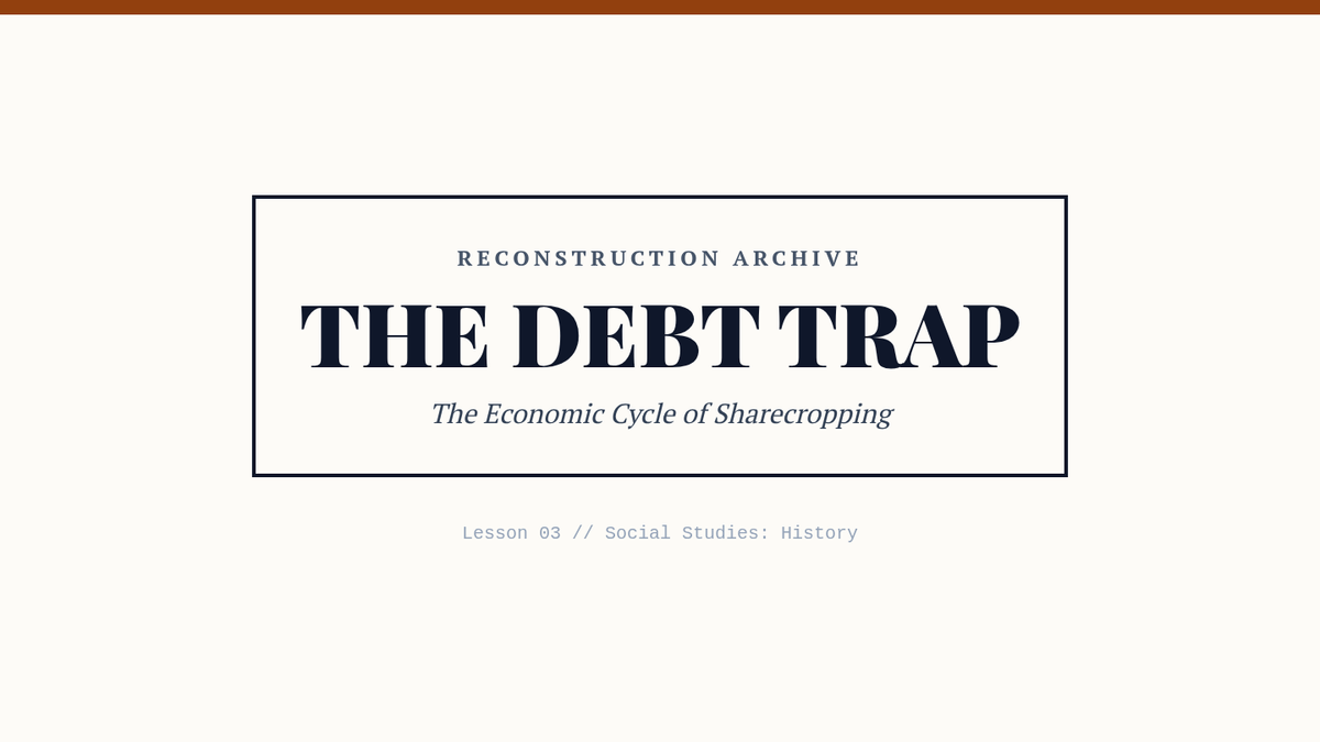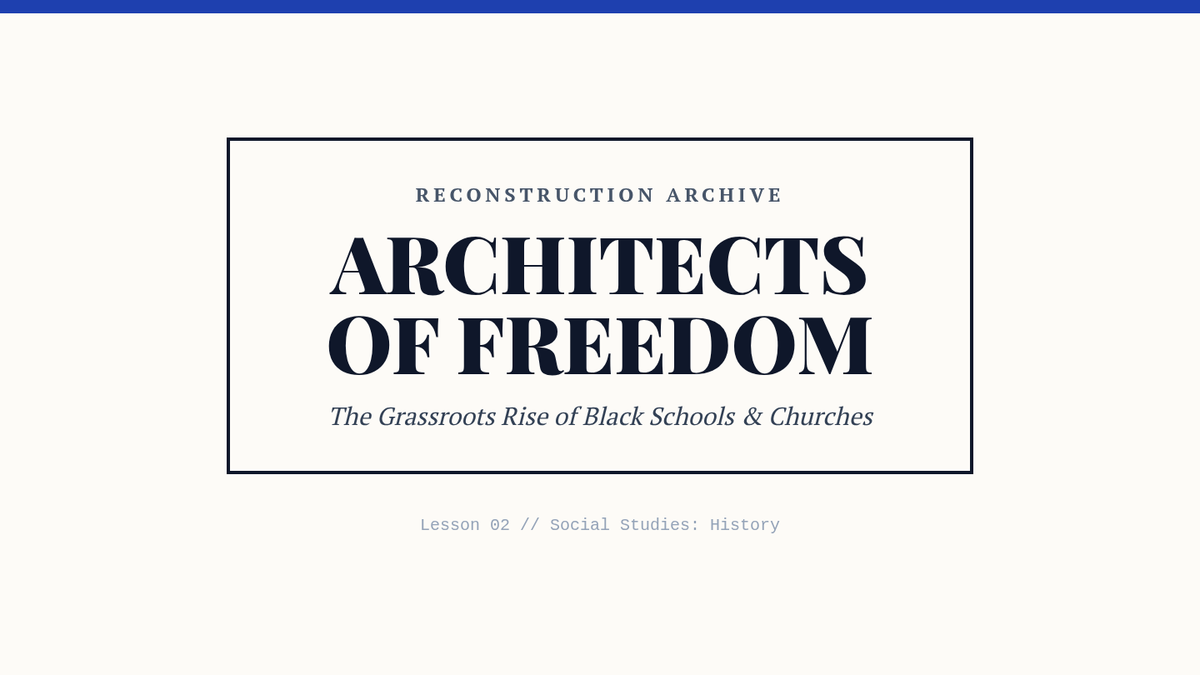 An 11th-grade history unit exploring Reconstruction through the lens of Black agency, institutional growth, and the economic and social barriers of the New South. Students investigate the Freedmen's Bureau, the rise of Black schools and churches, the trap of sharecropping, the first Black congressmen, and the violent resistance to progress.