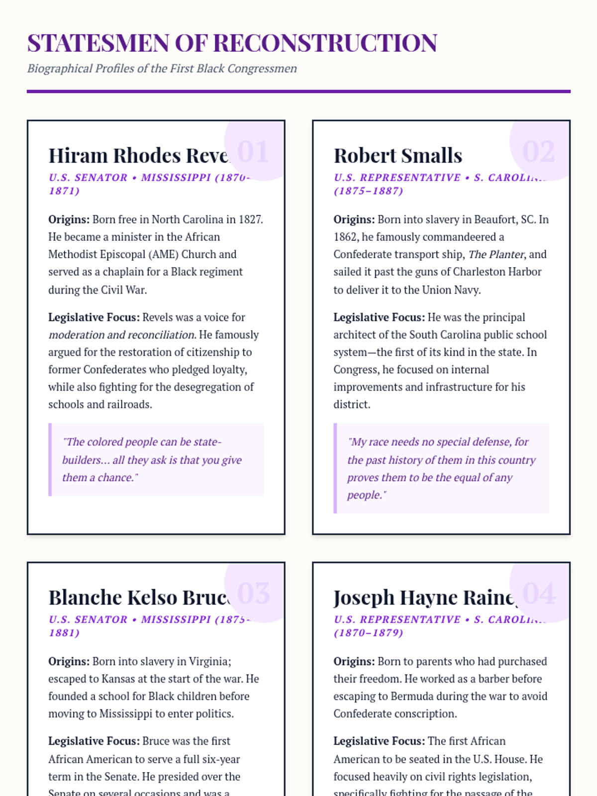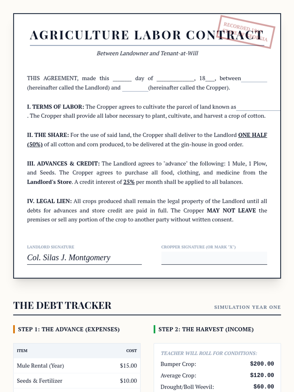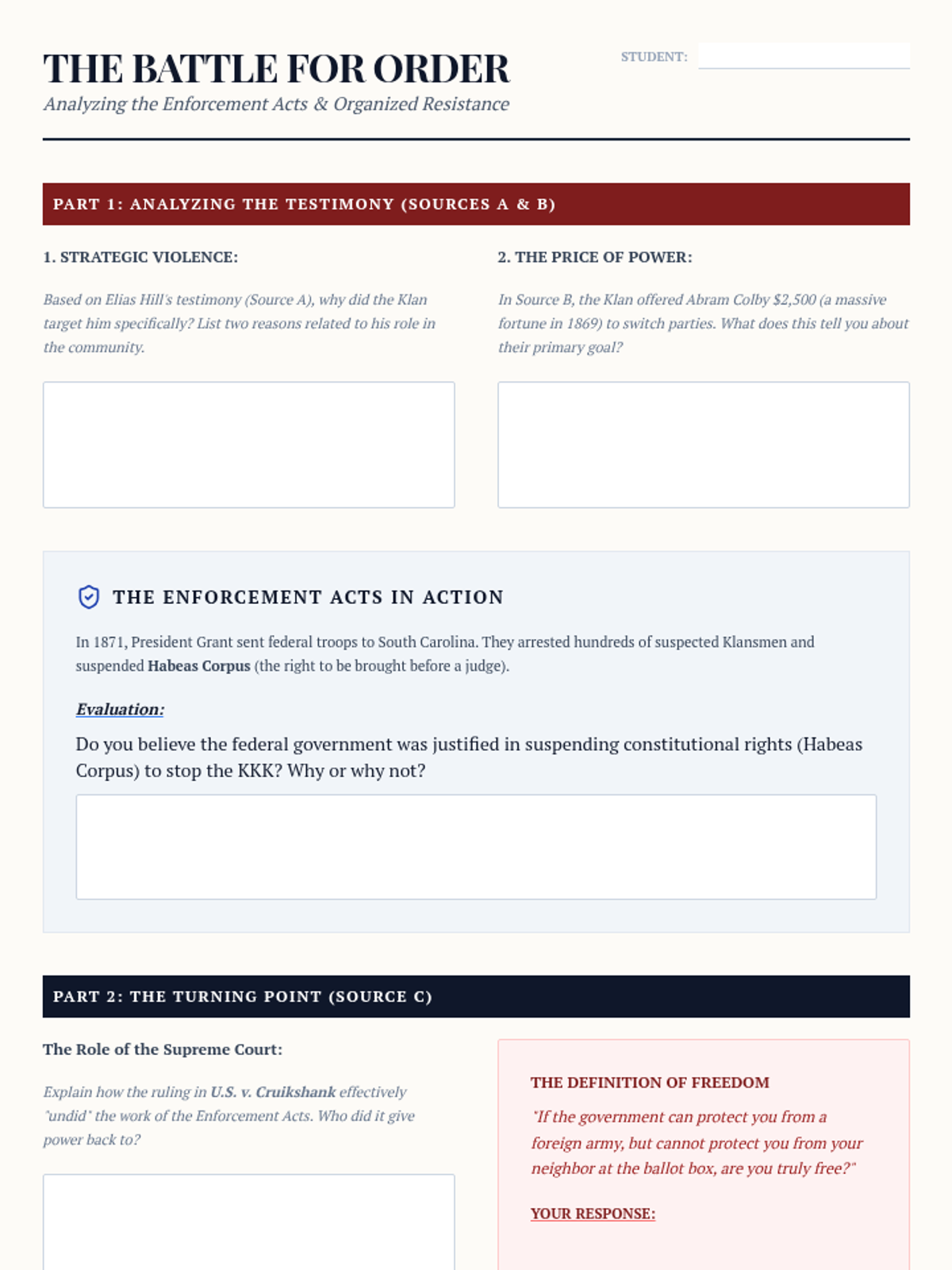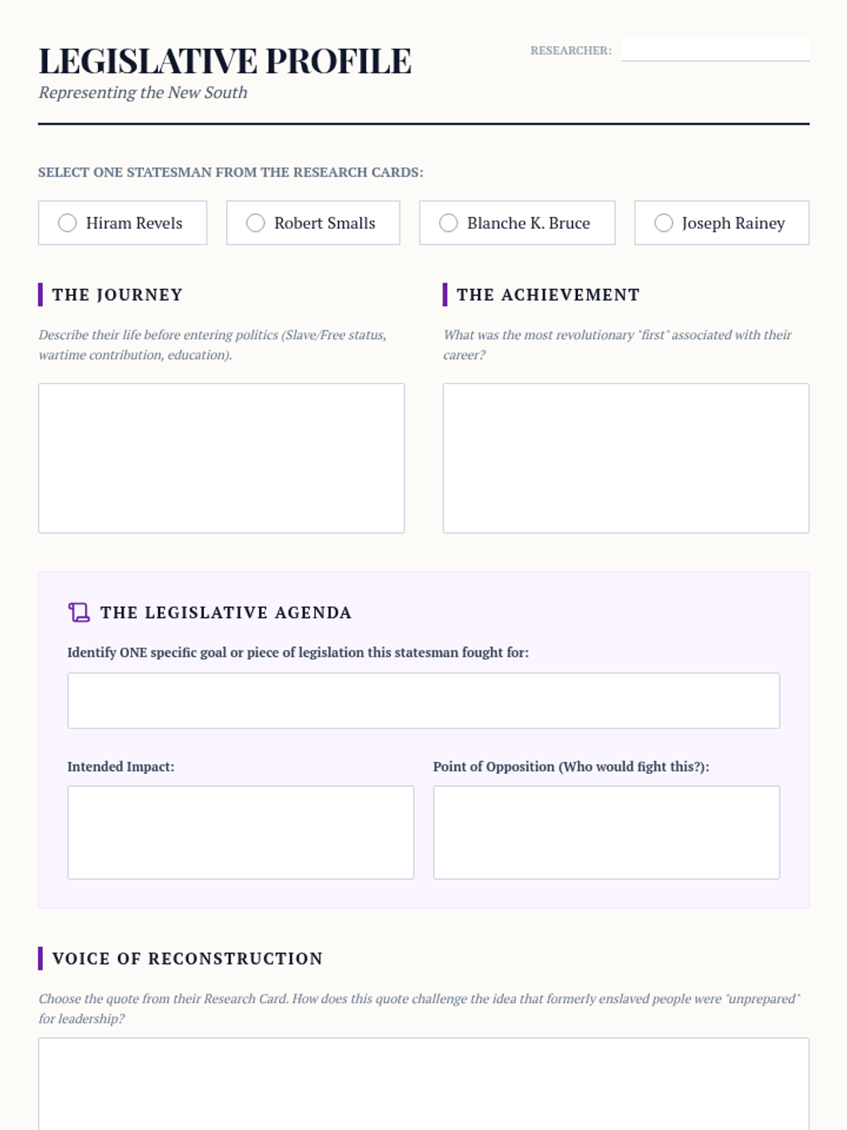 An 11th-grade history unit exploring Reconstruction through the lens of Black agency, institutional growth, and the economic and social barriers of the New South. Students investigate the Freedmen's Bureau, the rise of Black schools and churches, the trap of sharecropping, the first Black congressmen, and the violent resistance to progress.